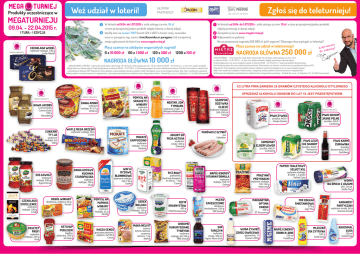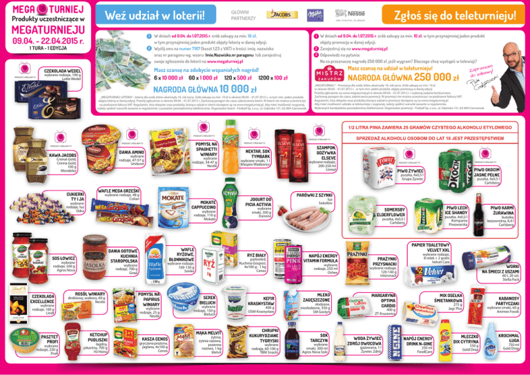 Produkty uczestniczące w MEGATURNIEJU Weź udział w loterii! 1 09.04. - 22.04.2015 r. 1 TURA - 1 EDYCJA 2 W dniach od 9.04. do 1.07.2015 r. zrób zakupy za min. 10 zł, w tym przynajmniej jeden produkt objęty loterią w danej edycji. Wyślij sms na numer 7187 (koszt 1,23 z VAT) o treści: imię, nazwisko oraz nr paragonu wg. wzoru: Imie.Nazwisko.nr paragonu lub zarejestruj swoje zgłoszenie do loterii na www.megaturniej.pl 1 2 3 Masz szansę na zdobycie wspaniałych nagród! 6 x 10 000 zł 60 x 1 000 zł 120 x 500 zł 1200 x 100 zł CZEKOLADA WEDEL PRODUKT Z REKLAMY TV Zgłoś się do teleturnieju! GŁÓWNI PARTNERZY wybrane rodzaje, 100 g Lotte Wedel W dniach od 9.04. do 1.07.2015 r. zrób zakupy za min. 10 zł, w tym przynajmniej jeden produkt objęty promocją w danej edycji. Zarejestruj się na www.megaturniej.pl Odpowiedz na pytania: Na co przeznaczę nagrodę 250 000 zł, jeśli wygram? Dlaczego chcę wystąpić w telewizji? aszam Masz szansę na udział w teleturnieju! Zapr awy! b a do z NAGRODA GŁÓWNA 250 000 zł NAGRODA GŁÓWNA 10 000 zł „MEGATURNIEJ LOTERIA” - loteria dla osób, które ukończyły 18. rok życia. Zrób zakupy za min. 10 zł w okresie 09.04. - 01.07.2015 r., w tym min. jeden produkt, objęty loterią w danej edycji. Prześlij zgłoszenie w okresie 09.04. - 01.07.2015 r. Zachowaj paragon do czasu zakończenia loterii. W loterii nie można uczestniczyć na podstawie faktury VAT. Regulamin, lista sklepów oraz produkty, biorące udział w loterii dostępne są na www.megaturniej.pl. Aby mieć możliwość wygranej, należy spełnić warunki zawarte w regulaminie. Laureatów powiadomimy telefonicznie. Organizator loterii - Fireball Sp. z o.o., ul. Gdyńska 131, 62-004 Czerwonak. „MEGATURNIEJ “ - Promocja dla osób, które ukończyły 18. rok życia. Zrób zakupy za min. 10 zł w okresie 09.04. - 01.07.2015 r. , w tym min. jeden produkt, objęty promocją w danej edycji. Prześlij zgłoszenie na www.megaturniej.pl w okresie 09.04. - 01.07.2015 r. i wykonaj zadanie konkursowe. Zachowaj paragon do czasu zakończenia promocji. W promocji nie można uczestniczyć na podstawie faktury VAT. Regulamin, lista sklepów oraz produkty biorące udział w promocji dostępne są na www.megaturniej.pl. Aby mieć możliwość udziału w teleturnieju i wygranej, należy spełnić warunki zawarte w regulaminie. Wybranych kandydatów powiadomimy telefonicznie. Organizator promocji - Fireball Sp. z o.o., ul. Gdyńska 131, 62-004 Czerwonak. 1/2 LITRA PIWA ZAWIERA 25 GRAMÓW CZYSTEGO ALKOHOLU ETYLOWEGO PRODUKT Z REKLAMY TV PRODUKT Z REKLAMY TV POMYSŁ NA SPAGHETTI WINIARY PRODUKT Z REKLAMY TV PRODUKT Z REKLAMY TV DANIA AMINO KAWA JACOBS wybrane rodzaje, 47-57 g Unilever Cronat Gold, Crema Gold, 100 g Mondelez wybrane rodzaje, 34-47 g Nestle wybrane rodzaje, 48 g Colian MOKATE CAPPUCCINO wybrane rodzaje, 110 g Mokate wybrane rodzaje, 500 g Agros Nova wybrane rodzaje, 250 g Profi WAFLE RYŻOWE, BŁONNIKOWE DANIA GOTOWE KUCHNIA STAROPOLSKA SOS ŁOWICZ PASZTET PROFI wybrane smaki, 1 l Maspex Wadowice WAFLE MEGA GRZEŚKI wybrane rodzaje, luz Odra wybrane rodzaje, 100 g Lindt NEKTAR, SOK TYMBARK SZAMPON, ODŻYWKA ELSEVE wybrane rodzaje, 200-250 ml L’oreal PRODUKT Z REKLAMY TV PRODUKT Z REKLAMY TV PIWO OKOCIM JASNE PEŁNE PIWO ŻYWIEC puszka, 4x0,5 l Grupa Żywiec CUKIERKI TY I JA CZEKOLADA EXCELLENCE SPRZEDAŻ ALKOHOLU OSOBOM DO LAT 18 JEST PRZESTĘPSTWEM PRODUKT Z REKLAMY TV ROSÓŁ WINIARY drobiowy, wołowy, 60 g Nestle POMYSŁ NA PAPIRUS WINIARY wybrane rodzaje, 25 g Nestle KETCHUP PUDLISZKI łagdny, pikantny, 700 g HJ Heinz parboiled, Kuchnia Gosposi, 4x100 g - 1 kg Cenos SEREK BIELUCH wybrane rodzaje, 150 g Bieluch MĄKA MELVIT KASZA CENOS gryczana prażona, jaglana, 4x100 g Cenos żytnia, żytnia razowa, pszenna razowa, 1 kg Melvit PARÓWKI Z SZYNKI luz Sokołów wybrane smaki, 300 g Danone RYŻ BIAŁY wybrane rodzaje, 100-130 g Sonko wybrane rodzaje, 700 g Graal JOGURT DO PICIA ACTIVIA KEFIR KRASNYSTAW 400 g OSM Krasnystaw CHRUPKI KUKURYDZIANE TYGRYSKI wybrane rodzaje, 60-100 g TBM Snacks puszka, 4x0,5 l Carlsberg PIWO LECH ICE SHANDY SOMERSBY ELDERFLOWER puszka, 4x0,5 l Kompania Piwowarska puszka, 4x0,5 l Carlsberg PIWO KARMI ŻURAWINA butelka bezzwrotna, 0,4 l Carlsberg PAPIER TOALETOWY VELVET XXL NAPÓJ ENERGY VITAMIN FORMULA wybrane rodzaje, 250 ml Oshee MLEKO ZAGĘSZCZONE słodzone, niesłodzone, 350 g SM Gostyń SOK TARCZYN wybrane smaki, 300 ml Agros Nova Soki PRAŻYNKI PRZYSNACKI wybrane rodzaje, 8 rolek + 2 gratis Velvet Care WORKI NA ŚMIECI Z USZAMI wybrane rodzaje, 120-140 g Intersnack 60 l, 20 szt. Stella Pack MIX OSEŁKA ŚMIETANKOWA MARGARYNA OPTIMA CARDIO 400 g ZT Kruszwica WODA ŻYWIEC ZDRÓJ OWOCOWA gazowana, 1 l Żywiec Zdrój KABANOSY PARTYCZAKI 275 g Jagr Plus NAPÓJ ENERGY DRINK N-GINE 250 ml FoodCare wybrane smaki, 60 g Animex Foods MLECZKO DIX CYTRYNA 550 g Gold Drop KROCHMAL ŁUGA 750 ml Gold Drop Weź udział w loterii! Produkty uczestniczące w MEGATURNIEJU 1 TURA - 2 EDYCJA PRODUKT Z REKLAMY TV W dniach od 9.04. do 1.07.2015 r. zrób zakupy za min. 10 zł, w tym przynajmniej jeden produkt objęty loterią w danej edycji. Wyślij sms na numer 7187 (koszt 1,23 z VAT) o treści: imię, nazwisko oraz nr paragonu wg. wzoru: Imie.Nazwisko.nr paragonu lub zarejestruj swoje zgłoszenie do loterii na www.megaturniej.pl 1 23.04. - 06.05.2015 r. Zgłoś się do teleturnieju! GŁÓWNI PARTNERZY 2 1 2 3 Masz szansę na zdobycie wspaniałych nagród! 6 x 10 000 zł 60 x 1 000 zł 120 x 500 zł 1200 x 100 zł CIASTKA DELICJE SZAMPAŃSKIE wybrane rodzaje, 147 g Mondelez W dniach od 9.04. do 1.07.2015 r. zrób zakupy za min. 10 zł, w tym przynajmniej jeden produkt objęty promocją w danej edycji. Zarejestruj się na www.megaturniej.pl Odpowiedz na pytania: Na co przeznaczę nagrodę 250 000 zł, jeśli wygram? Dlaczego chcę wystąpić w telewizji? aszam Masz szansę na udział w teleturnieju! Zapr awy! b a do z NAGRODA GŁÓWNA 250 000 zł NAGRODA GŁÓWNA 