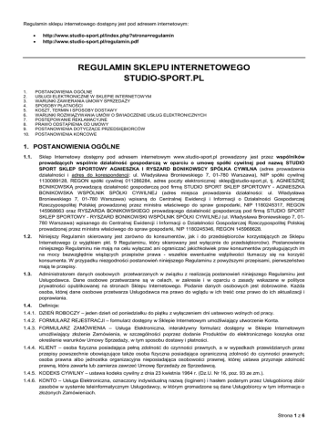 Regulamin sklepu internetowego dostępny jest pod adresem internetowym: http://www.studio-sport.pl/index.php?strona=regulamin http://www.studio-sport.pl/regulamin.pdf REGULAMIN SKLEPU INTERNETOWEGO STUDIO-SPORT.PL 1. 2. 3. 4. 5. 6. 7. 8. 9. 10. POSTANOWIENIA OGÓLNE USŁUGI ELEKTRONICZNE W SKLEPIE INTERNETOWYM WARUNKI ZAWIERANIA UMOWY SPRZEDAŻY SPOSOBY PŁATNOŚCI KOSZT, TERMIN I SPOSOBY DOSTAWY WARUNKI ROZWIĄZYWANIA UMÓW O ŚWIADCZENIE USŁUG ELEKTRONICZNYCH POSTĘPOWANIE REKLAMACYJNE PRAWO ODSTĄPIENIA OD UMOWY POSTANOWIENIA DOTYCZĄCE PRZEDSIĘBIORCÓW POSTANOWIENIA KOŃCOWE 1. POSTANOWIENIA OGÓLNE 1.1. Sklep Internetowy dostępny pod adresem internetowym www.studio-sport.pl prowadzony jest przez wspólników prowadzących wspólnie działalność gospodarczą w oparciu o umowę spółki cywilnej pod nazwą STUDIO SPORT SKLEP SPORTOWY AGNIESZKA I RYSZARD BONIKOWSCY SPÓŁKA CYWILNA (adres prowadzenia działalności i adres do korespondencji: ul. Władysława Broniewskiego 7, 01-780 Warszawa), NIP spółki cywilnej 1130089128, REGON spółki cywilnej 011286284, adres poczty elektronicznej: [email protected], tj. AGNIESZKĘ BONIKOWSKĄ prowadzącą działalność gospodarczą pod firmą STUDIO SPORT SKLEP SPORTOWY - AGNIESZKA BONIKOWSKA WSPÓLNIK SPÓŁKI CYWILNEJ (adres miejsca prowadzenia działalności: ul. Władysława Broniewskiego 7, 01-780 Warszawa) wpisaną do Centralnej Ewidencji i Informacji o Działalności Gospodarczej Rzeczypospolitej Polskiej prowadzonej przez ministra właściwego do spraw gospodarki, NIP 1180245317, REGON 145968663 oraz RYSZARDA BONIKOWSKIEGO prowadzącego działalność gospodarczą pod firmą STUDIO SPORT SKLEP SPORTOWY - RYSZARD BONIKOWSKI WSPÓLNIK SPÓŁKI CYWILNEJ (ul. Władysława Broniewskiego 7, 01780 Warszawa) wpisanego do Centralnej Ewidencji i Informacji o Działalności Gospodarczej Rzeczypospolitej Polskiej prowadzonej przez ministra właściwego do spraw gospodarki, NIP 1180245346, REGON 145968628. 1.2. Niniejszy Regulamin skierowany jest zarówno do konsumentów, jak i do przedsiębiorców korzystających ze Sklepu Internetowego (z wyjątkiem pkt. 9 Regulaminu, który skierowany jest wyłącznie do przedsiębiorców). Postanowienia niniejszego Regulaminu nie mają na celu wyłączać ani ograniczać jakichkolwiek praw konsumentów przysługujących im na mocy bezwzględnie wiążących przepisów prawa - wszelkie ewentualne wątpliwości tłumaczy się na korzyść konsumenta. W przypadku niezgodności postanowień niniejszego Regulaminu z powyższymi przepisami, pierwszeństwo mają te przepisy. 1.3. Administratorem danych osobowych przetwarzanych w związku z realizacją postanowień niniejszego Regulaminu jest Usługodawca. Dane osobowe przetwarzane są w celach, w zakresie i w oparciu o zasady wskazane w polityce prywatności opublikowanej na stronach Sklepu Internetowego. Podanie danych osobowych jest dobrowolne. Każda osoba, której dane osobowe przetwarza Usługodawca ma prawo do wglądu w ich treść oraz prawo do ich aktualizacji i poprawiania. 1.4. Definicje: 1.4.1. DZIEŃ ROBOCZY – jeden dzień od poniedziałku do piątku z wyłączeniem dni ustawowo wolnych od pracy. 1.4.2. FORMULARZ REJESTRACJI – formularz dostępny w Sklepie Internetowym umożliwiający utworzenie Konta. 1.4.3. FORMULARZ ZAMÓWIENIA – Usługa Elektroniczna, interaktywny formularz dostępny w Sklepie Internetowym umożliwiający złożenie Zamówienia, w szczególności poprzez dodanie Produktów do elektronicznego koszyka oraz określenie warunków Umowy Sprzedaży, w tym sposobu dostawy i płatności. 1.4.4. KLIENT – osoba fizyczna posiadająca pełną zdolność do czynności prawnych, a w wypadkach przewidzianych przez przepisy powszechnie obowiązujące także osoba fizyczna posiadająca ograniczoną zdolność do czynności prawnych; osoba prawna albo jednostka organizacyjna nieposiadająca osobowości prawnej, której ustawa przyznaje zdolność prawną, która zawarła lub zamierza zawrzeć Umowę Sprzedaży ze Sprzedawcą. 1.4.5. KODEKS CYWILNY – ustawa kodeks cywilny z dnia 23 kwietnia 1964 r. (Dz.U. Nr 16, poz. 93 ze zm.). 1.4.6. KONTO – Usługa Elektroniczna, oznaczony indywidualną nazwą (loginem) i hasłem podanym przez Usługobiorcę zbiór zasobów w systemie teleinformatycznym Usługodawcy, w którym gromadzone są dane Usługobiorcy w tym informacje o złożonych Zamówieniach. Strona 1 z 6 1.4.7. NEWSLETTER – Usługa Elektroniczna, elektroniczna usługa dystrybucyjna świadczona przez Usługodawcę za pośrednictwem poczty elektronicznej e-mail, która umożliwia wszystkim korzystającym z niej Usługobiorcom automatyczne otrzymywanie treści kolejnych edycji newslettera zawierającego informacje o Produktach w Sklepie Internetowym. 1.4.8. PRODUKT – dostępna w Sklepie Internetowym rzecz ruchoma będąca przedmiotem Umowy Sprzedaży między Klientem a Sprzedawcą. 1.4.9. REGULAMIN – niniejszy regulamin Sklepu Internetowego. 1.4.10. SKLEP INTERNETOWY - Sklep Internetowy Usługodawcy dostępny pod adresem internetowym: www.studio-sport.pl. 1.4.11. SPRZEDAWCA; USŁUGODAWCA – wspólnicy prowadzący wspólnie działalność gospodarczą w oparciu o umowę spółki cywilnej pod nazwą STUDIO SPORT SKLEP SPORTOWY AGNIESZKA I RYSZARD BONIKOWSCY SPÓŁKA CYWILNA (adres prowadzenia działalności i adres do korespondencji: ul. Władysława Broniewskiego 7, 01780 Warszawa), NIP spółki cywilnej 1130089128, REGON spółki cywilnej 011286284, adres poczty elektronicznej: [email protected], tj. AGNIESZKA BONIKOWSKA prowadząca działalność gospodarczą pod firmą STUDIO SPORT SKLEP SPORTOWY - AGNIESZKA BONIKOWSKA WSPÓLNIK SPÓŁKI CYWILNEJ (adres miejsca prowadzenia działalności: ul. Władysława Broniewskiego 7, 01-780 Warszawa) wpisana do Centralnej Ewidencji i Informacji o Działalności Gospodarczej Rzeczypospolitej Polskiej prowadzonej przez ministra właściwego do spraw gospodarki, NIP 1180245317, REGON 145968663 or