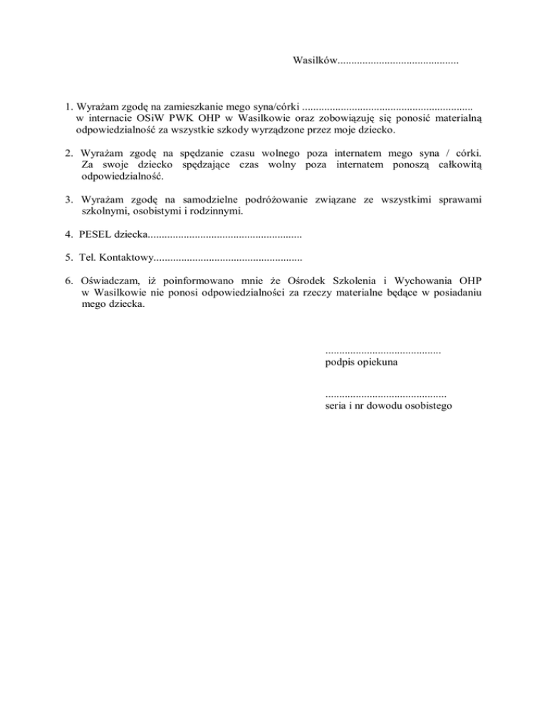 Wasilków............................................ 1. Wyrażam zgodę na zamieszkanie mego syna/córki .............................................................. w internacie OSiW PWK OHP w Wasilkowie oraz zobowiązuję się ponosić materialną odpowiedzialność za wszystkie szkody wyrządzone przez moje dziecko. 2. Wyrażam zgodę na spędzanie czasu wolnego poza internatem mego syna / córki. Za swoje dziecko spędzające czas wolny poza internatem ponoszą całkowitą odpowiedzialność. 3. Wyrażam zgodę na samodzielne podróżowanie związane ze wszystkimi sprawami szkolnymi, osobistymi i rodzinnymi. 4. PESEL dziecka........................................................ 5. Tel. Kontaktowy...................................................... 6. Oświadczam, iż poinformowano mnie że Ośrodek Szkolenia i Wychowania OHP w Wasilkowie nie ponosi odpowiedzialności za rzeczy materialne będące w posiadaniu mego dziecka. .......................................... podpis opiekuna ............................................ seria i nr dowodu osobistego