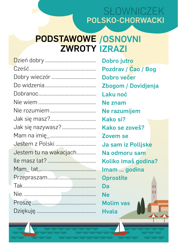 SŁOWNICZEK POLSKO-CHORWACKI PODSTAWOWE /OSNOVNI ZWROTY IZRAZI Dzień dobry........................................ Cześć.................................................... Dobry wieczór................................... Do widzenia........................................ Dobranoc............................................. Nie wiem............................................. Nie rozumiem.................................... Jak się masz?.................................... Jak się nazywasz?........................... Mam na imię_.................................... Jestem z Polski................................ Jestem tu na wakacjach............... Ile masz lat?...................................... Mam_ lat............................................. Przepraszam...................................... Tak......................................................... Nie......................................................... Proszę.................................................. Dziękuję............................................... Dobro jutro Pozdrav / Ćao / Bog Dobro večer Zbogom / Dovidjenja Laku noć Ne znam Ne razumijem Kako si? Kako se zoveš? Zovem se Ja sam iz Polljske Na odmoru sam Koliko imaš godina? Imam ... godina Oprostite Da Ne Molim vas Hvala ZAKUPY /KUPOVINA Ile to kosztuje?.......................... Poproszę_................................... Wezmę to.................................... Koliko košta? Molim Vas... Uzeću to Czy dostanę tu produkty niskobiałkowe?....... Dali imate proizvode niskoproteinske? Chleb niskobiałkowy............... Warzywa...................................... Owoce.......................................... Kruh niskoproteinski Povrće Voće 1 2 3 4 5 6 7 jedan dva tri četiri pet šest sedam 8 9 10 20 50 100 200 osam devet deset dvadeset pedeset sto dvjesta ZWIEDZANIE /TURISTIČKI OBILAZAK Przepraszam, Oprostite, jak dojadę/dojdę do_?............. kako mogu doći do….? Zgubiłam/-em się..................... Izgubio/ izgubila sam se Czy może Pan/Pani pokazać Možete li mi pokazati gdje mi, gdzie to jest na mapie?... se to nalazi na karti? Poproszę bilet normalny....... Molim vas dajte mi..., jednu jednokratnu kartu jednorazowy/czasowy lub dnevnu kartu /dobowy Gdzie jest _?.............................. toaleta......................................... bank/kantor................................ przystanek autobusowy......... przystanek tramwajowy........ stacja metra............................... lotnisko........................................ dworzec....................................... biuro informacji turystycznej.. Gdje je…? WC banka/mjenjačnica autobusni kolodvor tramvaj metro postaja zračna luka kolodvor turistički biro Prawa......... Desno Wejście................... Ulaz Lewa........... Lijevo Wyjście................... Izlaz Prosto......... Pravo Cofnij się/zawróć Vrati se /okrenuti se U LEKARZA /KOD LIJEČNIKA Jestem chory Bolestan/bolesna na fenyloketonurię................... sam na fenilketonuriju Moje dziecko jest chore Moje dijete je bolesno na fenyloketonurię................... na fenilketonuriju Skończył mi się Potrošio mi se preparat PKU............................. lijek PKU Potrzebuję recepty Potreban mi je recept na preparat PKU....................... za lijek/proizvod PKU Mam gorączkę........................... Imam temperaturu Boli mnie brzuch....................... Boli me stomak Mam kaszel................................ Kašljem Mam biegunkę........................... Imam proliv Wymioty...................................... Povraćanje Kręci mi się w głowie.............. Vrti mi se u glavi
