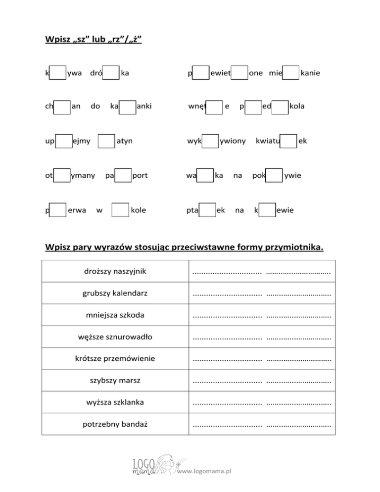 Wpisz „sz” lub „rz”/„ż” k ywa dró ch an up ejmy ot ymany p do erwa ka p ka anki atyn pa w ewiet wnęt wyk e one mie p ywiony ed kanie kola kwiatu port wa ka na pok kole pta ek na k ek ywie ewie Wpisz pary wyrazów stosując przeciwstawne formy przymiotnika. droższy naszyjnik ............................... ……..…...…………….. grubszy kalendarz ............................... ……..…...…………….. mniejsza szkoda ............................... ……..…...…………….. węższe sznurowadło ............................... ……..…...…………….. krótsze przemówienie ............................... ……..…...…………….. szybszy marsz ............................... ……..…...…………….. wyższa szklanka ............................... ……..…...…………….. potrzebny bandaż ............................... ……..…...…………….. www.logomama.pl