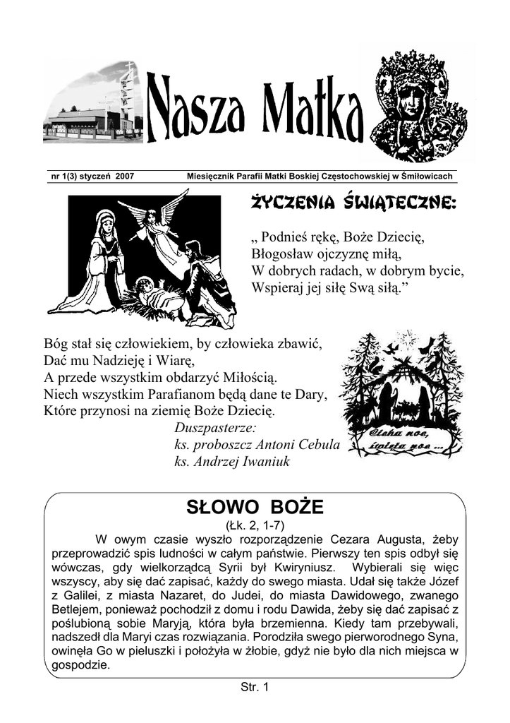 nr 1(3) styczeń 2007 Miesięcznik Parafii Matki Boskiej Częstochowskiej w Śmiłowicach śyczenia świąteczne: „ Podnieś rękę, BoŜe Dziecię, Błogosław ojczyznę miłą, W dobrych radach, w dobrym bycie, Wspieraj jej siłę Swą siłą.” Bóg stał się człowiekiem, by człowieka zbawić, Dać mu Nadzieję i Wiarę, A przede wszystkim obdarzyć Miłością. Niech wszystkim Parafianom będą dane te Dary, Które przynosi na ziemię BoŜe Dziecię. Duszpasterze: ks. proboszcz Antoni Cebula ks. Andrzej Iwaniuk SŁOWO BOśE (Łk. 2, 1-7) W owym czasie wyszło rozporządzenie Cezara Augusta, Ŝeby przeprowadzić spis ludności w całym państwie. Pierwszy ten spis odbył się wówczas, gdy wielkorządcą Syrii był Kwiryniusz. Wybierali się więc wszyscy, aby się dać zapisać, kaŜdy do swego miasta. Udał się takŜe Józef z Galilei, z miasta Nazaret, do Judei, do miasta Dawidowego, zwanego Betlejem, poniewaŜ pochodził z domu i rodu Dawida, Ŝeby się dać zapisać z poślubioną sobie Maryją, która była brzemienna. Kiedy tam przebywali, nadszedł dla Maryi czas rozwiązania. Porodziła swego pierworodnego Syna, owinęła Go w pieluszki i połoŜyła w Ŝłobie, gdyŜ nie było dla nich miejsca w gospodzie. Str. 1 PLAN KOLĘDY 2007 02.01 wtorek ul. Kawalca /domki/ - 15.30 03.01 środa ul. Kawalca /prawa strona/ - 15.30 04.01 czwartek ul. Kawalca /lewa strona/ - 15.30 05.01 piątek ul. Jesionowa – 15.30 06.01 sobota ul. Łączna – 14.30 07.01 niedziela ul. Kawalca /bloki/ - 14.30 08.01 poniedziałek Leśniczówka, ul, Zgody i część ul. Gliwickiej do rodz. Gierlotka –15.30 09.01 wtorek ul. Gliwicka /od rodz. Szczepanek do rodz. Gracka/ – 15.30 10.01 środa ul. Gliwicka /od Sjesty w stronę Mikołowa/ - 15.30 11.01 czwartek ul. Jarzębinowa – 15.30 12.01 piątek ul. Elsnera – 15.30 13.01 sobota Reta Śmiłowicka /Leśniczówki i domy od strony Kamionki/ - 14.30 14.01 niedziela Reta Śmiłowicka /do rodz. Kołodziej/ - 14.30 15.01 poniedziałek ul. Bukowa i Cisów – 15.30 Kolęda dodatkowa ustalana indywidualnie Str. 2 Trzy Króle (według Ewangelii św. Mateusza, rozdział 2) Downo, downo tymu, jak sie jeszcze Ponboczek niy urodzioł w Betlejym, to było poru proroków, kerzy zapowiadali jego przyjście. Godało sie wtedy, Ŝe przidzie na świat Mesyjosz, kery zbawi cołki świat. Dlo przikłodu prorok Izajasz tak prorokowoł: BestoŜ Ponboczek do wom znak: Panienka pocznie a urodzi Synka i zamianuje go Emmanuel, czyli Ponboczek z nami! I godoł tyŜ: A dyć Dziycia nom sie narodziyło i momy juŜ synka. Na swoich barach dźwigoł bydzie cołki świat i bydom mu godać: Mocny Ponboczek... Proroctwa te powstowały miyndzy śydami, ale niy yno. Były tyŜ proroki w cudzych krajach, kerzy tak samo czekali na Mesyjosza i jego zbawiynie. Kędy prziszoł juŜ czas i narodzioł sie Ponboczek w Betlejym, to na niebie pokozała sie gwiozdka, nazwano potym gwiozdką betlejymską. A gwiozdka ta uwidziały na niebie Trzy Króle ze Wschoda. BestoŜ drapko spakowali sie, wsiedli na kamele i ruszyli. Szli za gwiozdką, przeszli cołko pustynio i trefiyli do Ziymie Świyntyj, do Betlejym. Tam zaś znodli ta betlyjka z nowonarodzonym Ponboczkiym, z jego mamulką Maryjką i łojcym Zefkiym. Trzy Króle wleźli dopojszczodka betlyjki, poklynkali przy Ŝłobku i łoddali Ponboczkowi pokłony. Potym otwarli tasze i napoczyni wykłodać z nich prezynty. Wtedy dali Ponboczkowi złoto, kadzidło i mirra. I byli fest szczynśliwi, Ŝe trefiyli Mesyjosza i potym poszli nazod do swoich królestw, połosprowiać wszyjskim jakie cuda uwidzieli w betlyjce. Niykerzy godają, Ŝe te Trzi Króle nazywali sie: Kacpyr, Melchior i Baltazar. Trzy Króle ze Wschoda szli za gwiozdką, kero zakludziyła ich do Ziymie Świyntyj, do Betlejym. Tam zaś znodli ta betlyjka z nowonarodzonym Ponboczkiym, z jego mamulką Maryjką i łojcym Zefkiym. Trzy Króle wleźli dopojszczodka betlyjki, poklynkali przy Ŝłobku i łoddali Ponboczkowi pokłony. Str. 3 Dla dzieci - pokoloruj Str. 4 Grupa modlitewnego wsparcia w naszej parafii KtóŜ by nie znał i nie pamiętał naszej zmarłej parafianki ś. p. Jadwigi Muskietorz. Dla większości z nas była po prostu panią Wisią. Zawsze uśmiechnięta i Ŝyczliwa dla Kościoła i drugiego człowieka. Codziennie uczestniczyła we mszy św. To ona zainicjowała zwyczaj zbierania wśród chętnych parafian miesięcznych ofiar na msze św. • Pierwszoczwartkowe – o powołania kapłańskie , zakonne i misyjne oraz o potrzebne łaski dla Ojca św., biskupów i kapłanów i świętość ich Ŝycia. • W kaŜdym 13 dniu miesiąca - za czcicieli Matki BoŜej Fatimskiej i ich rodziny. Kiedy odwiedzałam panią Jadwigę w czasie choroby, a właściwie kiedy juŜ wiedziała , Ŝe do zdrowia nie powróci – zasugerowała aby kontynuować ten piękny zwyczaj. Po prostu powiedziała „ Ktoś to musi robić…” Obok RóŜ RóŜańcowych działa więc do tej pory grupa chętnych i Ŝyczliwych parafian, która w kaŜdy pierwszy czwartek miesiąca modli się o powołania kapłańskie, zakonne, misyjne – równieŜ z naszej parafii, oraz za Ojca św., biskupów, kapłanów. Sam Pan Jezus powiedział: „ śniwo wprawdzie wielkie, ale robotników mało, proście więc Pana Ŝniwa, aby wysłał robotników na Ŝniwo swoje”. Jest to więc poniekąd obowiązek nałoŜony na kaŜdego wierzącego. Myślę, Ŝe Chrystus wynagrodzi kaŜdą modlitwę w tej intencji i ofiarę złoŜoną na ten cel, jaką jest msza św. Nasz lokalny Kościół jest na wskroś maryjny, a więc patronuje nam Maryja i na pewno jest dla niej miły zwyczaj gromadzenia się na modlitwie róŜańcowej w kaŜdy 13 – ty dzień miesiąca, by uczcić Tę, która Ŝyczyła sobie, aby róŜaniec towarzyszył nam na co dzień. W radosnych i smutnych chwilach Ŝycia. Ofiary złoŜone na msze św. w intencji Czcicieli Matki BoŜej Fatimskiej dla uproszenia BoŜych łask, opieki Matki Najświętszej zaowocują z