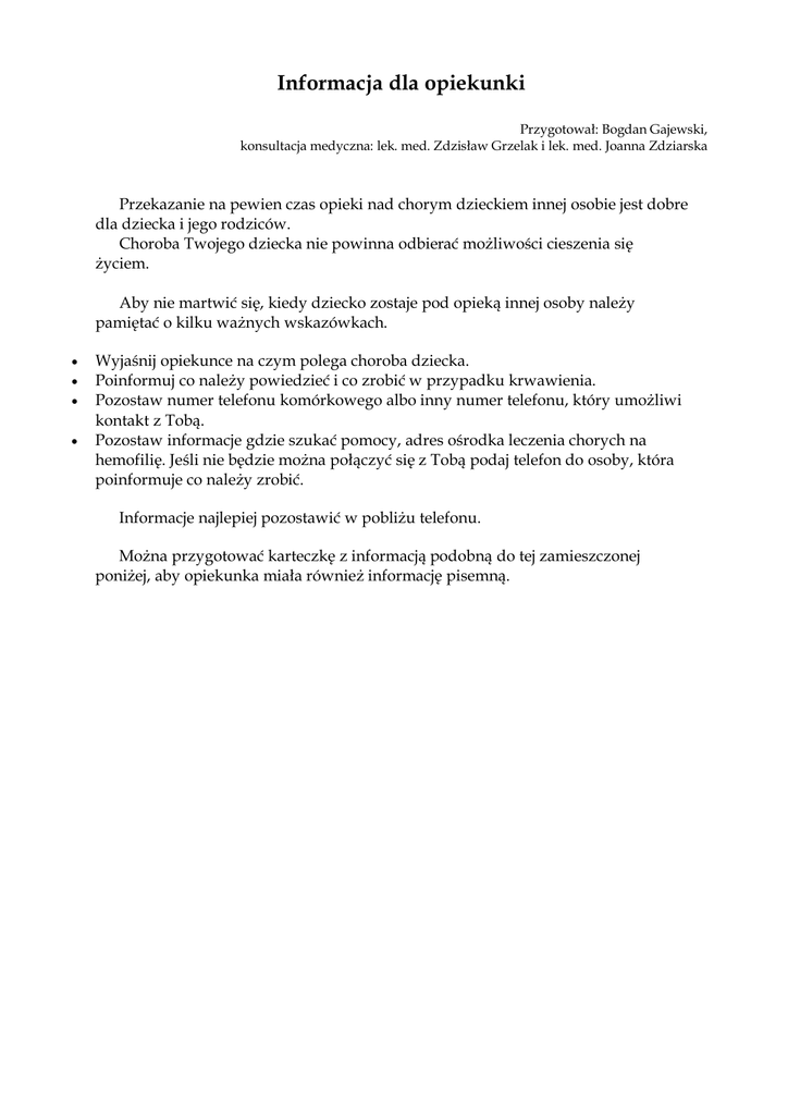 Informacja dla opiekunki Przygotował: Bogdan Gajewski, konsultacja medyczna: lek. med. Zdzisław Grzelak i lek. med. Joanna Zdziarska Przekazanie na pewien czas opieki nad chorym dzieckiem innej osobie jest dobre dla dziecka i jego rodziców. Choroba Twojego dziecka nie powinna odbierać możliwości cieszenia się życiem. Aby nie martwić się, kiedy dziecko zostaje pod opieką innej osoby należy pamiętać o kilku ważnych wskazówkach. • • • • Wyjaśnij opiekunce na czym polega choroba dziecka. Poinformuj co należy powiedzieć i co zrobić w przypadku krwawienia. Pozostaw numer telefonu komórkowego albo inny numer telefonu, który umożliwi kontakt z Tobą. Pozostaw informacje gdzie szukać pomocy, adres ośrodka leczenia chorych na hemofilię. Jeśli nie będzie można połączyć się z Tobą podaj telefon do osoby, która poinformuje co należy zrobić. Informacje najlepiej pozostawić w pobliżu telefonu. Można przygotować karteczkę z informacją podobną do tej zamieszczonej poniżej, aby opiekunka miała również informację pisemną. Informacja dla opiekunki Moje dziecko jest takie samo jak inne dzieci w jego wieku. Ma podobne zainteresowania. Lubi spędzać czas tak, jak jego koledzy (gry komputerowe, książeczki). Jedyną różnicą jest fakt, że moje dziecko jest chore na hemofilię. Hemofilia jest wrodzoną skazą krwotoczną, na którą w Polsce choruje kilka tysięcy chłopców. Choroba ta nie jest zaraźliwa i nie można jej "złapać" jak przeziębienie. Gdy syn skaleczy się albo uderzy to podobnie jak u zdrowych dzieci może u niego dojść do krwawienia. Nie krwawi jednak szybciej niż pozostałe dzieci lecz trochę dłużej. Nie oznacza to, że w przypadku skaleczenia nasze dziecko wykrwawi się na śmierć i należy zakazać mu wszelkiej zabawy. Podczas opieki nad moim dzieckiem proszę pamiętać o: 1. Proszę zniechęcać go do gwałtownej (niebezpiecznej) zabawy. 2. Bardzo często podczas opieki nad dziećmi zdarzają się drobne skaleczenia. Nie stanowią one poważnego problemu u naszego dziecka. Jeśli jednak dojdzie do poważnego upadku, albo urazu głowy, albo urazu w okolicy przełyku, proszę skontaktować się ze mną bezzwłocznie. 3. Kiedy wrócę proszę poinformować mnie, czy doszło do jakichś poważnych skaleczeń albo urazów. Proszę nie obwiniać siebie, ponieważ do urazów dochodzi pomimo najlepszej opieki. 4. Proszę nie podawać dziecku żadnych lekarstw (dotyczy to szczególnie aspiryny). Jeśli ma Pani jakiekolwiek pytania i chciałaby dowiedzieć się więcej o chorobie mojego dziecka, bardzo chętnie porozmawiam o szczegółach. Ważne numery telefonów W razie wypadku korzystamy z telefonów: Telefon stacjonarny:.......................Telefon komórkowy:…....................... Lekarz:............................................Telefon do lekarza:..............................