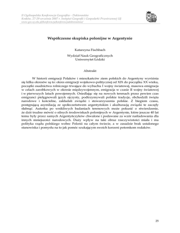 II Ogólnopolska Konferencja Geografów - Doktorantów Kraków, 27-29 wrzeĤnia 2007 r. Instytut Geografii i Gospodarki Przestrzennej UJ www.geo.uj.edu.pl/konferencja/konferencjadoktorantow/ Wspóãczesne skupiska polonijne w Argentynie Katarzyna Fischbach Wydziaã Nauk Geograficznych Uniwersytet âódzki Abstrakt W historii emigracji Polaków i mieszkaęców ziem polskich do Argentyny wyróİnia sič kilka okresów sĈ to: okres emigracji wojskowo-politycznej od XIX do poczĈtku XX wieku, poczĈtki osadnictwa rolniczego trwajĈce do wybuchu I wojny Ĥwiatowej, masowa emigracja w celach zarobkowych w okresie mičdzywojennym, emigracja w czasie II wojny Ĥwiatowej i w pierwszych latach powojennych. OsiedlajĈc sič na nowych terenach przez pewien czas emigranci pielčgnowali jčzyk ojczysty, podtrzymywali polskie tradycje, obchodzili Ĥwičta narodowe i koĤcielne, zakãadali zwiĈzki i stowarzyszenia polskie. Z biegiem czasu, postčpujĈcĈ asymilacjĈ ze spoãeczeęstwem argentyęskim i akulturacjĈ zwiĈzki te zaczčãy sãabnĈþ. Autorka po wnikliwych badaniach terenowych moİe pokusiþ o stwierdzenie, İe dziĤ trudno mówiþ o silnych Ĥrodowiskach polonijnych w Argentynie, które jeszcze 40 lat temu byãy przez samych Argentyęczyków chwalone i podawane za wzór naĤladowania dla innych mniejszoĤci narodowych. Duİy wpãyw na taki obraz rzeczywistoĤci miaãa i ma polityka rzĈdu polskiego wobec Polonii na caãym Ĥwiecie, a w zasadzie brak ustalonego stanowiska i pomysãu na to jak pomóc szukajĈcym swoich korzeni potomkom rodaków. 25