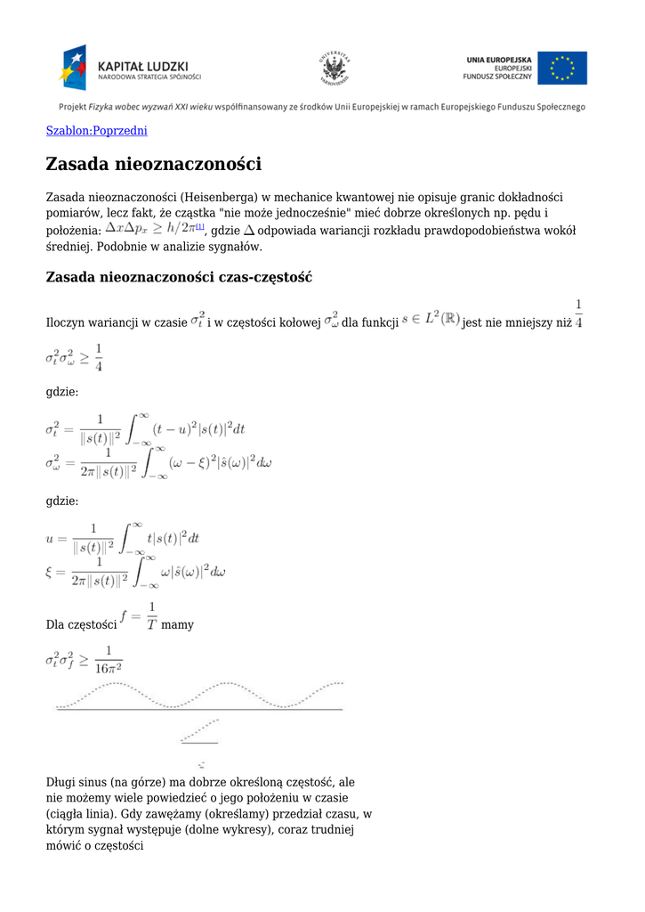 Szablon:Poprzedni Zasada nieoznaczoności Zasada nieoznaczoności (Heisenberga) w mechanice kwantowej nie opisuje granic dokładności pomiarów, lecz fakt, że cząstka "nie może jednocześnie" mieć dobrze określonych np. pędu i [1] położenia: , gdzie odpowiada wariancji rozkładu prawdopodobieństwa wokół średniej. Podobnie w analizie sygnałów. Zasada nieoznaczoności czas-częstość Iloczyn wariancji w czasie i w częstości kołowej dla funkcji gdzie: gdzie: Dla częstości mamy Długi sinus (na górze) ma dobrze określoną częstość, ale nie możemy wiele powiedzieć o jego położeniu w czasie (ciągła linia). Gdy zawężamy (określamy) przedział czasu, w którym sygnał występuje (dolne wykresy), coraz trudniej mówić o częstości jest nie mniejszy niż Szablon:Następny 1. ↑ stała Plancka J s.