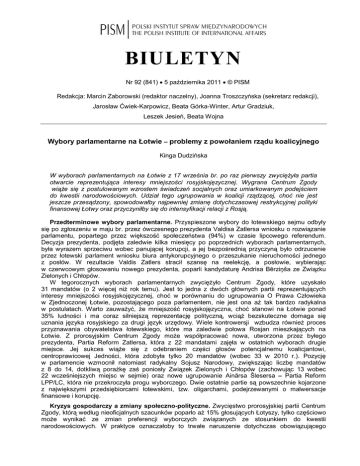BIULETYN Nr 92 (841) 5 października 2011 © PISM Redakcja: Marcin Zaborowski (redaktor naczelny), Joanna Troszczyńska (sekretarz redakcji), Jarosław Ćwiek-Karpowicz, Beata Górka-Winter, Artur Gradziuk, Leszek Jesień, Beata Wojna Wybory parlamentarne na Łotwie – problemy z powołaniem rządu koalicyjnego Kinga Dudzińska W wyborach parlamentarnych na Łotwie z 17 września br. po raz pierwszy zwyciężyła partia otwarcie reprezentująca interesy mniejszości rosyjskojęzycznej. Wygrana Centrum Zgody wiąże się z postulowanym wzrostem świadczeń socjalnych oraz umiarkowanym podejściem do kwestii narodowościowych. Udział tego ugrupowania w koalicji rządzącej, choć nie jest jeszcze przesądzony, spowodowałby najpewniej zmianę dotychczasowej restrykcyjnej polityki finansowej Łotwy oraz przyczyniłby się do intensyfikacji relacji z Rosją. Przedterminowe wybory parlamentarne. Przyspieszone wybory do łotewskiego sejmu odbyły się po zgłoszeniu w maju br. przez ówczesnego prezydenta Valdisa Zatlersa wniosku o rozwiązanie parlamentu, popartego przez większość społeczeństwa (94%) w czasie lipcowego referendum. Decyzja prezydenta, podjęta zaledwie kilka miesięcy po poprzednich wyborach parlamentarnych, była wyrazem sprzeciwu wobec panującej korupcji, a jej bezpośrednią przyczyną było odrzucenie przez łotewski parlament wniosku biura antykorupcyjnego o przeszukanie nieruchomości jednego z posłów. W rezultacie Valdis Zatlers stracił szansę na reelekcję, a posłowie, wybierając w czerwcowym głosowaniu nowego prezydenta, poparli kandydaturę Andrisa Bērziņša ze Związku Zielonych i Chłopów. W tegorocznych wyborach parlamentarnych zwyciężyło Centrum Zgody, które uzyskało 31 mandatów (o 2 więcej niż rok temu). Jest to jedna z dwóch głównych partii reprezentujących interesy mniejszości rosyjskojęzycznej, choć w porównaniu do ugrupowania O Prawa Człowieka w Zjednoczonej Łotwie, pozostającego poza parlamentem, nie jest ona aż tak bardzo radykalna w postulatach. Warto zauważyć, że mniejszość rosyjskojęzyczna, choć stanowi na Łotwie ponad 35% ludności i ma coraz silniejszą reprezentację polityczną, wciąż bezskuteczne domaga się uznania języka rosyjskiego za drugi język urzędowy. Wiele kontrowersji wzbudza również proces przyznawania obywatelstwa łotewskiego, które ma zaledwie połowa Rosjan mieszkających na Łotwie. Z prorosyjskim Centrum Zgody może współpracować nowa, utworzona przez byłego prezydenta, Partia Reform Zatlersa, która z 22 mandatami zajęła w ostatnich wyborach drugie miejsce. Jej sukces wiąże się z odebraniem części głosów potencjalnemu koalicjantowi, centroprawicowej Jedności, która zdobyła tylko 20 mandatów (wobec 33 w 2010 r.). Pozycję w parlamencie wzmocnił natomiast radykalny Sojusz Narodowy, zwiększając liczbę mandatów z 8 do 14, dotkliwą porażkę zaś poniosły Związek Zielonych i Chłopów (zachowując 13 wobec 22 wcześniejszych miejsc w sejmie) oraz nowe ugrupowanie Ainārsa Šlesersa – Partia Reform LPP/LC, która nie przekroczyła progu wyborczego. Dwie ostatnie partie są powszechnie kojarzone z największymi przedsiębiorcami łotewskimi, tzw. oligarchami, podejrzewanymi o malwersacje finansowe i korupcję. Kryzys gospodarczy a zmiany społeczno-polityczne. Zwycięstwo prorosyjskiej partii Centrum Zgody, którą według nieoficjalnych szacunków poparło aż 15% głosujących Łotyszy, tylko częściowo może wynikać ze zmian preferencji wyborczych związanych ze stosunkiem do kwestii narodowościowych. W praktyce oznaczałoby to trwałe naruszenie dotychczas obowiązującego 2529 Polski Instytut Spraw Międzynarodowych podziału, zgodnie z którym siły prawicowe powszechnie utożsamiane są z partiami narodowymi, prezentującymi program liberalny bądź konserwatywny, lewica zaś to partie socjaldemokratyczne, które odwołują się przede wszystkim do mniejszości rosyjskojęzycznej. Choć Łotwa powoli wychodzi z załamania ekonomicznego, o czym świadczy stopniowy wzrost PKB o 3% w 2010 r., to ze względu na wciąż trudną sytuację finansową państwa, związaną z dużym bezrobociem (16%) i rosnącą inflacją (4,5%), tegoroczne wybory niewątpliwie odbyły się w cieniu kryzysu gospodarczego. Słaby wynik rządzącej partii Jedność wyraźnie dowodzi, że większość społeczeństwa była zmęczona restrykcyjną polityką rządu, który w 2009 r. drastycznie ograniczył wydatki budżetowe w celu uzyskania pakietu pomocowego od Międzynarodowego Funduszu Walutowego i Komisji Europejskiej. Sukces wyborczy Centrum Zgody zasadzał się z kolei na hasłach socjalnych, obiecujących indeksację rent i emerytur, oraz na rezygnacji z eskalacji problemów na tle narodowościowym. Trudna sytuacja gospodarcza kraju nie sprawiła jednak, że kwestie narodowościowe przestały dzielić mieszkańców Łotwy, o czym świadczy wzrost poparcia dla Sojuszu Narodowego – partii odwołującej się do haseł nacjonalistycznych. Nowa koalicja rządząca. Przypuszczając, że w skład koalicji rządzącej wejdą zarówno Partia Reform, jak i Jedność możliwe są następujące scenariusze: pierwszy zakłada koalicję tych ugrupowań z radykalnym Sojuszem Narodowym, drugi zaś dopuszcza udział prorosyjskiego Centrum Zgody jako trzeciego koalicjanta. Koalicja Partii Reform, Jedności i Sojuszu Narodowego gwarantowałaby ciągłość dotychczasowej polityki gospodarczej kraju. Partia Jedność dążyłaby zapewne do wprowadzenia waluty euro w 2014 r., co wymagałoby ścisłej dyscypliny finansowej i utrzymania deficytu budżetowego na poziomie nie większym niż 2,5% PKB. Pewne kontrowersje mogłaby wzbudzać strategia wobec mniejszości narodowych, gdyż Sojusz Narodowy popiera np. zaostrzenie polityki oświatowej. Natomiast drugi scenariusz, czyli powstanie koalicji z udziałem Centrum Zgody, mógłby wywrzeć istotny wpływ na politykę wewnętrzną Łotwy, zwła