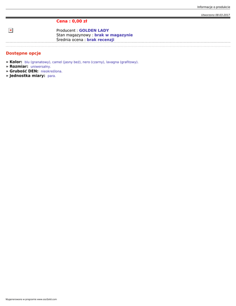 Informacje o produkcie Utworzono 08-03-2017 Cena : 0,00 zł Producent : GOLDEN LADY Stan magazynowy : brak w magazynie Średnia ocena : brak recenzji Dostępne opcje » » » » Kolor: blu (granatowy), camel (jasny beż), nero (czarny), lavagna (grafitowy). Rozmiar: uniwersalny. Grubość DEN: nieokreślona. Jednostka miary: para. Wygenerowano w programie www.oscGold.com