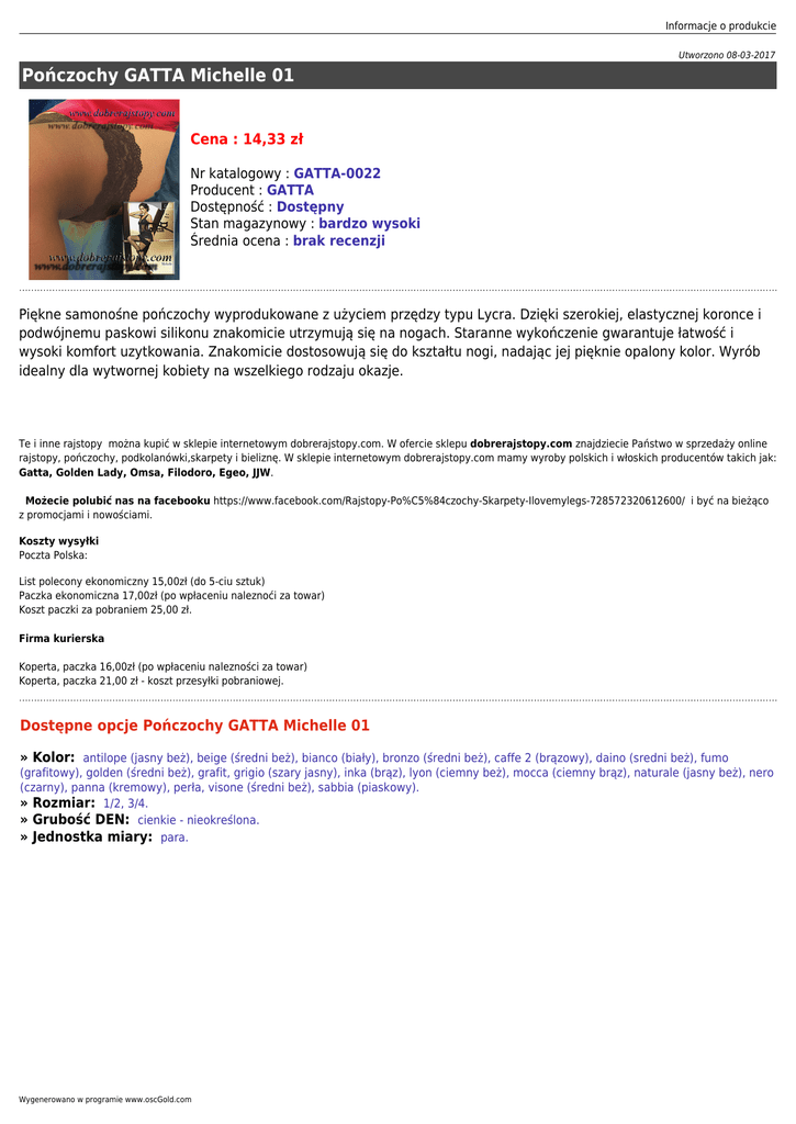 Informacje o produkcie Utworzono 08-03-2017 Pończochy GATTA Michelle 01 Cena : 14,33 zł Nr katalogowy : GATTA-0022 Producent : GATTA Dostępność : Dostępny Stan magazynowy : bardzo wysoki Średnia ocena : brak recenzji Piękne samonośne pończochy wyprodukowane z użyciem przędzy typu Lycra. Dzięki szerokiej, elastycznej koronce i podwójnemu paskowi silikonu znakomicie utrzymują się na nogach. Staranne wykończenie gwarantuje łatwość i wysoki komfort uzytkowania. Znakomicie dostosowują się do kształtu nogi, nadając jej pięknie opalony kolor. Wyrób idealny dla wytwornej kobiety na wszelkiego rodzaju okazje. Te i inne rajstopy można kupić w sklepie internetowym dobrerajstopy.com. W ofercie sklepu dobrerajstopy.com znajdziecie Państwo w sprzedaży online rajstopy, pończochy, podkolanówki,skarpety i bieliznę. W sklepie internetowym dobrerajstopy.com mamy wyroby polskich i włoskich producentów takich jak: Gatta, Golden Lady, Omsa, Filodoro, Egeo, JJW. Możecie polubić nas na facebooku https://www.facebook.com/Rajstopy-Po%C5%84czochy-Skarpety-Ilovemylegs-728572320612600/ i być na bieżąco z promocjami i nowościami. Koszty wysyłki Poczta Polska: List polecony ekonomiczny 15,00zł (do 5-ciu sztuk) Paczka ekonomiczna 17,00zł (po wpłaceniu naleznoći za towar) Koszt paczki za pobraniem 25,00 zł. Firma kurierska Koperta, paczka 16,00zł (po wpłaceniu nalezności za towar) Koperta, paczka 21,00 zł - koszt przesyłki pobraniowej. Dostępne opcje Pończochy GATTA Michelle 01 » Kolor: antilope (jasny beż), beige (średni beż), bianco (biały), bronzo (średni beż), caffe 2 (brązowy), daino (sredni beż), fumo (grafitowy), golden (średni beż), grafit, grigio (szary jasny), inka (brąz), lyon (ciemny beż), mocca (ciemny brąz), naturale (jasny beż), nero (czarny), panna (kremowy), perła, visone (średni beż), sabbia (piaskowy). » Rozmiar: 1/2, 3/4. » Grubość DEN: cienkie - nieokreślona. » Jednostka miary: para. Wygenerowano w programie www.oscGold.com