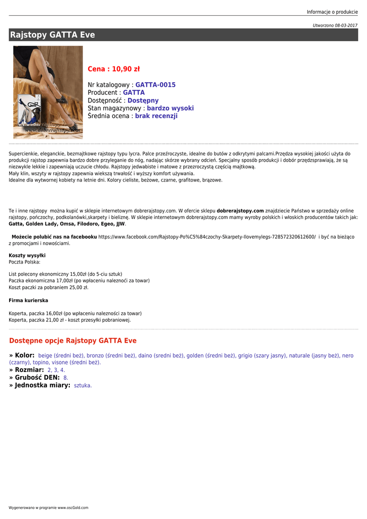 Informacje o produkcie Utworzono 08-03-2017 Rajstopy GATTA Eve Cena : 10,90 zł Nr katalogowy : GATTA-0015 Producent : GATTA Dostępność : Dostępny Stan magazynowy : bardzo wysoki Średnia ocena : brak recenzji Supercienkie, eleganckie, bezmajtkowe rajstopy typu lycra. Palce przeźroczyste, idealne do butów z odkrytymi palcami.Przędza wysokiej jakości użyta do produkcji rajstop zapewnia bardzo dobre przyleganie do nóg, nadając skórze wybrany odcień. Specjalny sposób produkcji i dobór przędzsprawiają, że są niezwykle lekkie i zapewniają uczucie chłodu. Rajstopy jedwabiste i matowe z przezroczystą częścią majtkową. Mały klin, wszyty w rajstopy zapewnia wiekszą trwałość i wyższy komfort używania. Idealne dla wytwornej kobiety na letnie dni. Kolory cieliste, beżowe, czarne, grafitowe, brązowe. Te i inne rajstopy można kupić w sklepie internetowym dobrerajstopy.com. W ofercie sklepu dobrerajstopy.com znajdziecie Państwo w sprzedaży online rajstopy, pończochy, podkolanówki,skarpety i bieliznę. W sklepie internetowym dobrerajstopy.com mamy wyroby polskich i włoskich producentów takich jak: Gatta, Golden Lady, Omsa, Filodoro, Egeo, JJW. Możecie polubić nas na facebooku https://www.facebook.com/Rajstopy-Po%C5%84czochy-Skarpety-Ilovemylegs-728572320612600/ i być na bieżąco z promocjami i nowościami. Koszty wysyłki Poczta Polska: List polecony ekonomiczny 15,00zł (do 5-ciu sztuk) Paczka ekonomiczna 17,00zł (po wpłaceniu naleznoći za towar) Koszt paczki za pobraniem 25,00 zł. Firma kurierska Koperta, paczka 16,00zł (po wpłaceniu nalezności za towar) Koperta, paczka 21,00 zł - koszt przesyłki pobraniowej. Dostępne opcje Rajstopy GATTA Eve » Kolor: beige (średni beż), bronzo (średni beż), daino (sredni beż), golden (średni beż), grigio (szary jasny), naturale (jasny beż), nero (czarny), topino, visone (średni beż). » Rozmiar: 2, 3, 4. » Grubość DEN: 8. » Jednostka miary: sztuka. Wygenerowano w programie www.oscGold.com