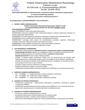 Polskie Towarzystwo Stwardnienia Rozsianego Oddział w Łodzi 92-338 Łódź, ul. Przybyszewskiego 255/267 Tel./fax: 42 649-18-03 ZAPYTANIE OFERTOWE na zakwaterowanie i wyżywienie podczas warsztatów integracyjnych w ramach prowadzonego projektu: „Integracja sztuką wobec niepełnosprawności 3” Nr postępowania: 1a/2016/PFRON/INT z dnia 22.09.2016 r. 1. NAZWA I ADRES ZAMAWIAJĄCEGO Polskie Towarzystwo Stwardnienia Rozsianego, Oddział w Łodzi ul. Przybyszewskiego 255/267, 92-338 Łódź, [email protected] POSTANOWIENIA OGÓLNE Każdy WYKONAWCA może złożyć tylko jedną ofertę. ZAMAWIAJĄCY dopuszcza składanie ofert częściowych jedynie w zakresie organizacji warsztatu na terenie wybranego województwa. WYKONAWCA nie może powierzyć wykonania zamówienia ani jego części podwykonawcom. WYKONAWCA ponosi wszelkie koszty związane z przygotowaniem oferty. ZAMAWIAJĄCY zastrzega sobie prawo do unieważnienia procedury zapytania ofertowego w każdym momencie trwania procedury bez podania przyczyny. ZAMAWIAJĄCY może odstąpić od podpisania umowy bez podania przyczyny. ZAMAWIAJĄCY nie dopuszcza możliwości negocjacji cenowej. 2. OPIS PRZEDMIOTU ZAMÓWIENIA świadczenie usług związanych zakwaterowaniem i wyżywieniem podczas siedmiodniowego integracyjnego warsztatu, zgodnie ze szczegółowym opisem przedmiotu zamówienia dla śr. 29 osób niepełnosprawnych uczestników projektu „Integracja sztuką wobec niepełnosprawności 3” oraz 6 osób z obsługi projektu ośrodek, w którym będzie świadczona usługa musi być dostosowany do potrzeb osób niepełnosprawnych z dysfunkcją narządu ruchu, poruszających się na wózkach inwalidzkich, ośrodek musi posiadać windę dla osób niepełnosprawnych z dostępem na wszystkie poziomy stały dostęp do Internetu w całym obiekcie, wszystkie usługi muszą być świadczone w jednym budynku, bezpłatny parking dla autokaru na terenie ośrodka, umożliwienie przeprowadzenia kontroli projektu przez PFRON jak i inne instytucje kontrolne. 3. WSPÓLNY SŁOWNIK ZAMÓWIEŃ (CPV) CPV - 55120000 – 7 – usługi hotelarskie w zakresie spotkań i konferencji CPV - 55110000 – 04 – hotelarskie usługi noclegowe CPV - 55300000 – 3 – usługi restauracyjne i podawania posiłków 4. ZADANIA PO STRONIE WYKONAWCY oznakowanie pomieszczeń i dokumentów dotyczących przedmiotu zamówienia zgodnie z wytycznymi PFRON; umożliwienie przeprowadzenia kontroli projektu przez PFRON jak i inne instytucje kontrolne zapewnienie zakwaterowania w budynku bez barier architektonicznych 5. ZADANIA PO STRONIE ZAMAWIAJĄCEGO terminowe i rzetelne wywiązywanie się z umowy przekazanie Wykonawcy narzędzi badawczych do realizacji zadań zapewnienie kontaktu z osobami uczestniczącymi w projekcie, dostarczenie harmonogramu pobytu do 7 dni przed planowanym rozpoczęciem warsztatów Projekt współfinansowany przez Państwowy Fundusz Rehabilitacji Osób Niepełnosprawnych Polskie Towarzystwo Stwardnienia Rozsianego Oddział w Łodzi 92-338 Łódź, ul. Przybyszewskiego 255/267 Tel./fax: 42 649-18-03 6. TERMIN I MIEJSCE WYKONANIA ZAMÓWIENIA Termin warsztatów: Termin: 09 – 15 października 2016 r. 7. SZCZEGÓŁOWY OPIS PRZEDMIOTU ZAMÓWIENIA: a) Zakwaterowanie i wyżywienie podczas 7-dniowych warsztatów: Nocleg dla śr. 35 osób - zapewnienie uczestnikom zakwaterowania w pensjonacie/ośrodku wypoczynkowym dysponującym pokojami: 4 pokoje 1 osobowe, 11 pokoi 2 osobowych, 3 pokoje 3 osobowe, Każdy pokój z łazienką, telewizorem, czajnikiem bezprzewodowym, szklankami, pościelą i ręcznikami. Zamawiający zastrzega sobie prawo do zmiany ilości pokoi dwuosobowych na rzecz pokoi jednoosobowych (lub odwrotnie) w sytuacji, jeśli liczba kobiet w stosunku do mężczyzn będzie niesymetryczna, Całodzienne wyżywienie (tj. śniadanie, obiad, kolacja) podczas pobytu dla 35 osób. Śniadania i kolacje w postaci szwedzkiego stołu z min. 2 potrawami na ciepło i napojami do wyboru (woda, soki, kawa, herbata). Dwudaniowy obiad (zupa + drugie danie) z napojami i deserem. Każdego dnia min. 2 różne zestawy obiadowe do wyboru z uwzględnieniem potraw wegetariańskich i mięsnych. Zamawiający dopuszcza możliwość zmniejszenia lub zwiększenia ilości uczestników warsztatów o maximum 10%. b) Zapewnienie sali, w której przeprowadzane będą zajęcia integracyjne: na terenie obiektu znajduje się sala konferencyjna dla 29 osób niepełnosprawnych c) Zorganizowanie imprezy integracyjnej: spotkanie 35 osób w formie grilla, ogniska lub innej (zależnie od warunków pogodowych) zapewnienie 35 miejsc siedzących, menu dla 35 osób. Prosimy o udokumentowanie powyższych warunków (np. dokumentacja warunków pobytu, menu przewidziane na czas warsztatów i imprezę integracyjną). 8. WARUNKI UDZIAŁU W POSTĘPOWANIU Składający ofertę posiada: uprawnienia do wykonywania określonej działalności lub czynności, zdolność finansową oraz techniczną do wykonania usługi, doświadczenie w realizacji warsztatów integracyjnych dla osób niepełnosprawnych, referencje potwierdzające zrealizowanie warsztatów w zakresie zakwaterowania i wyżywienia osób niepełnosprawnych ubiegający się o udzielenie zamówienia ma prawo do złożenia jednej oferty na jeden lub więcej warsztatów. 9. DOKUMENTY WYMAGANE W CELU POTWIERDZENIA SPEŁNIENIA WARUNKÓW formularz ofertowy – zgodnie z załącznikiem nr 1, oświadczenie o braku powiązań kapitałowych lub osobowych – zgodnie z załącznikiem nr 2, aktualny odpis z właściwego rejestru lub zaświadczenie o wpisie do ewidencji działalności gospodarczej wystawiony nie wcześniej niż 3 miesiące przed upływem terminu składania oferty, Projekt współfinansowany przez Państwowy Fundusz Rehabilitacji Osób Niepełnosprawnych Polskie Towarzystwo Stwardnienia Rozsianego Oddział w Łodzi 92-338 Łódź, ul. Przybyszewskiego 255/267 Tel./fax: 42 649-18-03 doświadczenie w obsłudze warsztatów integracyjnych dla osób niepeł