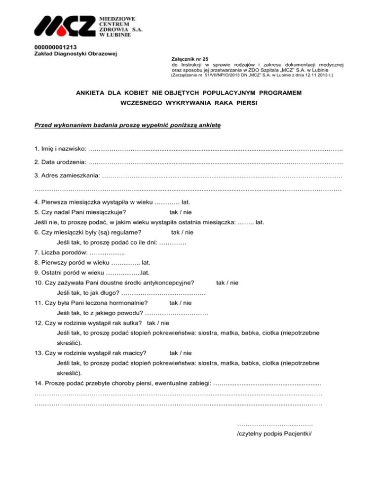 000000001213 Zakład Diagnostyki Obrazowej Załącznik nr 25 do Instrukcji w sprawie rodzajów i zakresu dokumentacji medycznej oraz sposobu jej przetwarzania w ZDO Szpitala „MCZ” S.A. w Lubinie (Zarządzenie nr 51/VII/NP/O/2013 DN „MCZ” S.A. w Lubinie z dnia 12.11.2013 r.) ANKIETA DLA KOBIET NIE OBJĘTYCH POPULACYJNYM PROGRAMEM WCZESNEGO WYKRYWANIA RAKA PIERSI Przed wykonaniem badania proszę wypełnić poniższą ankietę 1. Imię i nazwisko: 111111111..................................................................................11111111. 2. Data urodzenia: 111111111..................................................................................11111111. 3. Adres zamieszkania: 11111.................................................................................1111111111. 1111111111111111....................................................................................111111111 4. Pierwsza miesiączka wystąpiła w wieku 1111 lat. 5. Czy nadal Pani miesiączkuje? tak / nie Jeśli nie, to proszę podać, w jakim wieku wystąpiła ostatnia miesiączka: 11.. lat. 6. Czy miesiączki były (są) regularne? tak / nie Jeśli tak, to proszę podać co ile dni: 1111. 7. Liczba porodów: 11111.. 8. Pierwszy poród w wieku 1111.. lat. 9. Ostatni poród w wieku 11111..lat. 10. Czy zażywała Pani doustne środki antykoncepcyjne? tak / nie Jeśli tak, to jak długo? 1111111111111. 11. Czy była Pani leczona hormonalnie? tak / nie Jeśli tak, to z jakiego powodu? 1111111111 12. Czy w rodzinie wystąpił rak sutka? tak / nie Jeśli tak, to proszę podać stopień pokrewieństwa: siostra, matka, babka, ciotka (niepotrzebne skreślić). 13. Czy w rodzinie wystąpił rak macicy? tak / nie Jeśli tak, to proszę podać stopień pokrewieństwa: siostra, matka, babka, ciotka (niepotrzebne skreślić). 14. Proszę podać przebyte choroby piersi, ewentualne zabiegi: 11...................................................... 1111111111111111111111111111.......................................................11 111111111111111111111111111.......................................................111 11111111......11. /czytelny podpis Pacjentki/