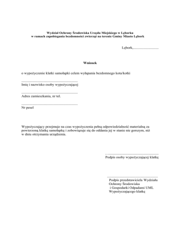 Lębork,............................ Wniosek o wypożyczenie klatki samołapki
