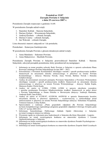 Protokół nr 23/07 Zarządu Powiatu w Sulęcinie z dnia 25 czerwca 2007 r. Posiedzenie Zarządu rozpoczęto o godzinie 14.49. W posiedzeniu Zarządu udział wzięli: 1. 2. 3. 4. 5. Stanisław Kubiak – Starosta Sulęciński, Dariusz Ejchart – Wicestarosta Sulęciński, Andrzej Kuchnio – członek Zarządu, Dariusz Czarny – członek Zarządu, Jan Walczak – członek Zarządu. Lista obecności stanowi załącznik nr 1 do protokołu. Protokolant – Katarzyna Gardziejewska W posiedzeniu Zarządu Powiatu z głosem doradczym udział wzięły: 1. Anna Matulanis – Sekretarz Powiatu. 2. Anna Makarewicz – Skarbnik Powiatu. Posiedzeniu Zarządu Powiatu w Sulęcinie przewodniczył Stanisław Kubiak – Starosta Sulęciński, odczytał porządek posiedzenia, który przedstawiał się następująco: 1. Informacja na temat projektu uchwały Rady Powiatu w Sulęcinie w sprawie uchwalenia Planu Rozwoju Lokalnego Powiatu Sulęcińskiego na lata 2007 – 2013. 2. Porozumienia z Powiatem Krośnieńskim określające warunki i sposób przekazywania środków finansowych na utrzymanie dziecka umieszczonego w placówce na terenie Powiatu Krośnieńskiego – dotyczy: Marzeny Nowak, Anny Nowak, Barbary Nowak i Henryka Gołębiowskiego. 3. Aneksy do porozumień zawartych pomiędzy Powiatem Sulęcińskim a Powiatem Wolsztyńskim określające warunki i sposób przekazywania środków finansowych na utrzymanie dziecka umieszczonego w placówce na terenie Powiatu Wolsztyńskiego – dotyczy: Rafała Kujda, Mateusza Kujda i Pawła Kujda. 4. Aneksy do umów nr 4/2004, 5/2004, 6/2004 w sprawie określenia warunków i sposobu przekazania Powiatowi Międzyrzeckiemu środków finansowych za pobyt dzieci z Powiatu Sulęcińskiego w Domu Dziecka w Skwierzynie (dotyczy: Andrzeja Hartmana, Andrzeja Kukli, Jana Kukli). 5. Aneksy do umów nr 61/SW/07, 62/SW/04, 64/SW/04 w sprawie finansowania kosztów utrzymania dziecka w placówce opiekuńczo – wychowawczej, a zamieszkałego przed umieszczeniem w placówce na terenie Powiatu Sulęcińskiego (dotyczy: Sebastiana Foczpaniak, Tomasza Gancerz, Celiny Kabat). 6. Sprawozdanie z realizacji „Planu gospodarki odpadami dla Powiatu Sulęcińskiego na bazie kompleksowego regionalnego programu gospodarki odpadami Celowego Związku gmin CZG-12” na lata 2004-2011. 7. Informacja Samodzielnego Publicznego Zakładu Opieki Zdrowotnej w Sulęcinie na temat wynajęcia miejsca na reklamę. 8. WyraŜenie zgody na wykonanie prac budowlanych w Sulęcinie dla firmy Maszoński – Logistic. 9. Informacja na temat rozstrzygnięcia konkursu na stanowisko dyrektora I Liceum Ogólnokształcącego w Sulęcinie. 10. Informacja na temat rozstrzygnięcia konkursu na stanowisko dyrektora Poradni Psychologiczno – Pedagogicznej w Sulęcinie. 11. Informacja na temat rozstrzygnięcia konkursu na stanowisko dyrektora Zespołu Szkół Licealnych i Zawodowych w Sulęcinie. 12. Informacja na temat projektu uchwały Rady Powiatu w Sulęcinie w sprawie zatwierdzenia zmian w Statucie Samodzielnego Publicznego Zakładu Opieki Zdrowotnej w Sulęcinie. 13. Podjęcie Uchwały Zarządu Powiatu w Sulęcinie w sprawie zakupu aparatury i sprzętu medycznego oraz technicznego przez Samodzielny Publiczny Zakład Opieki Zdrowotnej w Sulęcinie. 14. Wnioski z Komisji Rady Powiatu oraz opinie Komisji Rady Powiatu w Sulęcinie na temat projektów uchwał: a. w sprawie zgłoszenia kandydata na członka Powiatowej Społecznej Rady do Spraw Osób Niepełnosprawnych w Sulęcinie, b. w sprawie zatwierdzenia zmiany w Statucie Samodzielnego Publicznego Zakładu Opieki Zdrowotnej w Sulęcinie, c. w sprawie zmiany budŜetu i w budŜecie powiatu na 2007 rok, d. w sprawie zaciągnięcia kredytu długoterminowego, e. w sprawie uchwalenia Planu Rozwoju Lokalnego Powiatu Sulęcińskiego na lata 2007 – 2013 15. Informacja na temat autopoprawki do projektu uchwały Rady Powiatu w Sulęcinie w sprawie zmiany budŜetu i w budŜecie powiatu na 2007 r. 16. Informacja na temat autopoprawki do projektu uchwały Rady Powiatu w Sulęcinie w sprawie zaciągnięcia kredytu długoterminowego. 17. Przyjęcie protokołu nr 21/07 Zarządu Powiatu w Sulęcinie z dnia 28 maja 2007 r. Przyjęcie protokołu nr 22/07 Zarządu Powiatu w Sulęcinie z dnia 11 czerwca 2007 r. 18. Wnioski i zapytania. Członkowie Zarządu Powiatu przyjęli porządek obrad, przy 4 głosach „za”, bez głosów „przeciw”, bez głosów „wstrzymujących się” (na 4 obecnych). Ad. 1 Informacja na temat projektu uchwały Rady Powiatu w Sulęcinie w sprawie uchwalenia Planu Rozwoju Lokalnego Powiatu Sulęcińskiego na lata 2007 – 2013. Informacji w powyŜszej sprawie udzieliła Agata Wilczyk - Referent ds. rozwoju powiatu i pozyskiwania środków pomocowych. Stanisław Kubiak – Starosta Sulęciński zapytał jakie uwagi i wnioski mieli radni na komisjach. Agata Wilczyk - Referent ds. rozwoju powiatu i pozyskiwania środków pomocowych odpowiedziała, Ŝe zwrócono m.in. uwagę, Ŝe w rozdziale „Opieka zdrowotna i sprawy społeczne” są nieprawidłowe dane dotyczące poradni internistycznej i psychologicznej, po konsultacjach z Ryszardem Majewskim - zastępcą dyrektora SP ZOZ usunięto zapis: „poradnia internistyczna”. Ponadto zakwestionowano kilka zapisów związanych z systemem kanalizacji i oczyszczalni ścieków, ale dane zawarte w planie zostały opracowane przez specjalistów z Wydziału Budownictwa, Nieruchomości i Ochrony Środowiska na podstawie aktualnych sprawozdań. ZłoŜono równieŜ wnioski dotyczące ujęcia nowych zadań drogowych na lata 2010 – 2013, spośród których Naczelnik Wydziału Komunikacji i Dróg zgłosił do ujęcia w planie 4 zadania. Dariusz Czarny – członek Zarządu zwrócił uwagę, Ŝe na Komisji złoŜono wniosek o ujęcie w palnie „modernizacji drogi Lemierzyce-Głuchowo-Słońsk”. Zaproponował ujęcie tego zadania w planie na lata 2010 -2013. Członkowie Zarządu Powiatu przyjęli poprawki i podjęli decy