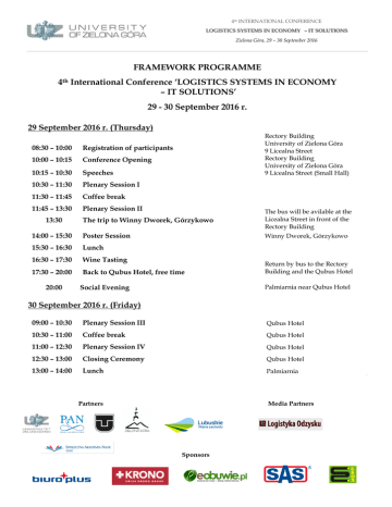 4th INTERNATIONAL CONFERENCE LOGISTICS SYSTEMS IN ECONOMY – IT SOLUTIONS Zielona Góra, 29 – 30 September 2016 FRAMEWORK PROGRAMME 4th International Conference ‘LOGISTICS SYSTEMS IN ECONOMY – IT SOLUTIONS’ 29 - 30 September 2016 r. 29 September 2016 r. (Thursday) 08:30 – 10:00 Registration of participants 10:00 – 10:15 Conference Opening 10:15 – 10:30 Speeches 10:30 – 11:30 Plenary Session I 11:30 – 11:45 Coffee break 11:45 – 13:30 Plenary Session II Rectory Building University of Zielona Góra 9 Licealna Street Rectory Building University of Zielona Góra 9 Licealna Street (Small Hall) The trip to Winny Dworek, Górzykowo The bus will be avilable at the Licealna Street in front of the Rectory Building 14:00 – 15:30 Poster Session Winny Dworek, Górzykowo 15:30 – 16:30 Lunch 16:30 – 17:30 Wine Tasting 17:30 – 20:00 Back to Qubus Hotel, free time 13:30 20:00 Social Evening Return by bus to the Rectory Building and the Qubus Hotel Palmiarnia near Qubus Hotel 30 September 2016 r. (Friday) 09:00 – 10:30 Plenary Session III Qubus Hotel 10:30 – 11:00 Coffee break Qubus Hotel 11:00 – 12:30 Plenary Session IV Qubus Hotel 12:30 – 13:00 Closing Ceremony Qubus Hotel 13:00 – 14:00 Lunch Palmiarnia Partners Media Partners Sponsors 4th INTERNATIONAL CONFERENCE LOGISTICS SYSTEMS IN ECONOMY – IT SOLUTIONS Zielona Góra, 29 – 30 September 2016 Important Addresses: UNIWERSYTET ZIELONOGÓRSKI ul. Licealna 9 65-417 Zielona Góra WINNY DWOREK Winnica Stara Winna Góra Górzykowo 22 66-131 Cigacice tel. 68 385 92 79 wew. 10 kom. 694 266 679 Zielonogórska „PALMIARNIA” ul. Wrocławska 12 a 65-427 Zielona Góra tel. 68 478-45-50 tel. 68 478-45-50 [email protected] http://www.palmiarnia.zgora.pl/ QUBUS HOTEL Zielona Góra *** ul. Ceglana 14a 65-211 Zielona Góra tel.: +48 68 329 3 100 fax: +48 68 329 3 200 Central Reservation: +48 71 782 8 765 [email protected] [email protected] Partners Media Partners Sponsors