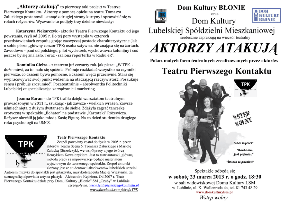 „Aktorzy atakują” to pierwszy taki projekt w Teatrze Pierwszego Kontaktu. Aktorzy z pomocą opiekuna teatru Tomasza Załuckiego postanowili stanąć z drugiej strony kurtyny i sprawdzić się w rolach reżyserów. Wyzwanie to podjęły trzy dzielne niewiasty: Katarzyna Piekarczyk - aktorka Teatru Pierwszego Kontaktu od jego powstania, czyli od 2005 r. Do tej pory wystąpiła w czterech przedstawieniach zespołu, grając zazwyczaj postacie charakterystyczne. Jak o sobie pisze: „główny cenzor TPK; osoba sztywna, nie znająca się na żartach. Zawodowo - pani od polskiego, pilot wycieczek, wychowawca kolonijny i coś jeszcze by się znalazło. Teraz - szalona reporterka w Radiu eR”. Dominika Gielza – z teatrem już czwarty rok. Jak pisze: „W TPK dużo mówi, za to mało się spóźnia. Próbuje rozkładać wszystko na czynniki pierwsze, co czasem bywa pomocne, a czasem wręcz przeciwnie. Stara się wypracowywać swój punkt widzenia na otaczającą rzeczywistość. Poszukuje sensu i próbuje zrozumieć”. Pozateatralnie – absolwentka Politechniki Lubelskiej ze specjalizacją: zarządzanie i marketing. Dom Kultury BŁONIE oraz Dom Kultury Lubelskiej Spółdzielni Mieszkaniowej serdecznie zapraszają na wieczór teatralny AKTORZY ATAKUJĄ Pokaz małych form teatralnych zrealizowanych przez aktorów Teatru Pierwszego Kontaktu Joanna Baran – do TPK trafiła dzięki warsztatom teatralnym prowadzonym w 2011 r., szukając - jak zawsze - wielkich wrażeń. Zawsze uśmiechnięta, z dużym dystansem do siebie. Zdążyła zagrać tancerkę erotyczną w spektaklu „Bohater” na podstawie „Kartoteki” Różewicza. Reżyser określił ją jako młodą Kasię Figurę. Na co dzień studentka drugiego roku psychologii na UMCS. Teatr Pierwszego Kontaktu Zespół powołany został do życia w 2005 r. przez aktorów Teatru Scena 6: Tomasza Załuckiego i Mariolę Załucką (Strzelczyk), we współpracy z jego twórcą Henrykiem Kowalczykiem. Jest to teatr autorski, główną metodą pracy są improwizacje będące materiałem wyjściowym do tworzonego spektaklu. Zespół aktorski złożony jest ze studentów i absolwentów lubelskich uczelni. Autorem muzyki do spektakli jest gitarzysta, muzykoterapeuta Maciej Wieżyński, za scenografię odpowiada artysta plastyk - Aleksandra Kędziora. Od 2007 r. Teatr Pierwszego Kontaktu działa przy Domu Kultury „Błonie” SM „Czuby” w Lublinie. szczegóły na: www.teatrpierwszegokontaktu.pl www.facebook.com/strefaTPK Spektakle odbędą się w sobotę 23 marca 2013 r. o godz. 18:30 w sali widowiskowej Domu Kultury LSM w Lublinie, ul. K. Wallenroda 4a, tel. 81 743 48 29 www.domkulturylsm.pl Wstęp wolny O SPEKTAKLACH: „Jeśli myślisz" Człowiek „naszych czasów". Samotny w tłumie ludzi. Próbuje odnaleźć poczucie bezpieczeństwa dzięki codziennej rutynie życia. Jacy jesteśmy? Czy umiemy rozmawiać, kochać, marzyć? Co jest dla nas tak naprawdę ważne? Spektakl pokazuje bohaterów, którzy na co dzień są elementami dobrze naoliwionej maszyny. Czasem jednak przychodzą do głowy myśli, przez które wypadamy z rytmu. I naprawdę zaczynamy myśleć... Scenariusz i reżyseria: Dominika Gielza Występują: Malwina Birus, Anna Kuźma, Paweł Pasieczny, Andrzej Sambor Opieka artystyczna: Tomasz Załucki Dom Kultury Lubelskiej Spółdzielni Mieszkaniowej Wieczór teatralny AKTORZY ATAKUJĄ Pokaz małych form teatralnych zrealizowanych przez aktorów Teatru Pierwszego Kontaktu „Kochanie, jest pięknie.." W relacjach damsko-męskich powinno być pięknie i bez komplikacji. Często bywa inaczej. Niby bliscy, a często oddaleni od siebie. Dlaczego uciekamy? Mały spektakl jest próbą uchwycenia tego, jak czasem trudno jest porozumieć się w najważniejszych dla nas sprawach i z najważniejszymi osobami w naszym życiu. Okraszone szczyptą humoru, z dodatkiem poezji i z elementami trudnych pytań o kondycję dzisiejszych panów i pań. Momentami inspirowana tym co najlepsze - czyli naszą, polską rzeczywistością. Nie ma co opisywać, trzeba zobaczyć. W rolach głównych Katarzyna Walczak i Paweł Pasieczny. Scenariusz z elementami reżyserii: Katarzyna Piekarczyk, duuuża pomoc reżyserska: Tomasz Załucki. „Śmierć w pościeli” Jeden on i dwie one... On mocno sterowany przez swoją żonę, załamany swoim bezsensownym losem, pragnący odrobiny uczucia, przez co mocno łatwowierny wpada w sidła miłej, empatycznej, dobrej wróżki... ale czy nie będzie to jak w przysłowiu spadek z deszczu pod rynnę? Można byłoby rzec: życie to nie serial, serial to nie teatr, a jeśli można byłoby to wszystko połączyć, stworzyć coś niebanalnego z banalnej historii? W żart obrócić dramat. O tym miedzy innymi jest ten krótki, miejscami zabawny, osadzony w niewiadomej epoce spektakl. Fikcja łączyć się będzie z rzeczywistością, komizm z tragedią, przeszłość z teraźniejszością. Reżyseria i scenariusz : Joanna Baran Występują: Joanna Jurkiewicz, Andrzej Samborski, Joanna Baran Opieka artystyczna i reżyserska: Tomasz Załucki Dom Kultury Lubelskiej Spółdzielni Mieszkaniowej
