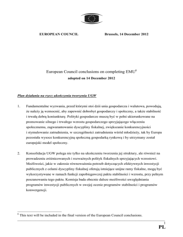 EUROPEA COUCIL Brussels, 14 December 2012 European Council conclusions on completing EMU1 adopted on 14 December 2012 Plan działania na rzecz ukończenia tworzenia UGW 1. Fundamentalne wyzwania, przed którymi stoi dziś unia gospodarcza i walutowa, powodują, że należy ją wzmocnić, aby zapewnić dobrobyt gospodarczy i społeczny, a także stabilność i trwałą dobrą koniunkturę. Polityki gospodarcze muszą być w pełni ukierunkowane na promowanie silnego i trwałego wzrostu gospodarczego sprzyjającego włączeniu społecznemu, zagwarantowanie dyscypliny fiskalnej, zwiększanie konkurencyjności i stymulowanie zatrudnienia, w szczególności zatrudnienia wśród młodzieży, tak by Europa pozostała wysoce konkurencyjną społeczną gospodarką rynkową i by utrzymany został europejski model społeczny. 2. Konsolidacja UGW polega nie tylko na ukończeniu tworzenia jej struktury, ale również na prowadzeniu zróżnicowanych i rozważnych polityk fiskalnych sprzyjających wzrostowi. Możliwości, jakie w zakresie równoważenia potrzeb dotyczących efektywnych inwestycji publicznych z celami dyscypliny fiskalnej oferują istniejące unijne ramy fiskalne, mogą być wykorzystywane w ramach funkcji zapobiegawczej paktu stabilności i wzrostu, przy pełnym poszanowaniu tego paktu. Komisja bada obecnie dalsze możliwości uwzględniania programów inwestycji publicznych w swojej ocenie programów stabilności i programów konwergencji. 1 This text will be included in the final version of the European Council conclusions. ________________________________________________________________________________ 1 PL 3. W następstwie przedstawionego w październiku 2012 r. sprawozdania okresowego przewodniczący Rady Europejskiej sporządził – w ścisłej współpracy z przewodniczącym Komisji, prezesem Europejskiego Banku Centralnego i przewodniczącym Eurogrupy – konkretny harmonogram działań prowadzących do urzeczywistnienia prawdziwej unii gospodarczej i walutowej. Rada Europejska odnotowuje przedstawiony przez Komisję plan działania na rzecz UGW, w którym zawarto kompleksową analizę odnośnych zagadnień oraz ocenę ich aspektów prawnych. Odnotowuje również wkład Parlamentu Europejskiego. Rada Europejska określa kolejne kroki na drodze do ukończenia tworzenia UGW, w oparciu o pogłębioną integrację i większą solidarność państw członkowskich strefy euro. 4. Proces ukończenia tworzenia UGW będzie się opierał na ramach instytucjonalnych i prawnych UE. Będzie charakteryzował się otwartością i przejrzystością względem państw członkowskich, które nie używają jednej waluty. Na wszystkich etapach proces ten cechować będzie pełne poszanowanie integralności jednolitego rynku, w tym w poszczególnych wnioskach ustawodawczych, które zostaną przedstawione. Istotne jest również, by zapewnić równe szanse tym państwom członkowskim, które uczestniczą w jednolitym mechanizmie nadzorczym, i tym, które w nim nie uczestniczą. 5. Najpilniejszym priorytetem jest ukończenie prac nad ramami na rzecz wzmocnionego zarządzania gospodarczego i wdrożenie tych ram, które obejmują: „sześciopak”, traktat o stabilności, koordynacji i zarządzaniu oraz „dwupak”. W związku ze znacznymi postępami, jakie poczyniono w odniesieniu do głównych elementów „dwupaku”, Rada Europejska wzywa do jego szybkiego przyjęcia przez współprawodawców. 6. Równie pilna jest potrzeba poczynienia postępów w kierunku bardziej zintegrowanych ram finansowych, które pomogą przywrócić normalne kredytowanie, zwiększyć konkurencyjność i ułatwić wprowadzenie niezbędnych korekt w naszych gospodarkach. 7. Jednolity mechanizm nadzorczy stanowi istotny krok jakościowy w kierunku bardziej zintegrowanych ram finansowych. Rada Europejska z zadowoleniem przyjmuje kompromis wypracowany przez Radę w dniu 13 grudnia i wzywa współprawodawców do szybkiego osiągnięcia porozumienia, tak by mechanizm ten mógł zostać wdrożony możliwie najszybciej. Ponownie podkreśla również znaczenie nowych przepisów – stanowiących najwyższy priorytet w kontekście opracowania jednolitego zbioru przepisów – dotyczących wymogów kapitałowych dla banków (rozporządzenie w sprawie wymogów kapitałowych i dyrektywa w sprawie wymogów kapitałowych) oraz wzywa wszystkie strony do wypracowania porozumienia w sprawie tych przepisów i ich szybkiego przyjęcia. ________________________________________________________________________________ 2 PL 8. Rada Europejska wzywa współprawodawców do tego, by przed czerwcem 2013 r. osiągnęli porozumienie co do wniosków dotyczących dyrektywy w sprawie naprawy oraz restrukturyzacji i uporządkowanej likwidacji oraz dyrektywy w sprawie systemu gwarantowania depozytów; Rada ze swojej strony powinna osiągnąć porozumienie przed końcem marca 2013 r. Po tym, jak dyrektywy te zostaną przyjęte, państwa członkowskie powinny potraktować ich wdrożenie jako priorytet. 9. Rada Europejska oczekuje szybkiego podjęcia przez Komisję działań następczych w związku z propozycjami grupy ekspertów wysokiego szczebla dotyczącymi struktury unijnego sektora bankowego. 10. Istnieje bezwzględna potrzeba przerwania błędnego koła, w jakim znalazły się banki i państwa. Zgodnie z oświadczeniem złożonym w czerwcu 2012 r. na szczycie państw strefy euro oraz konkluzjami z posiedzenia Rady Europejskiej w październiku 2012 r., porozumienie w sprawie ram operacyjnych, w tym w sprawie definicji aktywów odziedziczonych (legacy assets), należy osiągnąć jak najszybciej w pierwszej połowie 2013 r., tak by – gdy powstanie skuteczny jednolity mechanizm nadzorczy – Europejski Mechanizm Stabilności miał możliwość, w drodze zwykłej decyzji, bezpośredniego dokapitalizowywania banków. Proces ten będzie prowadzony w pełnej zgodności z zasadami jednolitego rynku. 11. W sytuacji gdy nadzór bankowy zostaje faktycznie prze