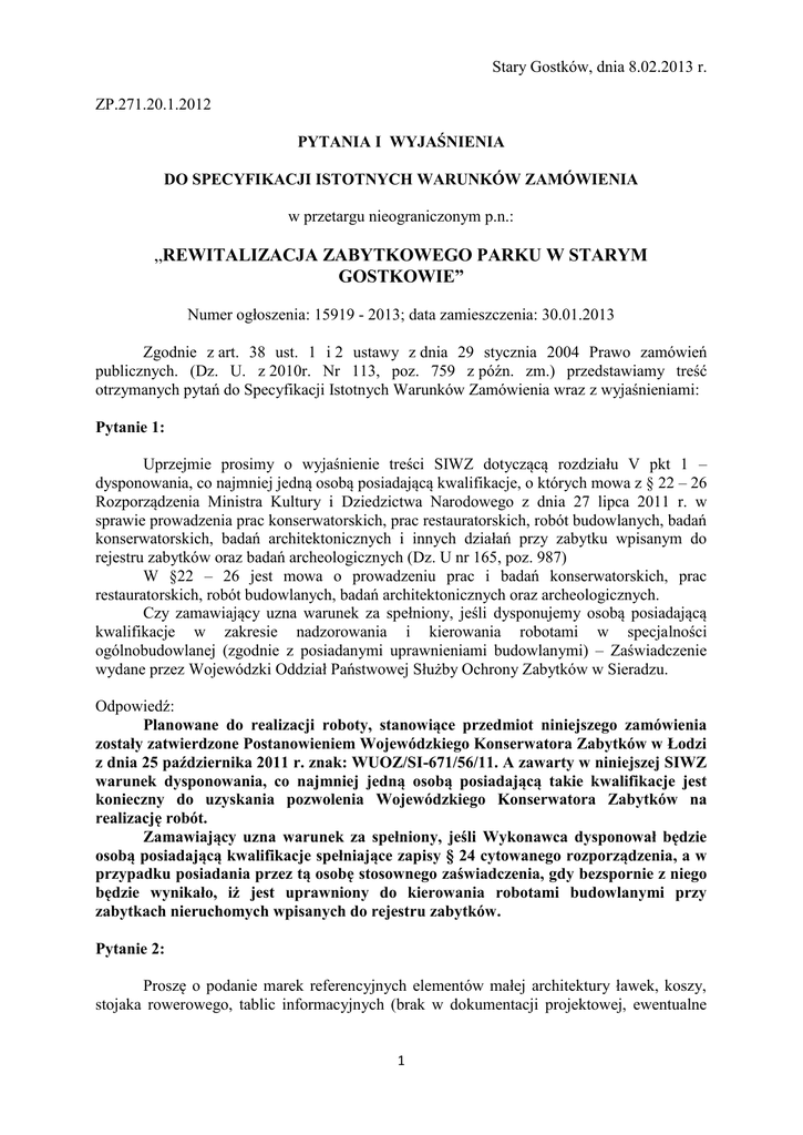 Stary Gostków, dnia 8.02.2013 r. ZP.271.20.1.2012 PYTANIA I WYJAŚNIENIA DO SPECYFIKACJI ISTOTNYCH WARUNKÓW ZAMÓWIENIA w przetargu nieograniczonym p.n.: „REWITALIZACJA ZABYTKOWEGO PARKU W STARYM GOSTKOWIE” Numer ogłoszenia: 15919 - 2013; data zamieszczenia: 30.01.2013 Zgodnie z art. 38 ust. 1 i 2 ustawy z dnia 29 stycznia 2004 Prawo zamówień publicznych. (Dz. U. z 2010r. Nr 113, poz. 759 z późn. zm.) przedstawiamy treść otrzymanych pytań do Specyfikacji Istotnych Warunków Zamówienia wraz z wyjaśnieniami: Pytanie 1: Uprzejmie prosimy o wyjaśnienie treści SIWZ dotyczącą rozdziału V pkt 1 – dysponowania, co najmniej jedną osobą posiadającą kwalifikacje, o których mowa z § 22 – 26 Rozporządzenia Ministra Kultury i Dziedzictwa Narodowego z dnia 27 lipca 2011 r. w sprawie prowadzenia prac konserwatorskich, prac restauratorskich, robót budowlanych, badań konserwatorskich, badań architektonicznych i innych działań przy zabytku wpisanym do rejestru zabytków oraz badań archeologicznych (Dz. U nr 165, poz. 987) W §22 – 26 jest mowa o prowadzeniu prac i badań konserwatorskich, prac restauratorskich, robót budowlanych, badań architektonicznych oraz archeologicznych. Czy zamawiający uzna warunek za spełniony, jeśli dysponujemy osobą posiadającą kwalifikacje w zakresie nadzorowania i kierowania robotami w specjalności ogólnobudowlanej (zgodnie z posiadanymi uprawnieniami budowlanymi) – Zaświadczenie wydane przez Wojewódzki Oddział Państwowej Służby Ochrony Zabytków w Sieradzu. Odpowiedź: Planowane do realizacji roboty, stanowiące przedmiot niniejszego zamówienia zostały zatwierdzone Postanowieniem Wojewódzkiego Konserwatora Zabytków w Łodzi z dnia 25 października 2011 r. znak: WUOZ/SI-671/56/11. A zawarty w niniejszej SIWZ warunek dysponowania, co najmniej jedną osobą posiadającą takie kwalifikacje jest konieczny do uzyskania pozwolenia Wojewódzkiego Konserwatora Zabytków na realizację robót. Zamawiający uzna warunek za spełniony, jeśli Wykonawca dysponował będzie osobą posiadającą kwalifikacje spełniające zapisy § 24 cytowanego rozporządzenia, a w przypadku posiadania przez tą osobę stosownego zaświadczenia, gdy bezspornie z niego będzie wynikało, iż jest uprawniony do kierowania robotami budowlanymi przy zabytkach nieruchomych wpisanych do rejestru zabytków. Pytanie 2: Proszę o podanie marek referencyjnych elementów małej architektury ławek, koszy, stojaka rowerowego, tablic informacyjnych (brak w dokumentacji projektowej, ewentualne 1 zdjęcia jak mają te elementy wyglądać, tablic informacyjnych o takich parametrów może być wiele rodzajów, podobnie kosze, stojak rowerowy, projektant powinien określić rodzaj, wygląd elementów z uwagi na zabytkowy charakter miejsca) Odpowiedź: W dniu 05.02.2013 r. na stronie internetowej Zamawiającego zostały zamieszczone dodatkowe rys. przedstawiające elementy małej architektury. Informujemy ponadto, iż ze względu na wskazanie w dokumentacji projektowej znaków towarowych oraz nazw producentów, zgodnie z art. 29 ust. 3 ustawy z dnia 29 stycznia 2004 Prawo zamówień publicznych. (Dz. U. z 2010r. Nr 113, poz. 759 z późn. zm.), Zamawiający w niniejszym postępowaniu dopuszcza zastosowanie materiałów równoważnych. Wszelkie materiały określone w dokumentacji, pochodzące od konkretnych producentów w tym stanowiące przedmiot w/w pytania, określają minimalne parametry techniczne, jakościowe i cechy użytkowe, jakim muszą odpowiadać urządzenia i materiały, aby spełnić wymagania stawiane przez Zamawiającego. Za materiały równoważne proponowany przez Wykonawcę Zamawiający uzna te, które posiadają takie same lub korzystniejsze parametry techniczne i jakościowe. Dokładniejsze informacje zostały zawarte w zał. Nr 11 do SIWZ „Tabela równoważności”. Pytanie 3: Proszę o podanie parametrów wielkościowych nasadzeń roślinnych (krzewów) Odpowiedź: 1. 2. 3. 4. 5. 6. 7. 8. 9. Bukszpan Wieczniezielony „Blauer Heinz” – 10 – 15 cm., Ø 40 cm.; Trzmielina „ Fortune a Gold” – 15 – 20 cm.; Różaneczniki Miniaturowe „Amethyst” „Billy Nowinka” – 30 – 40 cm. Irga Pozioma „Perpusillus” – 20 – 30 cm. Barwinek Pospolity – 10 – 20 cm. Irga „Ursynów” – 20 – 30 cm. Różanecznik „Helsinki University” – 80 – 10 cm.; Żywopłot Bukszpan – 30 – 40 cm.; Żywopłot budowy - 120 – 130 cm. Pytanie 4: Proszę o podanie wytycznych dotyczących płotków i palików (rysunki, wytyczne) Odpowiedź: Parametry techniczne płotków z palików – 6 x 40 cm. Pytanie 5: Proszę o podanie frakcji granitu łamanego Odpowiedź: 2 Należy zastosować granit frakcji 8 – 16 mm. Pytanie 6: Proszę o podanie informacji na temat altany rodzinnej (materiał, szczegóły, detale wykonania, sposób posadowienia, kolor, pokrycie drewna itp.) Odpowiedź: Według załączonych do dokumentacji rysunków i zdjęcia, Zamawiający przewiduje montaż gotowej zakupionej altanki dostępnej na rynku. Pytanie 7: Czy pod wybrukowaną powierzchnię pod ognisko należy wycenić podbudowę, jeśli tak to, o jakiej konstrukcji? Odpowiedź: Bruk należy ułożyć na podsypce piaskowej i zaspoinować materiałem cementowo piaskowym Pytanie 8: Jaką stawkę VAT przewiduje Inwestor na wykonanie usługi? Odpowiedź: Przepisy ustawy z dnia 29 stycznia 2004 r. Prawo zamówień publicznych (Dz. U. z 2010r. Nr 113, poz. 759 z późn. zm.), odwołując się do pojęcia ceny w rozumieniu przepisów ustawy z dnia 5 lipca 2001 r. o cenach (Dz. U nr 97, poz. 1050 ze zm.) przesądzają, iż uczestnicy postępowania o udzielenie zamówienia publicznego muszą uwzględnić w swoich ofertach także podatek należny od danego towaru lub usługi będących przedmiotem zamówienia publicznego. Wobec powyższego określenie stawki VAT jest obowiązkiem Wykonawcy. Powyższe odpowiedzi nie stanowią zmiany treści SIWZ 3