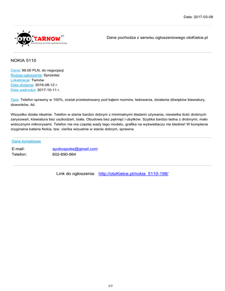 Data: 2017-03-08 Dane pochodza z serwisu ogloszeniowego otoKielce.pl NOKIA 5110 Cena: 99.00 PLN, do negocjacji Rodzaj ogłoszenia: Sprzedaz Lokalizacja: Tarnów Data dodania: 2016-08-12 r. Data ważności: 2017-10-11 r. Opis: Telefon sprawny w 100%, został przetestowany pod kątem rozmów, ładowania, działania dźwięków klawiatury, dzwonków, itd. Wszystko działa idealnie. Telefon w stanie bardzo dobrym z minimalnymi śladami używania, niewielka ilość drobnych zarysowań, klawiatura bez uszkodzeń, biała. Obudowa bez pęknięć i ubytków. Szybka bardzo ładna z drobnymi, mało widocznymi mikrorysami. Telefon nie ma częstej wady tego modelu, grafika na wyświetlaczu nie blednie! W komplecie oryginalna bateria Nokia, tzw. cieńka wizualnie w stanie dobrym, sprawna Dane kontaktowe E-mail: Telefon: [email protected] 602-690-964 Link do ogłoszenia: http://otoKielce.pl/nokia_5110-198/ 1/1