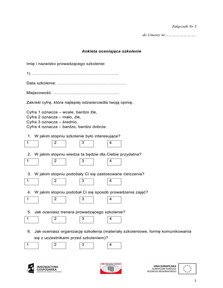 Załącznik Nr 3 do Umowy nr…………………….. Ankieta oceniająca szkolenie Imię i nazwisko prowadzącego szkolenie: 1) …………………………………………………….. Data szkolenia: …………………………………………. Miejscowość: ……………………………………….. Zakreśl cyfrę, która najlepiej odzwierciedla twoją opinię. Cyfra Cyfra Cyfra Cyfra 1 2 3 4 oznacza oznacza oznacza oznacza – – – – wcale, bardzo źle, mało, źle, średnio, bardzo, bardzo dobrze. 1. W jakim stopniu szkolenie było interesujące? 1 2 3 4 2. W jakim stopniu wiedza ta będzie dla Ciebie przydatna? 1 2 3 4 3. W jakim stopniu podobały Ci się zastosowane ćwiczenia? 1 2 3 4 4. W jakim stopniu podobał Ci się sposób prowadzenia zajęć? 1 2 3 4 5. Jak oceniasz trenera prowadzącego szkolenie? 1 2 3 4 6. Jak oceniasz organizację szkolenia (materiały szkoleniowe, formę komunikowania się z uczestnikami przed szkoleniem)? 1 2 3 4 1 7. W jakim stopniu szkolenie spełniło Twoje oczekiwania? 1 2 3 4 8. Jakie tematy były dla Ciebie najbardziej użyteczne? …………………………………………………………………………………………………………… …………………........................................................................................................................... …………………………………………………………………………………………………………… …………………........................................................................................................................... 9. Jakie tematy były dla Ciebie najmniej użyteczne? …………………………………………………………………………………………………………… …………………............................................... …………………………………………………………………………………………………………… …………………............................................... 10. Jakie zmiany powinny być wprowadzone (w kwestii merytorycznej i organizacyjnej szkolenia)? …………………………………………………………………………………………………………… …………………............................................... …………………………………………………………………………………………………………… …………………............................................... 2