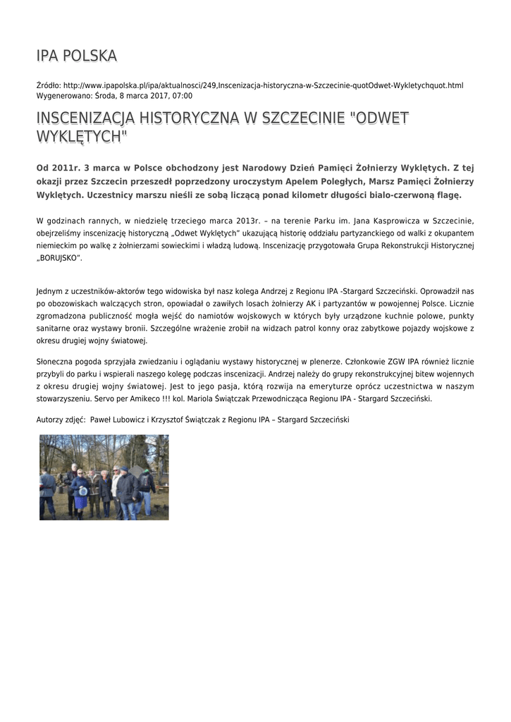 IPA POLSKA Źródło: http://www.ipapolska.pl/ipa/aktualnosci/249,Inscenizacja-historyczna-w-Szczecinie-quotOdwet-Wykletychquot.html Wygenerowano: Środa, 8 marca 2017, 07:00 INSCENIZACJA HISTORYCZNA W SZCZECINIE "ODWET WYKLĘTYCH" Od 2011r. 3 marca w Polsce obchodzony jest Narodowy Dzień Pamięci Żołnierzy Wyklętych. Z tej okazji przez Szczecin przeszedł poprzedzony uroczystym Apelem Poległych, Marsz Pamięci Żołnierzy Wyklętych. Uczestnicy marszu nieśli ze sobą liczącą ponad kilometr długości bialo-czerwoną flagę. W godzinach rannych, w niedzielę trzeciego marca 2013r. – na terenie Parku im. Jana Kasprowicza w Szczecinie, obejrzeliśmy inscenizację historyczną „Odwet Wyklętych” ukazującą historię oddziału partyzanckiego od walki z okupantem niemieckim po walkę z żołnierzami sowieckimi i władzą ludową. Inscenizację przygotowała Grupa Rekonstrukcji Historycznej „BORUJSKO”. Jednym z uczestników-aktorów tego widowiska był nasz kolega Andrzej z Regionu IPA -Stargard Szczeciński. Oprowadził nas po obozowiskach walczących stron, opowiadał o zawiłych losach żołnierzy AK i partyzantów w powojennej Polsce. Licznie zgromadzona publiczność mogła wejść do namiotów wojskowych w których były urządzone kuchnie polowe, punkty sanitarne oraz wystawy bronii. Szczególne wrażenie zrobił na widzach patrol konny oraz zabytkowe pojazdy wojskowe z okresu drugiej wojny światowej. Słoneczna pogoda sprzyjała zwiedzaniu i oglądaniu wystawy historycznej w plenerze. Członkowie ZGW IPA również licznie przybyli do parku i wspierali naszego kolegę podczas inscenizacji. Andrzej należy do grupy rekonstrukcyjnej bitew wojennych z okresu drugiej wojny światowej. Jest to jego pasja, którą rozwija na emeryturze oprócz uczestnictwa w naszym stowarzyszeniu. Servo per Amikeco !!! kol. Mariola Świątczak Przewodnicząca Regionu IPA - Stargard Szczeciński. Autorzy zdjęć: Paweł Lubowicz i Krzysztof Świątczak z Regionu IPA – Stargard Szczeciński Ocena: 0/5 (0) Tweetnij IPA Stargard Szczeciński