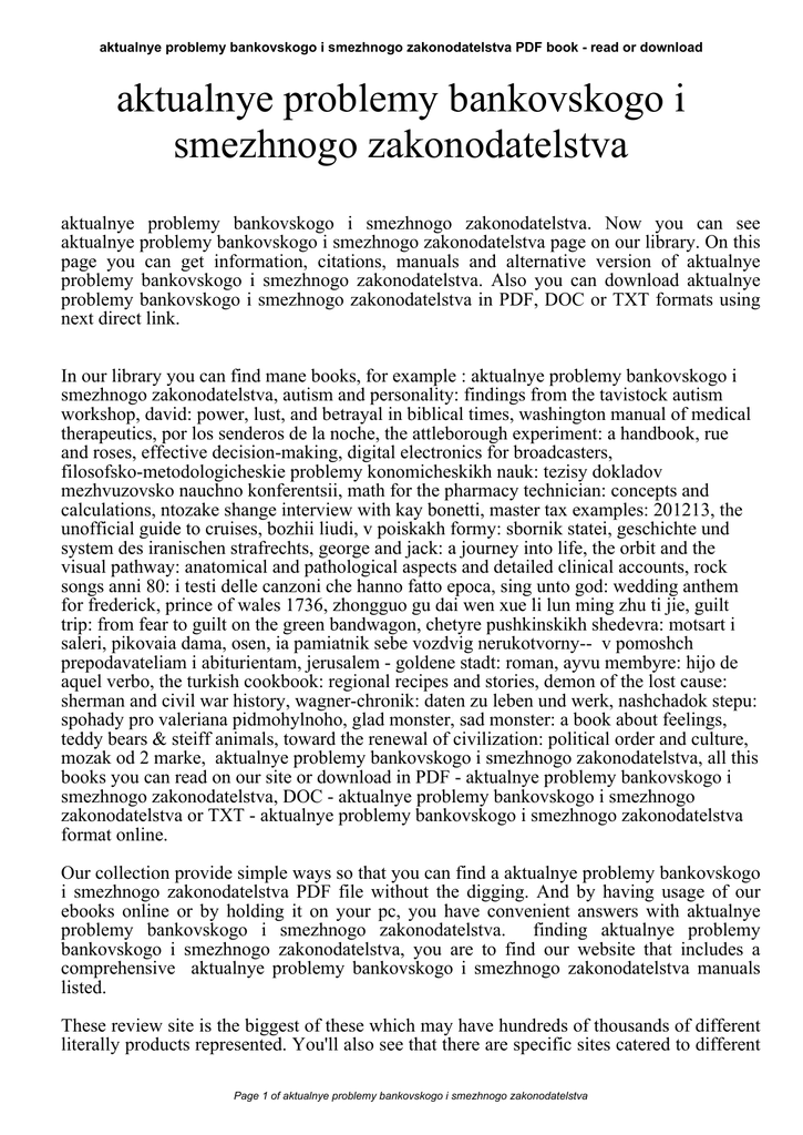 aktualnye problemy bankovskogo i smezhnogo zakonodatelstva PDF book - read or download aktualnye problemy bankovskogo i smezhnogo zakonodatelstva aktualnye problemy bankovskogo i smezhnogo zakonodatelstva. Now you can see aktualnye problemy bankovskogo i smezhnogo zakonodatelstva page on our library. On this page you can get information, citations, manuals and alternative version of aktualnye problemy bankovskogo i smezhnogo zakonodatelstva. Also you can download aktualnye problemy bankovskogo i smezhnogo zakonodatelstva in PDF, DOC or TXT formats using next direct link. In our library you can find mane books, for example : aktualnye problemy bankovskogo i smezhnogo zakonodatelstva, autism and personality: findings from the tavistock autism workshop, david: power, lust, and betrayal in biblical times, washington manual of medical therapeutics, por los senderos de la noche, the attleborough experiment: a handbook, rue and roses, effective decision-making, digital electronics for broadcasters, filosofsko-metodologicheskie problemy konomicheskikh nauk: tezisy dokladov mezhvuzovsko nauchno konferentsii, math for the pharmacy technician: concepts and calculations, ntozake shange interview with kay bonetti, master tax examples: 201213, the unofficial guide to cruises, bozhii liudi, v poiskakh formy: sbornik statei, geschichte und system des iranischen strafrechts, george and jack: a journey into life, the orbit and the visual pathway: anatomical and pathological aspects and detailed clinical accounts, rock songs anni 80: i testi delle canzoni che hanno fatto epoca, sing unto god: wedding anthem for frederick, prince of wales 1736, zhongguo gu dai wen xue li lun ming zhu ti jie, guilt trip: from fear to guilt on the green bandwagon, chetyre pushkinskikh shedevra: motsart i saleri, pikovaia dama, osen, ia pamiatnik sebe vozdvig nerukotvorny-- v pomoshch prepodavateliam i abiturientam, jerusalem - goldene stadt: roman, ayvu membyre: hijo de aquel verbo, the turkish cookbook: regional recipes and stories, demon of the lost cause: sherman and civil war history, wagner-chronik: daten zu leben und werk, nashchadok stepu: spohady pro valeriana pidmohylnoho, glad monster, sad monster: a book about feelings, teddy bears & steiff animals, toward the renewal of civilization: political order and culture, mozak od 2 marke, aktualnye problemy bankovskogo i smezhnogo zakonodatelstva, all this books you can read on our site or download in PDF - aktualnye problemy bankovskogo i smezhnogo zakonodatelstva, DOC - aktualnye problemy bankovskogo i smezhnogo zakonodatelstva or TXT - aktualnye problemy bankovskogo i smezhnogo zakonodatelstva format online. Our collection provide simple ways so that you can find a aktualnye problemy bankovskogo i smezhnogo zakonodatelstva PDF file without the digging. And by having usage of our ebooks online or by holding it on your pc, you have convenient answers with aktualnye problemy bankovskogo i smezhnogo zakonodatelstva. finding aktualnye problemy bankovskogo i smezhnogo zakonodatelstva, you are to find our website that includes a comprehensive aktualnye problemy bankovskogo i smezhnogo zakonodatelstva manuals listed. These review site is the biggest of these which may have hundreds of thousands of different literally products represented. You'll also see that there are specific sites catered to different Page 1 of aktualnye problemy bankovskogo i smezhnogo zakonodatelstva aktualnye problemy bankovskogo i smezhnogo zakonodatelstva PDF book - read or download product types or categories, brands or niches related with aktualnye problemy bankovskogo i smezhnogo zakonodatelstva. So depending on what exactly you are searching, you will be able to choose ebooks aktualnye problemy bankovskogo i smezhnogo zakonodatelstva to fit your own needs, aktualnye problemy bankovskogo i smezhnogo zakonodatelstva. Page 2 of aktualnye problemy bankovskogo i smezhnogo zakonodatelstva
