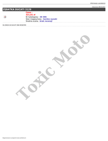 Informacje o produkcie Utworzono 08-03-2017 ZĘBATKA DUCATI 3129 Cena : 321,01 zł Nr katalogowy : SK 006 Stan magazynowy : bardzo wysoki Średnia ocena : brak recenzji To xi c M ot o 50-29020-36 DUCATI 996 MONSTER Wygenerowano w programie www.oscGold.com