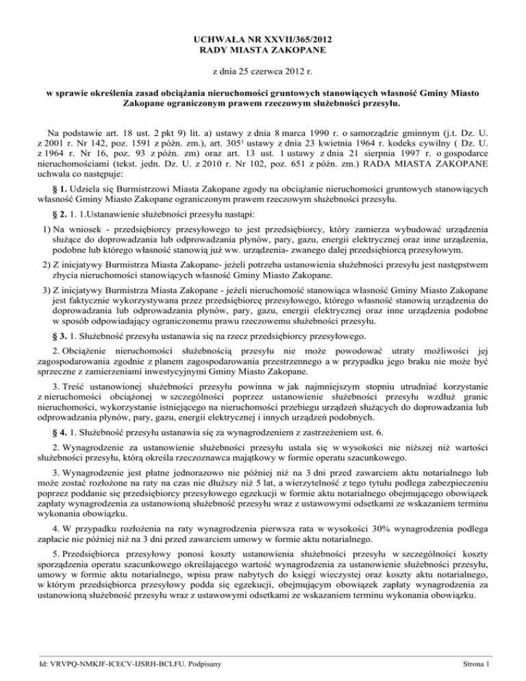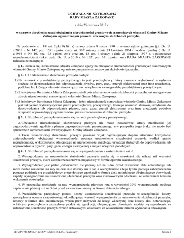 UCHWAŁA NR XXVII/365/2012 RADY MIASTA ZAKOPANE z dnia 25 czerwca 2012 r. w sprawie określenia zasad obciążania nieruchomości gruntowych stanowiących własność Gminy Miasto Zakopane ograniczonym prawem rzeczowym służebności przesyłu. Na podstawie art. 18 ust. 2 pkt 9) lit. a) ustawy z dnia 8 marca 1990 r. o samorządzie gminnym (j.t. Dz. U. z 2001 r. Nr 142, poz. 1591 z późn. zm.), art. 3051 ustawy z dnia 23 kwietnia 1964 r. kodeks cywilny ( Dz. U. z 1964 r. Nr 16, poz. 93 z póżn. zm) oraz art. 13 ust. 1 ustawy z dnia 21 sierpnia 1997 r. o gospodarce nieruchomościami (tekst. jedn. Dz. U. z 2010 r. Nr 102, poz. 651 z późn. zm.) RADA MIASTA ZAKOPANE uchwala co następuje: § 1. Udziela się Burmistrzowi Miasta Zakopane zgody na obciążanie nieruchomości gruntowych stanowiących własność Gminy Miasto Zakopane ograniczonym prawem rzeczowym służebności przesyłu. § 2. 1. 1.Ustanawienie służebności przesyłu nastąpi: 1) Na wniosek - przedsiębiorcy przesyłowego to jest przedsiębiorcy, który zamierza wybudować urządzenia służące do doprowadzania lub odprowadzania płynów, pary, gazu, energii elektrycznej oraz inne urządzenia, podobne lub którego własność stanowią już ww. urządzenia- zwanego dalej przedsiębiorcą przesyłowym. 2) Z inicjatywy Burmistrza Miasta Zakopane- jeżeli potrzeba ustanowienia służebności przesyłu jest następstwem zbycia nieruchomości stanowiących własność Gminy Miasto Zakopane. 3) Z inicjatywy Burmistrza Miasta Zakopane - jeżeli nieruchomość stanowiąca własność Gminy Miasto Zakopane jest faktycznie wykorzystywana przez przedsiębiorcę przesyłowego, którego własność stanowią urządzenia do doprowadzania lub odprowadzania płynów, pary, gazu, energii elektrycznej oraz inne urządzenia podobne w sposób odpowiadający ograniczonemu prawu rzeczowemu służebności przesyłu. § 3. 1. Służebność przesyłu ustanawia się na rzecz przedsiębiorcy przesyłowego. 2. Obciążenie nieruchomości służebnością przesyłu nie może powodować utraty możliwości jej zagospodarowania zgodnie z planem zagospodarowania przestrzennego a w przypadku jego braku nie może być sprzeczne z zamierzeniami inwestycyjnymi Gminy Miasto Zakopane. 3. Treść ustanowionej służebności przesyłu powinna w jak najmniejszym stopniu utrudniać korzystanie z nieruchomości obciążonej w szczególności poprzez ustanowienie służebności przesyłu wzdłuż granic nieruchomości, wykorzystanie istniejącego na nieruchomości przebiegu urządzeń służących do doprowadzania lub odprowadzania płynów, pary, gazu, energii elektrycznej i innych urządzeń podobnych. § 4. 1. Służebność przesyłu ustanawia się za wynagrodzeniem z zastrzeżeniem ust. 6. 2. Wynagrodzenie za ustanowienie służebności przesyłu ustala się w wysokości nie niższej niż wartości służebności przesyłu, którą określa rzeczoznawca majątkowy w formie operatu szacunkowego. 3. Wynagrodzenie jest płatne jednorazowo nie później niż na 3 dni przed zawarciem aktu notarialnego lub może zostać rozłożone na raty na czas nie dłuższy niż 5 lat, a wierzytelność z tego tytułu podlega zabezpieczeniu poprzez poddanie się przedsiębiorcy przesyłowego egzekucji w formie aktu notarialnego obejmującego obowiązek zapłaty wynagrodzenia za ustanowioną służebność przesyłu wraz z ustawowymi odsetkami ze wskazaniem terminu wykonania obowiązku. 4. W przypadku rozłożenia na raty wynagrodzenia pierwsza rata w wysokości 30% wynagrodzenia podlega zapłacie nie później niż na 3 dni przed zawarciem umowy w formie aktu notarialnego. 5. Przedsiębiorca przesyłowy ponosi koszty ustanowienia służebności przesyłu w szczególności koszty sporządzenia operatu szacunkowego określającego wartość wynagrodzenia za ustanowienie służebności przesyłu, umowy w formie aktu notarialnego, wpisu praw nabytych do księgi wieczystej oraz koszty aktu notarialnego, w którym przedsiębiorca przesyłowy podda się egzekucji, obejmującym obowiązek zapłaty wynagrodzenia za ustanowioną służebność przesyłu wraz z ustawowymi odsetkami ze wskazaniem terminu wykonania obowiązku. ————————————————————————————————————————————————————————— Id: VRVPQ-NMKJF-ICECV-IJSRH-BCLFU. Podpisany Strona 1 6. Obciążenie nieruchomości służebnością przesyłu może być ustanowione nieodpłatnie na rzecz przedsiębiorcy przesyłowego jeżeli z ustanowionej służebności będzie korzystać Gmina Miasto Zakopane lub gminne jednostki organizacyjne nie posiadających osobowości prawnej. § 5. 1. Umowa o ustanowienie służebności przesyłu, zawierana w formie aktu notarialnego każdorazowo będzie określać przebieg i treść służebności. 2. Informacja o ustanowieniu służebności przesyłu zostaje podana do publicznej wiadomości w formie stosownego zarządzenia Burmistrza Miasta Zakopane przed zawarciem aktu notarialnego. § 6. Obciążenie nieruchomości służebnością przesyłu na zasadach odmiennych wymaga odrębnej uchwały Rady Miasta Zakopane. § 7. Wykonanie Uchwały powierza się Burmistrzowi Miasta Zakopane. § 8. Uchwała wchodzi w życie po upływie 14 dni od dnia jej ogłoszenia w Dzienniku Urzędowym Województwa Małopolskiego. Przewodniczący Rady Jerzy Zacharko ————————————————————————————————————————————————————————— Id: VRVPQ-NMKJF-ICECV-IJSRH-BCLFU. Podpisany Strona 2