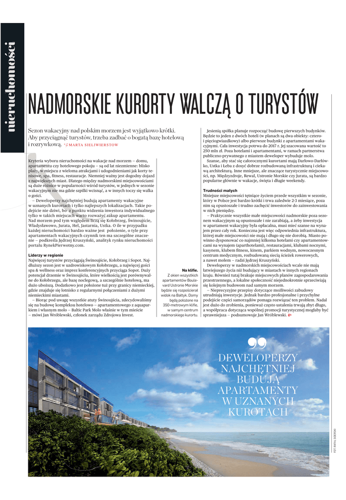 Sezon wakacyjny nad polskim morzem jest wyjątkowo krótki. Aby przyciągnąć turystów, trzeba zadbać o bogatą bazę hotelową i rozrywkową. M A RTA S I E L I W I E R S T O W k Kryteria wyboru nieruchomości na wakacje nad morzem — domu, apartamentu czy hotelowego pokoju — są od lat niezmienne: blisko plaży, w miejscu z wieloma atrakcjami i udogodnieniami jak korty tenisowe, spa, fitness, restauracje. Niemniej ważny jest dogodny dojazd z największych miast. Dlatego między nadmorskimi miejscowościami są duże różnice w popularności wśród turystów, w jednych w sezonie wakacyjnym nie ma gdzie szpilki wcisnąć, a w innych toczy się walka o gości. — Deweloperzy najchętniej budują apartamenty wakacyjne w uznanych kurortach i tylko najlepszych lokalizacjach. Takie podejście nie dziwi, bo z punktu widzenia inwestora indywidualnego tylko w takich miejscach warto rozważyć zakup apartamentu. Nad morzem pod tym względem liczą się Kołobrzeg, Świnoujście, Władysławowo, Jurata, Hel, Jastarnia, Ustka. O ile w przypadku każdej nieruchomości bardzo ważne jest położenie, o tyle przy apartamentach wakacyjnych czynnik ten ma szczególne znaczenie — podkreśla Jędrzej Kruszyński, analityk rynku nieruchomości portalu RynekPierwotny.com. Liderzy w regionie Najwięcej turystów przyciągają Świnoujście, Kołobrzeg i Sopot. Najdłuższy sezon jest w uzdrowiskowym Kołobrzegu, a najwięcej gości spa & wellness oraz imprez konferencyjnych przyciąga Sopot. Duży potencjał drzemie w Świnoujściu, które wielkością jest porównywalne do Kołobrzegu, ale bazę noclegową, a szczególnie hotelową, ma dużo uboższą. Dodatkowo jest położone tuż przy granicy niemieckiej, gdzie znajduje się lotnisko z regularnymi połączeniami z dużymi niemieckimi miastami. — Biorąc pod uwagę wszystkie atuty Świnoujścia, zdecydowaliśmy się na budowę kompleksu hotelowo — apartamentowego z aquaparkiem i własnym molo — Baltic Park Molo właśnie w tym mieście — mówi Jan Wróblewski, członek zarządu Zdrojowa Invest. Na klifie. Z okien wszystkich apartamentów Boulevard Ustronie Morskie będzie się rozpościerał widok na Bałtyk. Domy będą położone na 350-metrowym klifie, w samym centrum nadmorskiego kurortu. Jesienią spółka planuje rozpocząć budowę pierwszych budynków. Będzie to jeden z dwóch hoteli (w planach są dwa obiekty: czteroi pięciogwiazdkowy) albo pierwsze budynki z apartamentami wakacyjnymi. Cała inwestycja potrwa do 2017 r. Jej szacowana wartość to 250 mln zł. Poza hotelami i apartamentami, w ramach partnerstwa publiczno-prywatnego z miastem deweloper wybuduje molo. Szanse, aby stać się całorocznymi kurortami mają Darłowo-Darłówko, Ustka i Łeba z dosyć dobrze rozbudowaną infrastrukturą i ciekawą architekturą. Inne mniejsze, ale znaczące turystycznie miejscowości, np. Międzyzdroje, Rewal, Ustronie Morskie czy Jurata, są bardzo popularne głównie w wakacje, święta i długie weekendy. Trudności małych Mniejsze miejscowości tętniące życiem przede wszystkim w sezonie, który w Polsce jest bardzo krótki i trwa zaledwie 2-3 miesiące, poza nim są opustoszałe i trudno zachęcić inwestorów do zainwestowania w nich pieniędzy. — Praktycznie wszystkie małe miejscowości nadmorskie poza sezonem wakacyjnym są opustoszałe i nie zarabiają, a żeby inwestycja w apartament wakacyjny była opłacalna, musi mieć szanse na wynajem przez cały rok. Konieczna jest więc odpowiednia infrastruktura, której małe miejscowości nie mają i długo się nie dorobią. Miasto powinno dysponować co najmniej kilkoma hotelami czy apartamentowcami na wynajem (aparthotelami), restauracjami, klubami nocnymi, kasynem, klubem fitness, kinem, parkiem wodnym, nowoczesnym centrum medycznym, rozbudowaną siecią ścieżek rowerowych, a nawet molem — radzi Jędrzej Kruszyński. Deweloperzy w nadmorskich miejscowościach wcale nie mają łatwiejszego życia niż budujący w miastach w innych regionach kraju. Również tutaj brakuje miejscowych planów zagospodarowania przestrzennego, a lokalne społeczność niejednokrotnie sprzeciwiają się kolejnym budowom nad samym morzem. — Nieprecyzyjne przepisy dotyczące możliwości zabudowy utrudniają inwestycje. Jednak bardzo profesjonalne i przychylne podejście części samorządów pomaga rozwiązać ten problem. Nadal jest dużo do zrobienia, ponieważ często ustalenia trwają zbyt długo, a współpraca dotycząca wspólnej promocji turystycznej mogłaby być sprawniejsza — podsumowuje Jan Wróblewski. & DEWELOPERZY NAJCHĘTNIEJ BUDUJĄ APARTAMENTY W UZNANYCH KUROTACH FOT. RAFAŁ SIDERSKI nieruchomości NADMORSKIE KURORTY WALCZĄ O TURYSTÓW