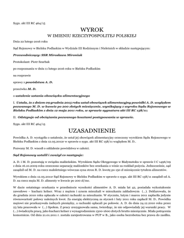 Sygn. akt III RC 464/15 WYROK W IMIENIU RZECZYPOSPOLITEJ POLSKIEJ Dnia 22 lutego 2016 roku Sąd Rejonowy w Bielsku Podlaskim w Wydziale III Rodzinnym i Nieletnich w składzie następującym: Przewodniczący: SSR Mirosława Mironiuk Protokolant: Piotr Szurbak po rozpoznaniu w dniu 11 lutego 2016 roku w Bielsku Podlaskim na rozprawie sprawy z powództwa A. D. przeciwko M. D. o ustalenie ustania obowiązku alimentacyjnego I. Ustala, że z dniem 09 grudnia 2015 roku ustał obowiązek alimentacyjny powódki A. D. względem pozwanego M. D. w kwocie po 200 złotych miesięcznie, wynikający z wyroku Sądu Rejonowego w Bielsku Podlaskim z dnia 12 maja 2011 roku, w sprawie sygnatura akt III RC 158/11; II. Odstępuje od obciążania pozwanego kosztami postępowania w sprawie. Sygn. akt III RC 464/15 UZASADNIENIE Powódka A. D. wystąpiła o ustalenie, że ustał jej obowiązek alimentacyjny orzeczony wyrokiem Sądu Rejonowego w Bielsku Podlaskim z dnia 12.05.2012r w sprawie o sygn. akt III RC 158/11 względem M. D.. Pozwany M. D. wnosił o oddalenie powództwa w całości. Sąd Rejonowy ustalił i zważył co następuje: A. D. i M. D. pozostają w związku małżeńskim. Wyrokiem Sądu Okręgowego w Białymstoku w sprawie I C 1496/09 z dnia 16.10.2009 roku orzeczono separację małżonków bez orzekania o winie za rozkład pożycia. Jednocześnie, sąd zasądził od M. D. na rzecz małoletniego wówczas syna stron R. D. kwotę po 150 zł miesięcznie tytułem alimentów. Wyrokiem z dnia 12.05.2011r Sąd Rejonowy w Bielsku Podlaskim w sprawie o sygn. akt III RC 158/11 zasądził od A. D. na rzecz męża M. D. alimenty w kwocie po 200 zł/mc. W dacie ostatniego orzekania w przedmiocie wysokości alimentów A. D. miała lat 42, posiadała wykształcenie zawodowe – kucharz kelner. Wraz z mężem i synem mieszkali w mieszkaniu zakładowym (...). Deklarowała, że do grudnia 2010 roku opłacała w całości rachunki za mieszkanie. W styczniu, lutym i marcu 2011 zapłaciła jedynie równowartość połowy należnych kwot. Za energię elektryczną za styczeń i luty 2011 roku zapłacił M. D.. Powódka mężowi nie przekazywała żadnych pieniędzy, a rachunki opłacali po połowie. A. D. do dnia 24.12.2010 roku przez 23 lata pracowała w (...) Społem. Z pracy zrezygnowała sama, twierdząc, że nie odpowiadały jej warunki pracy. W (...) świadczyła pracę, jako kucharz kelner z wynagrodzeniem 1500-1600 złotych brutto miesięcznie. Miała potrącenia komornicze. Od dnia 21.01.2011 r. została zarejestrowana w PUP w B., jako osoba bezrobotna bez prawa do zasiłku. Utrzymywała się z prac dorywczych. Korzystała z pomocy opieki społecznej, otrzymując do końca maja 2011r zasiłek okresowy w wysokości 350 złotych. Nie miała żadnego majątku, posiada zadłużenia - dwa kredyty, rata spłaty wynosiła 360 zł miesięcznie. Była zdrowa. Dwukrotnie była na terapii odwykowej z powodu uzależnienia od alkoholu. Deklarowała, że za prace dorywcze otrzymywała ok. 600 złotych miesięcznie. M. D. miał lat 41, posiadał wykształcenie średnie i zawód technik budownictwa. Mieszkał razem z żoną i synem. Ponosił wspólnie z żoną koszty utrzymania mieszkania po połowie. Koszty utrzymania mieszkania wynosiły: czynsz 322 zł/ mc, energia 120 zł/mc, woda była wliczona w czynsz, gaz 55 zł/mc, telefon 50 zł./mc. M. D. nie pracował, posiada orzeczenie o niezdolności do pracy i niezdolności do samodzielnej egzystencji do września 2012 roku. Otrzymywał rentę w wysokości około 650 zł oraz zasiłek pielęgnacyjny w wysokości 170 zł/mc. Na rencie pozostawał od 1998 roku. Ponosił koszty leczenia i rehabilitacji. Miał zajęcia komornicze z powodu niespłaconych kredytów. Kwota potrąceń to 170 zł/mc. Innych źródeł dochodów nie posiadał. Był studentem IV roku prawa w W.. Otrzymywał z PFRON dofinansowanie do nauki - w wysokości 2500 zł na czesne za semestr i 600 zł na dojazdy na studia. Nie posiadał żadnego majątku poza samochodem marki V. (...) z 1991roku. Nie korzystał z pomocy opieki społecznej. Powyższe ustalono na podstawie akt sprawy III RC 158/11 Sądu Rejonowego w Bielsku Podlaskim. Zgodnie z art. 138 kro w razie zmiany stosunków można żądać zmiany orzeczenia lub umowy dotyczącej obowiązku alimentacyjnego. Przez zmianę stosunków należy rozumieć zarówno istotne zmniejszenie lub ustanie możliwości zarobkowych i majątkowych zobowiązanego do alimentacji, jak też istotne zwiększenie się usprawiedliwionych potrzeb uprawnionego, wskutek czego ustalony zakres obowiązku alimentacyjnego wymaga skorygowania przez stosowne zmniejszenie albo zwiększenie wysokości świadczeń alimentacyjnych. W niniejszej sprawie strony pozostawały w separacji. Podstawą orzeczenia obowiązku alimentacyjnego A. D. względem M. D. były przepisy: art. 614 §4 kro w zw. z art. 60 §1 kro. Zgodnie z treścią art. 614 §4 kro do obowiązku dostarczania środków utrzymania przez jednego z małżonków pozostających w separacji drugiemu stosuje się odpowiednio przepisy art. 60 kro, z wyjątkiem §3. Zgodnie z art. 60§1 kro małżonek rozwiedziony, który nie został uznany za wyłącznie winnego rozkładu pożycia i który znajduje się w niedostatku, może żądać od drugiego małżonka rozwiedzionego dostarczania środków utrzymania w zakresie odpowiadającym usprawiedliwionym potrzebom uprawnionego oraz możliwościom zarobkowym i majątkowym zobowiązanego. Rozstrzygając w niniejszej sprawie należało zatem ustalić czy i w jaki sposób zmieniły się przesłanki leżące u podstaw orzekania o obowiązku alimentacyjnym A. D. względem M. D., a w szczególności, czy utrzymuje się nadal po stronie pozwanego stan niedostatku oraz czy A. D. nadal posiadała możliwości zarobkowe i majątkowe do świadczenia alimentów w zakresie odpowiednim – do potrzeb pozwanego i swoich możliwości zarobkowych, Obecnie, powódka A. D. miała 47 lat. Z wyjaśnień powódki (k. 17