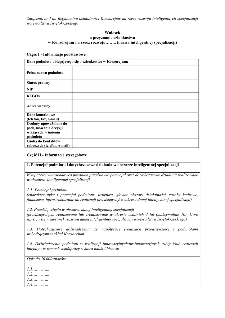 Załącznik nr I do Regulaminu działalności Konsorcjów na rzecz rozwoju inteligentnych specjalizacji województwa świętokrzyskiego Wniosek o przyznanie członkostwa w Konsorcjum na rzecz rozwoju…….. (nazwa inteligentnej specjalizacji) Część I - Informacje podstawowe Dane podmiotu ubiegającego się o członkostwo w Konsorcjum: Pełna nazwa podmiotu Status prawny NIP REGON Adres siedziby Dane kontaktowe (telefon, fax, e-mail) Osoba/y upoważnione do podejmowania decyzji wiążących w imieniu podmiotu Osoba do kontaktów roboczych (telefon, e-mail) Część II - Informacje szczegółowe 1. Potencjał podmiotu i dotychczasowe działania w obszarze inteligentnej specjalizacji W tej części wnioskodawca powinien przedstawić potencjał oraz dotychczasowe działania realizowane w obszarze inteligentnej specjalizacji. 1.1. Potencjał podmiotu (charakterystyka i potencjał podmiotu: struktura, główne obszary działalności, zasoby kadrowe, finansowe, infrastrukturalne do realizacji przedsięwzięć z zakresu danej inteligentnej specjalizacji). 1.2. Przedsięwzięcia w obszarze danej inteligentnej specjalizacji (przedsięwzięcia realizowane lub zrealizowane w okresie ostatnich 3 lat (maksymalnie 10), które wpisują się w kierunek rozwoju danej inteligentnej specjalizacji województwa świętokrzyskiego). 1.3. Dotychczasowe doświadczenia ze współpracy (realizacji przedsięwzięć) z podmiotami wchodzącymi w skład Konsorcjum 1.4. Doświadczenie podmiotu w realizacji innowacyjnych/proinnowacyjnych usług i/lub realizacji inicjatyw w ramach współpracy sektora nauki i biznesu. Opis do 10 000 znaków 1.1.…………. 1.2.…………. 1.3.………… 1.4.………… 2. Katalog planowanych działań wspierających rozwój inteligentnej specjalizacji (w tym koncepcja rozwoju i planowane przedsięwzięcia) W tej części wnioskodawca powinien przedstawić wkład podmiotu w realizację koncepcji rozwoju danej inteligentnej specjalizacji (przedstawionej w ramach Konkursu na wybór Konsorcjów na rzecz rozwoju inteligentnych specjalizacji województwa świętokrzyskiego) - w jaki sposób podmiot ubiegający się o członkostwo w Konsorcjum przyczyni się do rozwoju danej inteligentnej specjalizacji? Dodatkowo wnioskodawca powinien przedstawić planowane przedsięwzięcia w ramach programów zewnętrznych (regionalnych, krajowych i międzynarodowych) oraz środków własnych. 2.1. Bezpośredni wkład podmiotu w realizację koncepcji rozwoju danej inteligentnej specjalizacji Opis do 20 000 znaków 2.2. Planowane przedsięwzięcia Wnioskodawca wskazuje przedsięwzięcia, które miałyby być realizowane w ramach koncepcji rozwoju danej inteligentnej specjalizacji. Przedsięwziecia te powinny być opisane ze wskazaniem celów, zakładanych rezultatów, podmiotów, które będą je realizować oraz potencjalnych źródeł finansowania. Przedsięwzięcia mogą dotyczyć m.in. następujących obszarów: edukacji i rozwoju kapitału ludzkiego, infrastruktury badawczej, rozwoju innowacji, wsparcia ekspansji zagranicznej, itp. Nazwa projektu/ przedsięwzięcia Potencjalni realizatorzy projektu Potencjalni odbiorcy Źródło finansowania /program operacyjny Priorytet inwestycyjny Główne działania Cel projektu/ przedsięwzięcia Planowane wskaźniki/rezultaty Cel operacyjny RIS3 w który dany projekt się wpisuje Max. 10 przedsięwzięć Niniejszym potwierdzam prawdziwość danych i informacji przedstawionych w aplikacji o przyznanie członkostwa w Konsorcjum na rzecz rozwoju…….. (nazwa inteligentnej specjalizacji) Data i podpis osoby/osób upoważnionych do reprezentowania podmiotu ubiegającego się o przyznanie członkostwa. .................................................................................................................................................................... Opinia koordynatora Konsorcjum …………………………………………………………………………………………………………… …………………………………………………………………………………………………………… …………………………………………………………………………………………………………… …………………………………………………………………………………………………………… Data i podpis osoby/osób upoważnionych do reprezentowania Konsorcjum ……………………………………………………………………………………………………………