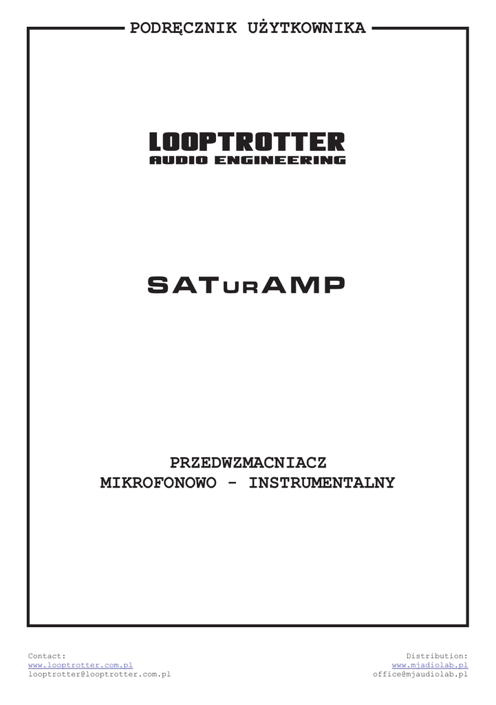 PODRĘCZNIK UŻYTKOWNIKA LOOPTROTTER AUDIO ENGINEERING S AT U R A M P PRZEDWZMACNIACZ MIKROFONOWO - INSTRUMENTALNY Contact: www.looptrotter.com.pl [email protected] Distribution: www.mjadiolab.pl [email protected] S AT U R A M P SATurAMP to jedyny na rynku przedwzmacniacz mikrofonowo instrumentalny zawierający autorski układ nasycenia w formacie rack 500. Dzięki temu unikalnemu połączeniu SATurAMP jest oryginalnym, uniwersalnym i kreatywnym narzędziem nadającym potężne i pełne detali brzmienie już w procesie rejestracji. SATurAMP posiada rozwiązania inspirowane konstrukcjami z lat 60tych, a także wiele autorskich, nowoczesnych rozwiązań, m.in.. cyfrowe sterowanie większością funkcji. To rozwiązanie pozwoliło wyeliminować mechaniczne przełączniki z toru sygnałowego, co w zdecydowany sposób wpłynęło na niezawodność i długowieczność SATurAMP. W miejsce mechanicznych przełączników użyte zostały hermetycznie zamknięte przekaźniki oraz przełączniki półprzewodnikowe. Na wejściu SATurAMP znajduje się transformator SOWTER produkowany na wzór AP2620, stosowany w legendarnych przedwzmacniaczach API. Za wzmocnienie odpowiada wzmacniacz operacyjny zbudowany całkowicie z elementów dyskretnych. Konstrukcja nawiązuje do wczesnych wzmacniaczy operacyjnych z lat 60tych. Natomiast rozwiązanie regulacji wzmocnienia to już XXI wiek - sterowane jest cyfrowo za pomocą mikro przycisków. Wartość wzmocnienia wyrażona w dB wskazywana jest na wyświetlaczu cyfrowym. SATurAMP wyposażony jest w filtr górno przepustowy o zboczu 12db/okt. Do wyboru są trzy częstotliwości odcięcia z trzema różnymi charakterystykami: 60Hz - Chebychev 100Hz - Butterworth 160Hz - Bessel Sercem SATurAMP jest autorskiej konstrukcji układ nasycenia, znany z Looptrotter SA2RATE, inspirowany brzmieniem starych magnetofonów oraz konsolet lampowych. W inteligentny i przyjazny dla ucha sposób zaokrągla wierzchołki sygnału dodając częstotliwości harmoniczne niskiego rzędu. Działa jak soft limiter, dzięki czemu jesteś w stanie nagrać ślady charakteryzujące się wysokim poziomem sygnału RMS, pozbawione niepożądanych przesterowań, bliskie, szczegółowe, nasycone, świetnie „siedzące” w miksie. Wejście instrumentalne zbudowane jest na tranzystorach dyskretnych pracujących w klasie A. Zastosowanie tranzystora FET umożliwiło zaprojektowanie układu, wzbogacającego sygnał o niewielką ilość częstotliwości harmonicznych parzystych, co korzystnie wpływa na brzmienie instrumentów podłączonych bezpośrednio do SATurAMP. Dotyczy to nie tylko gitar i gitar basowych. SATurAMP doskonale radzi sobie z cyfrowymi syntezatorami, nadając im ciepły, analogowy charakter. Ścieżka sygnałowa SATurAMP jest minimalistyczna, a użyte komponenty są starannie selekcjonowane pod kątem oryginalnego charakteru brzmieniowego sygnowanego logiem Looptrotter. SATurAMP prezentuje najwyższej jakości brzmienie połączone z oryginalnym analogowym charakterem. SATurAMP jest w 100% autorską konstrukcją i nie posiada odpowiedników zarówno analogowych jak i cyfrowych. Contact: www.looptrotter.com.pl [email protected] Distribution: www.mjadiolab.pl [email protected] S AT U R A M P SATurAMP w skrócie: ü przedwzmacniacz ze wzmocnieniem 66dB (gain 60dB + Output +6dB) ü wzmocnienie zrealizowane z elementów dyskretnych na wzmacniaczu operacyjnym zbudowanym ü regulacja wzmocnienia pozbawiona mechanicznych styków ü płynna regulacja poziomu wyjściowego potencjometrem OUTPUT ü gniazdo instrumentalne Hi-Z na panelu przednim (impedancja 1M om) zbudowane z elementów dyskretnych ü oryginalny układ nasycenia częstotliwościami harmonicznymi niskiego rzędu, działający także jako soft limiter ü dioda sygnalizująca przesterowanie sygnału ü 2 diody wskazujące poziom nasycenia sygnału (4% i 8% THD) ü 3 diody wskazujące poziom wyjściowy ü PAD -20 dB ü zasilanie phantom 48V ü zmiana polaryzacji ü filtr górnoprzepustowy 12db/okt z wybieraną częstotliwością odcięcia oraz charakterystyką: ü 60 Hz - Chebychev ü 100Hz - Butterworth ü 160 Hz - Bessel ü przycisk MUTE – wyciszający wyjście przedwzmacniacza ü transformator wejßciowy SOWTER w torze sygnałowym ü 100% autorska konstrukcja gwarantuje oryginalne unikalne brzmienie Contact: www.looptrotter.com.pl [email protected] Distribution: www.mjadiolab.pl [email protected] S AT U R A M P LOOPTROTTER AUDIO ENGINEERING Zasilanie 48V dla mikrofonów pojemnościowych i aktywnych Di-box’ów 48V INV. PAD 20dB PAD, obniża o 20dB sygnał zarówno MIC jak i HI-Z o 20dB Indicating signal clipping ! Zmniejszenie wzmocnienia Włączenie i wybór filtra Włączenie układu nasycenia. Głębokość nasycenia regulowana jest przez zmianę Gain. GAIN Zwiększenie wzmocnienia HPF 60 SAT. ON Wyciszenie wyjścia Płynna regulacja poziomu wyjściowego 100 160 4 Wskaźnik nasycenia sygnału 8 MUTE 4 5 OUT 6 3 7 18 8 2 9 1 0 Wejście instrumentalne HI-Z Przełącznik polaryzacji, odwraca fazę o 180 stopni Wskaźnik poziomu wyjściowego sygnału 0 18 10 INSTR. S AT U R A M P Contact: www.looptrotter.com.pl [email protected] Distribution: www.mjadiolab.pl [email protected] Contact: www.looptrotter.com.pl [email protected] 60Hz - Chebychev 160Hz - Bessel 100Hz - Butterworth -18dB 10Hz -15dB -12dB -9dB -6dB -3dB 0dB 3dB INSTRUMENT MICROPHONE / LINE 48V INV PAD 100Hz HPF PEAK GAIN 1kHz HPF FILTER SELECT CPU SATURATION - OFF 8 4 THD SATURATION CONTROL BUTT ONS 4%THD - 1dB REDUCTION OUTPUT MUTE 18 0 18 OUT OUTPUT 8%THD - 3dB REDUCTION IC S AT U R A M P Distribution: www.mjadiolab.pl [email protected] S AT U R A M P Contact: www.looptrotter.com.pl [email protected] Distribution: www.mjadiolab.pl [email protected]