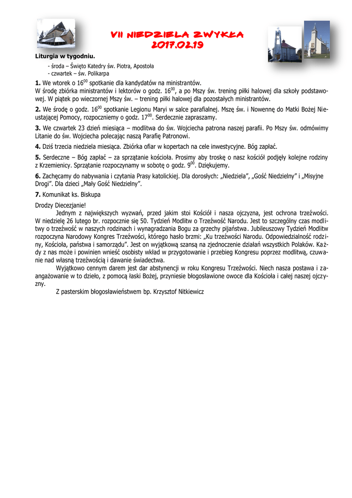 VII Niedziela ZWYKŁA 2017.02.19 Liturgia w tygodniu. - środa – Święto Katedry św. Piotra, Apostoła - czwartek – św. Polikarpa 1. We wtorek o 1600 spotkanie dla kandydatów na ministrantów. W środę zbiórka ministrantów i lektorów o godz. 1600, a po Mszy św. trening piłki halowej dla szkoły podstawowej. W piątek po wieczornej Mszy św. – trening piłki halowej dla pozostałych ministrantów. 2. We środę o godz. 1600 spotkanie Legionu Maryi w salce parafialnej. Mszę św. i Nowennę do Matki Bożej Nieustającej Pomocy, rozpoczniemy o godz. 17 00. Serdecznie zapraszamy. 3. We czwartek 23 dzień miesiąca – modlitwa do św. Wojciecha patrona naszej parafii. Po Mszy św. odmówimy Litanie do św. Wojciecha polecając naszą Parafię Patronowi. 4. Dziś trzecia niedziela miesiąca. Zbiórka ofiar w kopertach na cele inwestycyjne. Bóg zapłać. 5. Serdeczne – Bóg zapłać – za sprzątanie kościoła. Prosimy aby troskę o nasz kościół podjęły kolejne rodziny z Krzemienicy. Sprzątanie rozpoczynamy w sobotę o godz. 900. Dziękujemy. 6. Zachęcamy do nabywania i czytania Prasy katolickiej. Dla dorosłych: „Niedziela”, „Gość Niedzielny” i „Misyjne Drogi”. Dla dzieci „Mały Gość Niedzielny”. 7. Komunikat ks. Biskupa Drodzy Diecezjanie! Jednym z największych wyzwań, przed jakim stoi Kościół i nasza ojczyzna, jest ochrona trzeźwości. W niedzielę 26 lutego br. rozpocznie się 50. Tydzień Modlitw o Trzeźwość Narodu. Jest to szczególny czas modlitwy o trzeźwość w naszych rodzinach i wynagradzania Bogu za grzechy pijaństwa. Jubileuszowy Tydzień Modlitw rozpoczyna Narodowy Kongres Trzeźwości, którego hasło brzmi: „Ku trzeźwości Narodu. Odpowiedzialność rodz iny, Kościoła, państwa i samorządu”. Jest on wyjątkową szansą na zjednoczenie działań wszystkich Polaków. Ka żdy z nas może i powinien wnieść osobisty wkład w przygotowanie i przebieg Kongresu poprzez modlitwą, czuwanie nad własną trzeźwością i dawanie świadectwa. Wyjątkowo cennym darem jest dar abstynencji w roku Kongresu Trzeźwości. Niech nasza postawa i z aangażowanie w to dzieło, z pomocą łaski Bożej, przyniesie błogosławione owoce dla Kościoła i całej naszej ojczyzny. Z pasterskim błogosławieństwem bp. Krzysztof Nitkiewicz