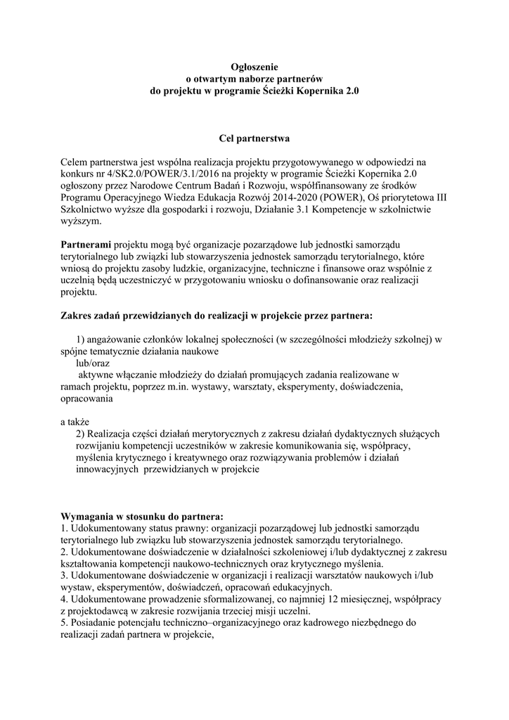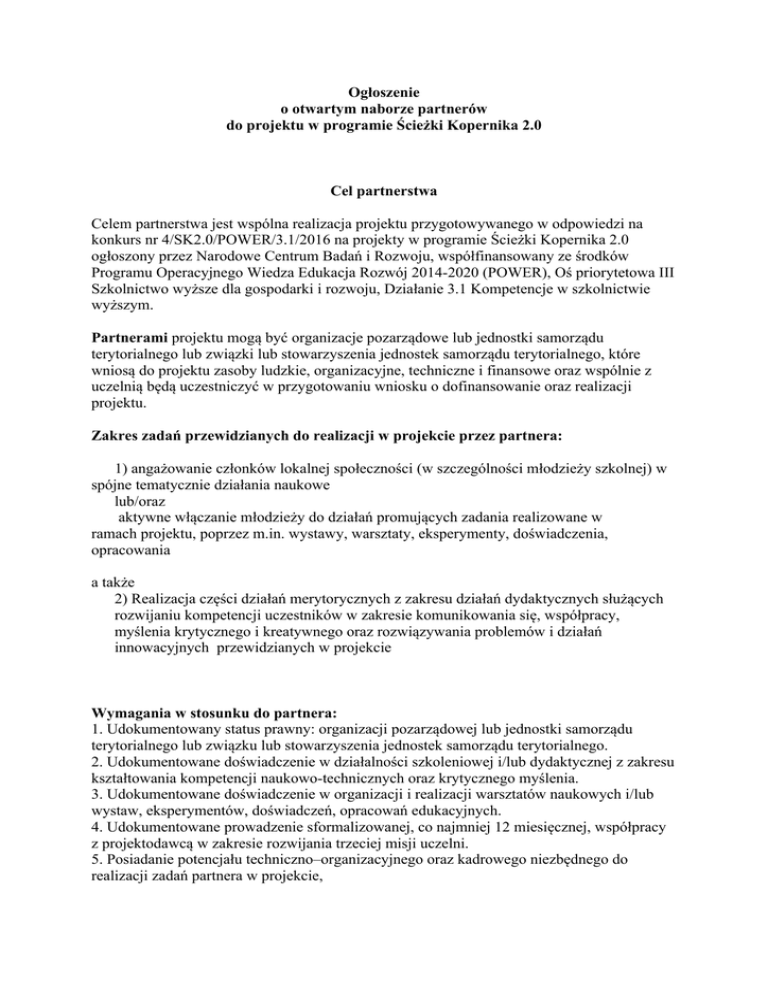 Ogłoszenie o otwartym naborze partnerów do projektu w programie Ścieżki Kopernika 2.0 Cel partnerstwa Celem partnerstwa jest wspólna realizacja projektu przygotowywanego w odpowiedzi na konkurs nr 4/SK2.0/POWER/3.1/2016 na projekty w programie Ścieżki Kopernika 2.0 ogłoszony przez Narodowe Centrum Badań i Rozwoju, współfinansowany ze środków Programu Operacyjnego Wiedza Edukacja Rozwój 2014-2020 (POWER), Oś priorytetowa III Szkolnictwo wyższe dla gospodarki i rozwoju, Działanie 3.1 Kompetencje w szkolnictwie wyższym. Partnerami projektu mogą być organizacje pozarządowe lub jednostki samorządu terytorialnego lub związki lub stowarzyszenia jednostek samorządu terytorialnego, które wniosą do projektu zasoby ludzkie, organizacyjne, techniczne i finansowe oraz wspólnie z uczelnią będą uczestniczyć w przygotowaniu wniosku o dofinansowanie oraz realizacji projektu. Zakres zadań przewidzianych do realizacji w projekcie przez partnera: 1) angażowanie członków lokalnej społeczności (w szczególności młodzieży szkolnej) w spójne tematycznie działania naukowe lub/oraz aktywne włączanie młodzieży do działań promujących zadania realizowane w ramach projektu, poprzez m.in. wystawy, warsztaty, eksperymenty, doświadczenia, opracowania a także 2) Realizacja części działań merytorycznych z zakresu działań dydaktycznych służących rozwijaniu kompetencji uczestników w zakresie komunikowania się, współpracy, myślenia krytycznego i kreatywnego oraz rozwiązywania problemów i działań innowacyjnych przewidzianych w projekcie Wymagania w stosunku do partnera: 1. Udokumentowany status prawny: organizacji pozarządowej lub jednostki samorządu terytorialnego lub związku lub stowarzyszenia jednostek samorządu terytorialnego. 2. Udokumentowane doświadczenie w działalności szkoleniowej i/lub dydaktycznej z zakresu kształtowania kompetencji naukowo-technicznych oraz krytycznego myślenia. 3. Udokumentowane doświadczenie w organizacji i realizacji warsztatów naukowych i/lub wystaw, eksperymentów, doświadczeń, opracowań edukacyjnych. 4. Udokumentowane prowadzenie sformalizowanej, co najmniej 12 miesięcznej, współpracy z projektodawcą w zakresie rozwijania trzeciej misji uczelni. 5. Posiadanie potencjału techniczno–organizacyjnego oraz kadrowego niezbędnego do realizacji zadań partnera w projekcie, 6. Doświadczenie w realizacji projektów współfinansowanych ze środków unijnych ze szczególnym uwzględnieniem problematyki przygotowywanego projektu Oferty składane przez potencjalnych partnerów powinny: 1. Zawierać dane zgłaszającego i osób uprawnionych do reprezentowania podmiotu oraz osoby do kontaktów w sprawie współpracy; 2. Zawierać krótki opis koncepcji realizacji zadań przez Partnera w ramach projektu oraz informacje na temat spełniania wymagań i kryteriów wyboru określonych w ogłoszeniu; 3. Zawierać opis zaangażowania Partnera w realizację projekt, w tym potencjał możliwy do wykorzystania. 4. Zawierać dokumentację spełniania wymagań określonych w niniejszym ogłoszeniu (patrz Wymagania w stosunku do partner pkt 1-6.) Wraz z ofertą należy przedłożyć: 1. Aktualny odpis z rejestru lub odpowiedniego wyciągu z ewidencji lub inne dokumenty potwierdzające status prawny oferenta i umocowanie osób go reprezentujących; 2. Sprawozdanie merytoryczne i finansowe (bilans, rachunek wyników lub rachunek zy-sków i strat, informacja dodatkowa) za ostatni zamknięty rok obrotowy; 3. Pisemne oświadczenie o niezaleganiu z płatnościami na rzecz podmiotów publicznoprawnych ani wobec innych podmiotów; Przy wyborze Partnerów oceniane będą 1. Stopień spełnienia podanych w niniejszym ogłoszeniu wymagań 2. Doświadczenie w realizacji szkoleń/warsztatów z zakresu kształtowania kompetencji naukowo-technicznych i krytycznego myślenia. 3. Jakość koncepcji realizacji zadań proponowanych przez Partnera w ramach projektu. 4. Posiadany i oferowany potencjał finansowy oraz kadrowo–organizacyjny niezbędny do realizacji projektu oraz propozycja wkładu Partnera w realizację projektu, Termin składania ofert: 20 sierpnia 2016 r. Oferty w formie drukowanej i podpisanej należy składać osobiście lub przesłać pocztą w zamkniętej kopercie z dopiskiem: „Nabór Partnerów w celu wspólnej realizacji projektu w ramach konkursu nr 4/SK2.0/POWER/3.1/2016 Ścieżki Kopernika 2.0” Na adres: Pracownia Dydaktyki Biologii Wydział Biologii UW ul, Miecznikowa 1 02-096 Warszawa Ogłaszający nabór zastrzega sobie prawo do: 1. wyboru Partnerów do wspólnej realizacji projektu, 2. dokonania niezbędnych zmian zakresu działań przewidzianych dla Partnerów projektu; 3. negocjowania warunków i kosztów realizacji poszczególnych działań z wybranymi podmiotami spełniającymi kryteria dla Partnerów projektu; 4. unieważnienia naboru bez podawania przyczyny Zasady wyboru partnera Zasady wyboru partnera do projektów współfinansowanych ze środków unijnych określa ustawa z dnia 11 lipca 2014 r. o zasadach realizacji programów w zakresie polityki spójności finansowanych w perspektywie finansowej 2014–2020 (Dz.U.poz.1146 z późn.zm.). Jednostka sektora publicznego (Podmiot, o którym mowa w art. 3 ust. 1 ustawy z dnia 29 stycznia 2004 r. – Prawo zamówień publicznych (Dz. U.z 2013 r. poz. 907, z późn. zm.9)), dokonuje wyboru partnerów spoza sektora finansów publicznych z zachowaniem art. 33 ustawy z dnia 11 lipca 2014 r. o zasadach realizacji programów w zakresie polityki spójności finansowanych w perspektywie finansowej 2014–2020 (Dz.U.poz.1146 z późn.zm.) oraz zasad przejrzystości i równego traktowania podmiotów. Jednostka sektora publicznego, dokonując wyboru, jest zobowiązana w szczególności do: 1) ogłoszenia otwartego naboru partnerów na swojej stronie internetowej wraz ze wskazaniem co najmniej 21-dniowego terminu na zgłaszanie się partnerów; 2) uwzględnienia przy wybo