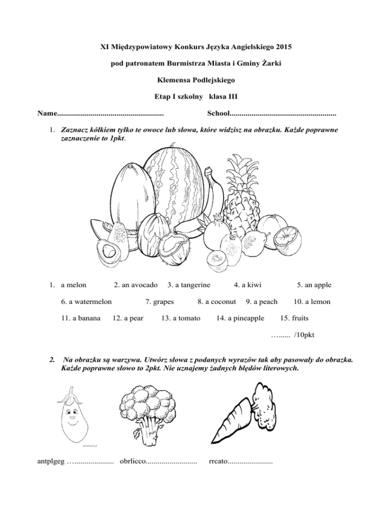 XI Międzypowiatowy Konkurs Języka Angielskiego 2015 pod patronatem Burmistrza Miasta i Gminy Żarki Klemensa Podlejskiego Etap I szkolny klasa III Name...................................................... School...................................................... 1. Zaznacz kółkiem tylko te owoce lub słowa, które widzisz na obrazku. Każde poprawne zaznaczenie to 1pkt. 1. a melon 2. an avocado 6. a watermelon 11. a banana 3. a tangerine 7. grapes 12. a pear 4. a kiwi 8. a coconut 13. a tomato 5. an apple 9. a peach 14. a pineapple 10. a lemon 15. fruits …...... /10pkt 2. Na obrazku są warzywa. Utwórz słowa z podanych wyrazów tak aby pasowały do obrazka. Każde poprawne słowo to 2pkt. Nie uznajemy żadnych błędów literowych. antplgeg ….................... obrlicco.......................... rrcato....................... noino......................... gliacr............................. umppnik.................................... mbcuucre...................... ucettle............................. spae.................... bbcagea............................. …......../20pkt 3. Zapisz słowami działania matematyczne. Na przykład: 1+1=2 one plus one is/equals two Za każde poprawne zapisanie 4pkt. Jeden literowy błąd to 2 pkt a dwa literowe błędy to 1pkt. Brak znaków matematycznych ale poprawne liczby to 1pkt za każdy przykład. 3x4= 12 …..................................................................................................... 20: 5= 4 …........................................................................................................ 13+5=18 ….................................................................................................... 10x2=20 …................................................................................................. 17-11=6 …........................................................................................................... ,,,,,,,,,./20pkt 4. Posegreguj słowa według grup wyrazowych, Uwaga kilka wyrazów nie pasuje do żadnej grupy. Każda poprawna odpowiedź to 1pkt. Nie wolno popełnić błędów literowych. BELLYBUTTON BACK NECK SAUSAGE SATURDAY THURSDAY NAME OCTOBER PET JULY ANIMAL BOTTOM MARCH FRIDAY RICE body parts TOES BREAD TWENTY DECEMBER BUTTER TUESDAY FEBRUARY WEDNESDAY CEREALS days months food …...../20pkt 5. Połącz pytania z odpowiedziami. Możesz zapisać literką z odpowiedzą obok pytania. Za każde poprawne połączenie otrzymasz 1 pkt. 1. What's your name? …..... 2. Where are you from? ….... 3. Where's your house? …..... 4. How old are you? …... 5. What's five plus eight? ….. 6. What pets have you got? ….. 7. What's your favourite food? ….. 8. What colour do you like? ….. 9. Do you like cereals? ….. 10. What's your favourite toy? ….. a. Thirteen b. 12 years old c. In London d. I'm from London e. Greg f. It's a spaceship g. No, yucky! h. Cyan i. Sausages j. Hamsters …...../10pkt 6. Popraw wyrazy. Za zapisanie poprawnej wersji- 2 punkty. np. yelow- yellow therteen- …........................ elewen- ….......................... sixtin-................................. Wensday-............................ perple- …............................ feets-................................... Blak-............................ chesee-.......................... strawbery- ….......................... …........../20pkt