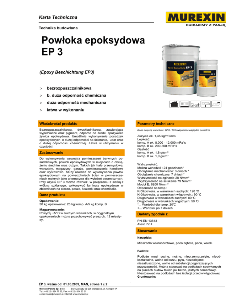 Karta Techniczna Technika BAT_EP3budowlana Powłoka epoksydowa EP 3 (Epoxy Beschichtung EP3) > bezrozpuszczalnikowa > b. duŜa odporność chemiczna > duŜa odporność mechaniczna > łatwa w wykonaniu Właściwości produktu Parametry techniczne Bezrozpuszczalnikowa, dwuskładnikowa, zawierająca wypełniacze oraz pigment, odporna na środki spoŜywcze Ŝywica epoksydowa. UmoŜliwia wykonywanie posadzek epoksydowych o duŜej odporności na ścieranie, udar oraz o duŜej odporności chemicznej. Łatwa w utrzymaniu w czystości. Dane dotyczą warunków: 20oC i 55% wilgotność względna powietrza ZuŜycie ok. 1,45 kg/m²/mm Lepkość: komp. A ok. 8.000 - 12.000 mPa*s komp. B ok. 200-300 mPa*s Gęstość komp. A ok. 1,6 g/cm³ komp. B ok. 1,0 g/cm³ Zastosowanie Do wykonywania wewnątrz pomieszczeń barwnych posadzkowych, powłok epoksydowych w miejscach o obciąŜeniu średnim oraz duŜym. Takich jak hale przemysłowe, warsztaty, magazyny, garaŜe, pomieszczenia handlowe oraz wystawowe. SłuŜy równieŜ do wykonywania powłok epoksydowych na powierzchniach ścian w pomieszczeniach mokrych jako alternatywa dla wyłoŜeń ceramicznych. Przy uŜyciu EP 3 moŜna równieŜ, w połączeniu z siatką z włókna szklanego, wykonywać laminaty epoksydowe w zbiornikach na ciecze, pasze, kiszonki oraz chemikalia. Wytrzymałość: MoŜna wchodzić : 24 godzinach* ObciąŜanie mechaniczne: 3 dniach * ObciąŜanie chemiczne: 7 dniach* Wytrzymałość na zginanie 28 N/mm² Wytrzymałość na ściskanie 79 N/mm² Moduł E: 6200 N/mm² Odporność na temp.: Krótkotrwała. w warunkach suchych: 120 °C Krótkotrwała. w warunkach wilgotnych.: 90 °C Długotrwała w warunkach suchych: 80 °C Długotrwała w warunkach wilgotnych: 50 °C *... Wartości dla temp. 20°C +... Wartości po 7 dniach Dane produktu Opakowanie: 30 kg opakowanie: 25 kg komp. A/5 kg komp. B Magazynowanie: PowyŜej +5° C w suchych warunkach, w oryginalnym opakowaniach moŜna przechowywać przez ok. 12 miesięcy. Badany zgodnie z PN-EN 13813 Atest PZH Stosowanie Narzędzia: Mieszadło wolnoobrotowe, paca zębata, paca, wałek. PodłoŜe: PodłoŜe musi suche, nośne, nieprzemarznięte, nieodkształcalne, wolne od kurzu, pyłu, niezaolejone, niezatłuszczone, wolne od substancji pogarszających przyczepność. MoŜna stosować na podłoŜach spotykanych na placach budów takich jak beton, jastrych cementowy. Niestosować na podłoŜach bez izolacji przeciwwilgociowej. Gruntowanie: 013, waŜna od: 01.06.2009, MAN, strona 1 z 2 EP Murexin Polska Sp. z o.o. Biuro Zarządu 03-236 Warszawa, ul. Annopol 4A Tel.: +48 22 / 884 77 55, Fax: +48 22 / 814 53 31 e-mail: [email protected], Internet: www.murexin.pl 1 Karta Techniczna Technika BAT_EP3budowlana Chłonne podłoŜa naleŜy zaimpregnować w celu zmniejszenia chłonności za pomocą Ŝywicy epoksydowej EP 70 BM. W celu poprawienia przyczepności powłok nakładanych w terminie późniejszym, zagruntowane podłoŜe posypać piecowo suszonym piaskiem kwarcowym o uziarnieniu 0,3-0,9 mm. Przygotowanie podłoŜa: PodłoŜa cementowe nie powinny posiadać wilgotności większej niŜ 4,0 %. Minimalna wytrzymałość podłoŜa na ściskanie powinna być większa od 25 N/mm² . Wytrzymałość podłoŜa na odrywanie powinna być większa niŜ 1,5 N/mm². Zaleca się podłoŜe poddać obróbce za pomocą śrutowania, piaskowania, szlifowania bądź frezowania. Następnie podłoŜe naleŜy starannie odkurzyć. Powłoka Ŝywiczna charakteryzuje się paroszczelnością. Wilgoć podsiąkająca kapilarnie w podłoŜu moŜe doprowadzić do tworzenia się pęcherzy pod powłoką Ŝywiczną. Mieszanie: Odpowiednie ilości komponentów dostarczone w oryginalnych opakowaniach wymieszać ze sobą w proporcji wagowej A : B = 5 : 1. NaleŜy wlać całkowitą ilość komponentu B do pojemnika z komponentem A, następnie całość starannie wymieszać za pomocą mieszadła wolnoobrotowego przez ok. 2-3 minut. NaleŜy zwrócić szczególną uwagę, aby całość materiału została starannie wymieszana, szczególnie przy dnie i przy ściankach pojemnika. W celu zagwarantowania jednakowego czasu utwardzania mieszaniny oraz uniknięcia pojawienia się miejsc klejących na posadzce (spowodowanych niedokładnym wymieszaniem komponentów) mieszaninę naleŜy przelać do czystego naczynia i jeszcze raz dokładnie wymieszać. Po przekroczeniu dopuszczalnego czasu uŜycia produkt pozostawiony w pojemniku moŜe ulec rozgrzaniu i wydzielać nieprzyjemny zapach. Perfekcyjny system Gruntowanie: śywica epoksydowa EP 70 BM Wyrównywanie: śywica epoksydowa EP 70 BM zmieszana z piaskiem kwarcowym Powłoka nawierzchniowa: Powłoka epoksydowa EP 3 WaŜne informacje Przestrzegać norm, obowiązujących przepisów oraz zaleceń podanych w niniejszej karcie technicznej! Nie prowadzić prac w temperaturze niŜszej niŜ o +5 C. Wysoka wilgotność oraz niskie temperatury mogą być przyczyną wydłuŜenia czasu wiązania. Wysoka temperatura produktu moŜe przyczynić się do przyśpieszenia wiązania. Nie dodawać Ŝadnych obcych materiałów. Obróbka: Powłoka epoksydowa EP 3 moŜe być wykonywana jako posadzka bezspoinowa, równieŜ na duŜych powierzchniach. Jednak szczeliny dylatacyjne (konstrukcyjne) muszą zostać wypełnione materiałem trwale elastycznym. Mieszaninę Ŝywicy naleŜy wylać na odpowiednio przygotowane i zagruntowane podłoŜe, następnie rozprowadzić równomiernie za pomocą pacy zębatej. Masa Ŝywiczna posiada właściwości samoniwelujące. Tak wykonaną powłokę Ŝywiczną naleŜy odpowietrzyć za pomocą wałka kolczastego. Bezpieczeństwo i higiena pracy BHP: przestrzegać specyfikacji oraz informacji o stosowaniu, czyszczeniu i usuwaniu podanych w karcie charakterystyki produktu. Niniejsza karta techniczna bazuje na rozległym doświadczeniu, została stworzona z najlepszej woli, nie jest prawnie wiąŜąca i nie jest ofertą w rozumieniu prawa czy teŜ gwarancją wynikającą z zamówienia lub umowy sp