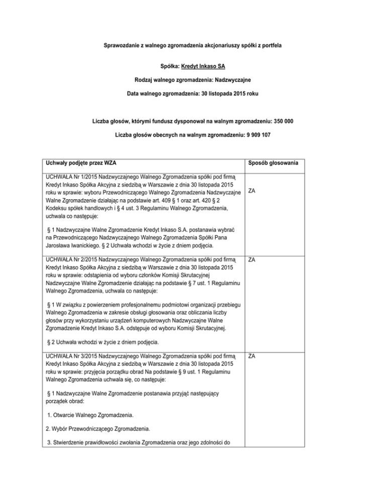 Sprawozdanie z walnego zgromadzenia akcjonariuszy spółki z portfela Spółka: Kredyt Inkaso SA Rodzaj walnego zgromadzenia: Nadzwyczajne Data walnego zgromadzenia: 30 listopada 2015 roku Liczba głosów, którymi fundusz dysponował na walnym zgromadzeniu: 350 000 Liczba głosów obecnych na walnym zgromadzeniu: 9 909 107 Uchwały podjęte przez WZA UCHWAŁA Nr 1/2015 Nadzwyczajnego Walnego Zgromadzenia spółki pod firmą Kredyt Inkaso Spółka Akcyjna z siedzibą w Warszawie z dnia 30 listopada 2015 roku w sprawie: wyboru Przewodniczącego Walnego Zgromadzenia Nadzwyczajne Walne Zgromadzenie działając na podstawie art. 409 § 1 oraz art. 420 § 2 Kodeksu spółek handlowych i § 4 ust. 3 Regulaminu Walnego Zgromadzenia, uchwala co następuje: Sposób głosowania ZA § 1 Nadzwyczajne Walne Zgromadzenie Kredyt Inkaso S.A. postanawia wybrać na Przewodniczącego Nadzwyczajnego Walnego Zgromadzenia Spółki Pana Jarosława Iwanickiego. § 2 Uchwała wchodzi w życie z dniem podjęcia. UCHWAŁA Nr 2/2015 Nadzwyczajnego Walnego Zgromadzenia spółki pod firmą Kredyt Inkaso Spółka Akcyjna z siedzibą w Warszawie z dnia 30 listopada 2015 roku w sprawie: odstąpienia od wyboru członków Komisji Skrutacyjnej Nadzwyczajne Walne Zgromadzenie działając na podstawie § 7 ust. 1 Regulaminu Walnego Zgromadzenia, uchwala co następuje: ZA § 1 W związku z powierzeniem profesjonalnemu podmiotowi organizacji przebiegu Walnego Zgromadzenia w zakresie obsługi głosowania oraz obliczania liczby głosów przy wykorzystaniu urządzeń komputerowych Nadzwyczajne Walne Zgromadzenie Kredyt Inkaso S.A. odstępuje od wyboru Komisji Skrutacyjnej. § 2 Uchwała wchodzi w życie z dniem podjęcia. UCHWAŁA Nr 3/2015 Nadzwyczajnego Walnego Zgromadzenia spółki pod firmą Kredyt Inkaso Spółka Akcyjna z siedzibą w Warszawie z dnia 30 listopada 2015 roku w sprawie: przyjęcia porządku obrad Na podstawie § 9 ust. 1 Regulaminu Walnego Zgromadzenia uchwala się, co następuje: § 1 Nadzwyczajne Walne Zgromadzenie postanawia przyjąć następujący porządek obrad: 1. Otwarcie Walnego Zgromadzenia. 2. Wybór Przewodniczącego Zgromadzenia. 3. Stwierdzenie prawidłowości zwołania Zgromadzenia oraz jego zdolności do ZA podejmowania uchwał. 4. Wybór Komisji Skrutacyjnej. 5. Przyjęcie porządku obrad. 6. Podjęcie uchwały w sprawie określenia liczebności Rady Nadzorczej. 7. Uzupełnienie składu Rady Nadzorczej. 8. Zmiany w składzie Rady Nadzorczej. 9. Zmiany w Statucie Spółki. 10. Podjęcie uchwały w sprawie akceptacji/zatwierdzenia emisji obligacji. 11. Przedstawienie przez Zarząd Spółki informacji i rekomendacji na temat strategii działania w zakresie wykupu obligacji wyemitowanych przez Spółkę z terminem zapadalności do końca I półrocza 2016 r. oraz podjęcie przez NWZ uchwały w sprawie wyrażenia zgody na emisję obligacji. 12. Zamknięcie obrad. § 2 Uchwała wchodzi w życie z dniem podjęcia. UCHWAŁA Nr 4/2015 Nadzwyczajnego Walnego Zgromadzenia spółki pod firmą Kredyt Inkaso Spółka Akcyjna z siedzibą w Warszawie z dnia 30 listopada 2015 roku w sprawie: ustalenia liczebności Rady Nadzorczej spółki pod firmą Kredyt Inkaso Spółka Akcyjna Nadzwyczajne Walne Zgromadzenie działając na podstawie § 15 ust. 1 Regulaminu Walnego Zgromadzenia, uchwala co następuje: § 1 Nadzwyczajne Walne Zgromadzenie Kredyt Inkaso S.A. postanawia określić liczbę członków Rady Nadzorczej Kredyt Inkaso S.A. na 7 (siedem) osób. § 2 Uchwała wchodzi w życie z dniem podjęcia. ZA UCHWAŁA Nr 5/2015 Nadzwyczajnego Walnego Zgromadzenia spółki pod firmą Kredyt Inkaso Spółka Akcyjna z siedzibą w Warszawie z dnia 30 listopada 2015 roku w sprawie: uzupełnienia składu Rady Nadzorczej spółki pod firmą Kredyt Inkaso Spółka Akcyjna Nadzwyczajne Walne Zgromadzenie działając na podstawie § 7 ust. 7 pkt 4 Statutu Kredyt Inkaso S.A., uchwala co następuje: § 1 Nadzwyczajne Walne Zgromadzenie Kredyt Inkaso S.A. postanawia powołać w skład Rady Nadzorczej Kredyt Inkaso S.A. Pana Mariusza Banaszuka posiadającego nr PESEL 69050201533. ZA § 2 Uchwała wchodzi w życie z dniem podjęcia. UCHWAŁA Nr 6/2015 Nadzwyczajnego Walnego Zgromadzenia spółki pod firmą Kredyt Inkaso Spółka Akcyjna z siedzibą w Warszawie z dnia 30 listopada 2015 roku w sprawie: uzupełnienia składu Rady Nadzorczej spółki pod firmą Kredyt Inkaso Spółka Akcyjna Nadzwyczajne Walne Zgromadzenie działając na podstawie § 7 ust. 7 pkt 4 Statutu Kredyt Inkaso S.A., uchwala co następuje: § 1 Nadzwyczajne Walne Zgromadzenie Kredyt Inkaso S.A. postanawia powołać w skład Rady Nadzorczej Kredyt Inkaso S.A. Pana Mirosława Gronickiego posiadającego nr PESEL 50122602675. § 2 Uchwała wchodzi w życie z dniem podjęcia. ZA UCHWAŁA Nr 7/2015 Nadzwyczajnego Walnego Zgromadzenia spółki pod firmą Kredyt Inkaso Spółka Akcyjna z siedzibą w Warszawie z dnia 30 listopada 2015 roku w sprawie: uzupełnienia składu Rady Nadzorczej spółki pod firmą Kredyt Inkaso Spółka Akcyjna Nadzwyczajne Walne Zgromadzenie działając na podstawie § 7 ust. 7 pkt 4 Statutu Kredyt Inkaso S.A., uchwala co następuje: § 1 Nadzwyczajne Walne Zgromadzenie Kredyt Inkaso S.A. postanawia powołać w skład Rady Nadzorczej Kredyt Inkaso S.A. Pana Piotra Urbańczyka posiadającego nr PESEL 66061900370. ZA § 2 Uchwała wchodzi w życie z dniem podjęcia. UCHWAŁA Nr 8/2015 Nadzwyczajnego Walnego Zgromadzenia spółki pod firmą Kredyt Inkaso Spółka Akcyjna z siedzibą w Warszawie z dnia 30 listopada 2015 roku w sprawie: zmiany statutu spółki pod firmą Kredyt Inkaso Spółka Akcyjna Działając na podstawie art. 430 § 1 Kodeksu Spółek Handlowych oraz zgodnie z § 7 ust. 7 pkt 8 Statutu Spółki, uchwala się, co następuje: § 1 Nadzwyczajne Walne Zgromadzenie Kredyt Inkaso S.A. zmienia Statut Spółki w ten sposób, że w § 8 ust. 8a dotychczasową treść oznacza się jako pkt 1) i dodaje pkt. 2) w brzmieniu: „W przy