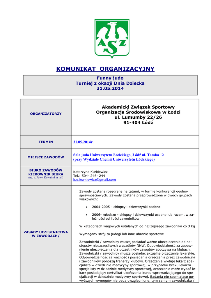 KOMUNIKAT ORGANIZACYJNY Funny judo Turniej z okazji Dnia Dziecka 31.05.2014 Akademicki Związek Sportowy Organizacja Środowiskowa w Łodzi ul. Lumumby 22/26 91-404 Łódź ORGANIZATORZY TERMIN MIEJSCE ZAWODÓW BIURO ZAWODÓW KIEROWNIK BIURA (np. p. Paweł Kowalski nr tel.) 31.05.2014r. Sala judo Uniwersytetu Łódzkiego, Łódź ul. Tamka 12 (przy Wydziale Chemii Uniwersytetu Łódzkiego) Katarzyna Kurkiewicz Tel.: 504- 246- 244 [email protected] Zawody zostaną rozegrane na tatami, w formie konkurencji ogólnosprawnościowych. Zawody zostaną przeprowadzone w dwóch grupach wiekowych: 2004-2005 - chłopcy i dziewczynki osobno 2006- młodsze - chłopcy i dziewczynki osobno lub razem, w zależności od ilości zawodników W kategoriach wagowych ustalanych od najlżejszego zawodnika co 3 kg ZASADY UCZESTNICTWA W ZAWODACH/ Wymagany strój to judogi lub inne ubranie sportowe Zawodniczki / zawodnicy muszą posiadać ważne ubezpieczenie od następstw nieszczęśliwych wypadków NNW. Odpowiedzialność za zapewnienie ubezpieczenia dla uczestników zawodów spoczywa na klubach. Zawodniczki / zawodnicy muszą posiadać aktualne orzeczenie lekarskie. Odpowiedzialność za ważność i posiadania orzeczenia przez zawodniczki i zawodników ponoszą trenerzy klubowi. Orzeczenie wydaje lekarz specjalista w dziedzinie medycyny sportowej, w przypadku braku lekarza specjalisty w dziedzinie medycyny sportowej, orzeczenie może wydać lekarz posiadający certyfikat ukończenia kursu wprowadzającego do specjalizacji w dziedzinie medycyny sportowej. Badania nie spełniające powyższych wymogów nie będą uwzględnione, tym samym zawodniczka / zawodnik nie będą dopuszczeni do udziału w zawodach. Organizator nie ponosi odpowiedzialności za zaistniałe wydarzenia. WIEK/STOPIEŃ SZKOLENIOWY OPŁATA STARTOWA ZGŁOSZENIA SPORTOWE DO ZAWODÓW Roczniki: 2004-2005 2006-młodsze 5zł/zawodnika Prosimy zainteresowane kluby o nadsyłanie zgłoszeń na adres: [email protected] do dnia 23.05.2014r. Zgłoszenie powinno zawierać imię i nazwisko zawodnika, rocznik, wagę. 31.05.2014r. sobota 9:00- 9:30 weryfikacja zawodników roczniki 2004-2005 PROGRAM ZAWODÓW 9:30- 13:00 rozgrywanie zawodów i dekoracja zawodników roczniki 2004-2005 13:00- 13:30 weryfikacja zawodników roczniki 2006-młodsze 13:30- 16:00 rozgrywanie zawodów i dekoracja zawodników roczniki 2006-2007 Inne informacje Każdy uczestnik zawodów otrzyma nagrodę rzeczową i dyplom. Serdecznie zapraszamy!
