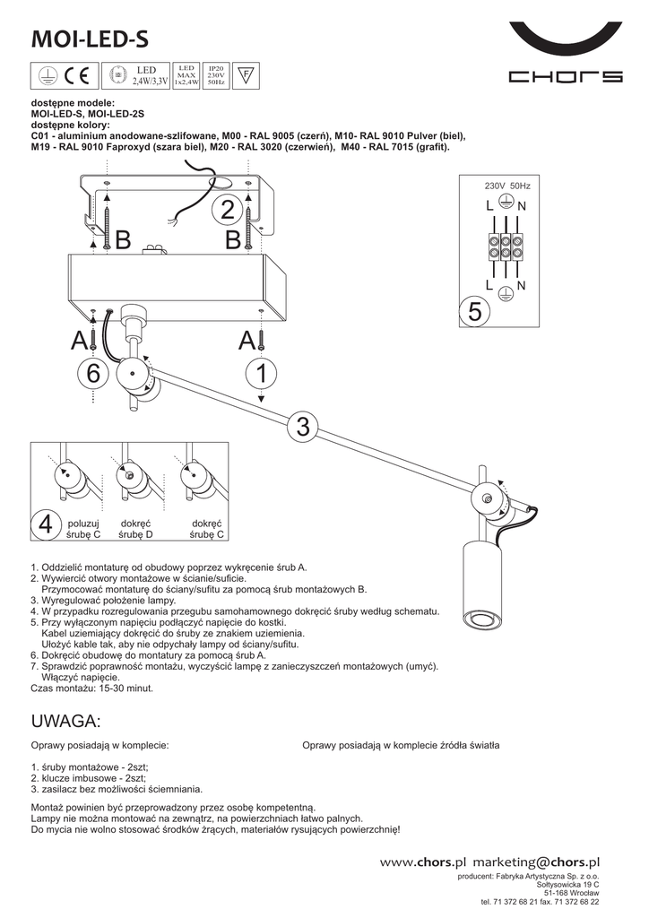 MOI-LED-S LED 2,4W/3,3V LED MAX 1x2,4W IP20 230V 50Hz F dostępne modele: MOI-LED-S, MOI-LED-2S dostępne kolory: C01 - aluminium anodowane-szlifowane, M00 - RAL 9005 (czerń), M10- RAL 9010 Pulver (biel), M19 - RAL 9010 Faproxyd (szara biel), M20 - RAL 3020 (czerwień), M40 - RAL 7015 (grafit). 230V 50Hz 2 B B L N L N 5 A 6 A 1 3 4 poluzuj śrubę C dokręć śrubę D dokręć śrubę C 1. Oddzielić montaturę od obudowy poprzez wykręcenie śrub A. 2. Wywiercić otwory montażowe w ścianie/suficie. Przymocować montaturę do ściany/sufitu za pomocą śrub montażowych B. 3. Wyregulować położenie lampy. 4. W przypadku rozregulowania przegubu samohamownego dokręcić śruby według schematu. 5. Przy wyłączonym napięciu podłączyć napięcie do kostki. Kabel uziemiający dokręcić do śruby ze znakiem uziemienia. Ułożyć kable tak, aby nie odpychały lampy od ściany/sufitu. 6. Dokręcić obudowę do montatury za pomocą śrub A. 7. Sprawdzić poprawność montażu, wyczyścić lampę z zanieczyszczeń montażowych (umyć). Włączyć napięcie. Czas montażu: 15-30 minut. UWAGA: Oprawy posiadają w komplecie: Oprawy posiadają w komplecie źródła światła 1. śruby montażowe - 2szt; 2. klucze imbusowe - 2szt; 3. zasilacz bez możliwości ściemniania. Montaż powinien być przeprowadzony przez osobę kompetentną. Lampy nie można montować na zewnątrz, na powierzchniach łatwo palnych. Do mycia nie wolno stosować środków żrących, materiałów rysujących powierzchnię! www.chors.pl [email protected] producent: Fabryka Artystyczna Sp. z o.o. Sołtysowicka 19 C 51-168 Wrocław tel. 71 372 68 21 fax. 71 372 68 22