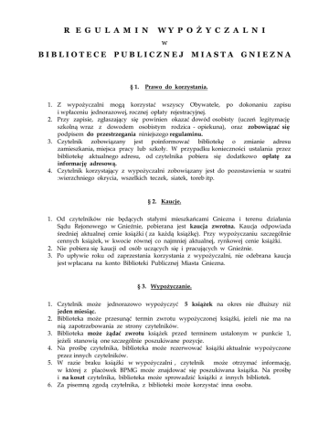 R E G U L A M I N WY P O Ż Y C Z A L N I w BIBLIOTECE PUBLICZNEJ MIASTA GNIEZNA § 1. Prawo do korzystania. 1. Z wypożyczalni mogą korzystać wszyscy Obywatele, po dokonaniu zapisu i wpłaceniu jednorazowej, rocznej opłaty rejestracyjnej. 2. Przy zapisie, zgłaszający się powinien okazać dowód osobisty (uczeń legitymację szkolną wraz z dowodem osobistym rodzica - opiekuna), oraz zobowiązać się podpisem do przestrzegania niniejszego regulaminu. 3. Czytelnik zobowiązany jest poinformować bibliotekę o zmianie adresu zamieszkania, miejsca pracy lub szkoły. W przypadku konieczności ustalania przez bibliotekę aktualnego adresu, od czytelnika pobiera się dodatkowo opłatę za informację adresową. 4. Czytelnik korzystający z wypożyczalni zobowiązany jest do pozostawienia w szatni :wierzchniego okrycia, wszelkich teczek, siatek, toreb itp. § 2. Kaucje. 1. Od czytelników nie będących stałymi mieszkańcami Gniezna i terenu działania Sądu Rejonowego w Gnieźnie, pobierana jest kaucja zwrotna. Kaucja odpowiada średniej aktualnej cenie książki ( za każdą książkę). Przy wypożyczaniu szczególnie cennych książek, w kwocie równej co najmniej aktualnej, rynkowej cenie książki. 2. Nie pobiera się kaucji od osób uczących się i pracujących w Gnieźnie. 3. Po upływie roku od zaprzestania korzystania z wypożyczalni, nie odebrana kaucja jest wpłacana na konto Biblioteki Publicznej Miasta Gniezna. § 3. Wypożyczanie. 1. Czytelnik może jednorazowo wypożyczyć 5 książek na okres nie dłuższy niż jeden miesiąc. 2. Biblioteka może przesunąć termin zwrotu wypożyczonej książki, jeżeli nie ma na nią zapotrzebowania ze strony czytelników. 3. Biblioteka może żądać zwrotu książek przed terminem ustalonym w punkcie 1, jeżeli stanowią one szczególnie poszukiwane pozycje. 4. Na prośbę czytelnika, biblioteka może rezerwować książki aktualnie wypożyczone przez innych czytelników. 5. W razie braku książki w wypożyczalni , czytelnik może otrzymać informację, w której z placówek BPMG może znajdować się poszukiwana książka. Na prośbę i na koszt czytelnika, biblioteka może sprowadzić książki z innych bibliotek. 6. Za pisemną zgodą czytelnika, z biblioteki może korzystać inna osoba. 7. Z księgozbioru podręcznego korzysta się tylko na miejscu ( za pośrednictwem bibliotekarza). 8. Wybrane książki czytelnik rejestruje u dyżurnego bibliotekarza. Jemu też zwraca wypożyczone książki. § 4. Przetrzymywanie książek. 1. Za przetrzymanie książek ( poza wyjątkowymi przypadkami uzgodnionymi z bibliotekarzem ), ponad termin określony w 3 pkt. 1, pobiera się opłatę karną . 2. W przypadku wysłania upomnienia (upomnień), wezwania ostatecznego, do kary za przytrzymanie książek dolicza się tzw. koszty wysłania (upomnień, wezwań). 3. Jeżeli czytelnik mimo wysłanych upomnień przez bibliotekę, odmawia zwrotu książek lub uiszczenia należnych opłat, biblioteka dochodzi swych praw na drodze sądowej. § 5. Poszanowanie książki. Czytelnik powinien otoczyć wypożyczone książki należytą troską , aby nie uległy zagubieniu zniszczeniu lub uszkodzeniu. Przed wypożyczeniem winien zwrócić uwagę na stan fizyczny książki a zauważone uszkodzenia zgłosić bibliotekarzowi § 6. Zagubienie, zniszczenie lub uszkodzenie książki. W przypadku zagubienia, zniszczenia lub uszkodzenia książki, czytelnik ma obowiązek książkę odkupić oraz pokryć koszty oprawy introligatorskiej. O ile odkupienie jest niemożliwe, czytelnik ma obowiązek zapłacić odszkodowanie w następującej wysokości: w przypadku książki beletrystycznej do 3-krotnej średniej ceny książki w przypadku książki popularnonaukowej do 6-krotnej średniej ceny książki w przypadku dzieł szczególnie cennych, kierownik biblioteki może ustalić ich wyższą wartość o czym czytelnik musi być poinformowany przed wypożyczeniem książki ( książki te wypożycza się po wypełnieniu rewersu lub tzw. karty "Z") w wyjątkowych przypadkach czytelnik może w uzgodnieniu z bibliotekarzem, dostarczyć : − w miejsce zagubionej książki, inną o równej wartości, przydatną bibliotece − w przypadku zagubienia lub zniszczenia jednego z tomów dzieła wielotomowego, czytelnik ponosi zobowiązanie za całość dzieła. § 7. Porady i informacje. 1. Bibliotekarz informuje czytelnika o sposobie korzystania ze zbiorów i katalogów. 2. Bibliotekarz, na prośbę czytelnika udziela informacji o książkach, pomaga w doborze literatury, korzystaniu z katalogów oraz wydawnictw informacyjnych. § 8. Postanowienia końcowe. 1. Wysokość jednorazowej, rocznej opłaty rejestracyjnej, aktualnej opłaty karnej za przetrzymanie książek, średniej ceny książki oraz tzw. kosztów wysłania upomnień i wezwania ostatecznego, ustala dyrektor BPMG w drodze zarządzenia. 2. Skargi i wnioski czytelnicy mogą wpisywać do "Księgi skarg i wniosków" znajdującej się u dyżurującego bibliotekarza. 3. W stosunku do czytelników, co do których egzekucja należności biblioteki nie dała wcześniej rezultatu, odmawia się prawa do korzystania z placówek BPMG. Czytelnik nie stosujący się do postanowień niniejszego regulaminu może być czasowo, a w szczególnie drastycznych przypadkach - na stałe pozbawiony praw do korzystania z biblioteki. Decyzję w tej sprawie podejmuje kierownik biblioteki. Czytelnikowi przysługuje prawo odwołania się do Wydziału Oświaty i Kultury Urzędu Miejskiego w Gnieźnie za pośrednictwem dyrektora BPMG. 4. Regulamin niniejszy obowiązuje od dnia 01 maja 2002r.