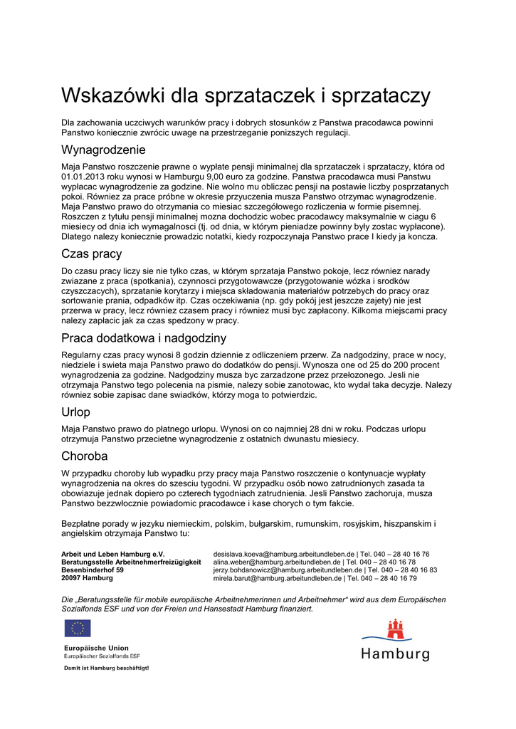 Wskazówki dla sprzataczek i sprzataczy Dla zachowania uczciwych warunków pracy i dobrych stosunków z Panstwa pracodawca powinni Panstwo koniecznie zwrócic uwage na przestrzeganie ponizszych regulacji. Wynagrodzenie Maja Panstwo roszczenie prawne o wypłate pensji minimalnej dla sprzataczek i sprzataczy, która od 01.01.2013 roku wynosi w Hamburgu 9,00 euro za godzine. Panstwa pracodawca musi Panstwu wypłacac wynagrodzenie za godzine. Nie wolno mu obliczac pensji na postawie liczby posprzatanych pokoi. Równiez za prace próbne w okresie przyuczenia musza Panstwo otrzymac wynagrodzenie. Maja Panstwo prawo do otrzymania co miesiac szczegółowego rozliczenia w formie pisemnej. Roszczen z tytułu pensji minimalnej mozna dochodzic wobec pracodawcy maksymalnie w ciagu 6 miesiecy od dnia ich wymagalnosci (tj. od dnia, w którym pieniadze powinny były zostac wypłacone). Dlatego nalezy koniecznie prowadzic notatki, kiedy rozpoczynaja Panstwo prace I kiedy ja koncza. Czas pracy Do czasu pracy liczy sie nie tylko czas, w którym sprzataja Panstwo pokoje, lecz równiez narady zwiazane z praca (spotkania), czynnosci przygotowawcze (przygotowanie wózka i srodków czyszczacych), sprzatanie korytarzy i miejsca składowania materiałów potrzebych do pracy oraz sortowanie prania, odpadków itp. Czas oczekiwania (np. gdy pokój jest jeszcze zajety) nie jest przerwa w pracy, lecz równiez czasem pracy i równiez musi byc zapłacony. Kilkoma miejscami pracy nalezy zapłacic jak za czas spedzony w pracy. Praca dodatkowa i nadgodziny Regularny czas pracy wynosi 8 godzin dziennie z odliczeniem przerw. Za nadgodziny, prace w nocy, niedziele i swieta maja Panstwo prawo do dodatków do pensji. Wynosza one od 25 do 200 procent wynagrodzenia za godzine. Nadgodziny musza byc zarzadzone przez przełozonego. Jesli nie otrzymaja Panstwo tego polecenia na pismie, nalezy sobie zanotowac, kto wydał taka decyzje. Nalezy równiez sobie zapisac dane swiadków, którzy moga to potwierdzic. Urlop Maja Panstwo prawo do płatnego urlopu. Wynosi on co najmniej 28 dni w roku. Podczas urlopu otrzymuja Panstwo przecietne wynagrodzenie z ostatnich dwunastu miesiecy. Choroba W przypadku choroby lub wypadku przy pracy maja Panstwo roszczenie o kontynuacje wypłaty wynagrodzenia na okres do szesciu tygodni. W przypadku osób nowo zatrudnionych zasada ta obowiazuje jednak dopiero po czterech tygodniach zatrudnienia. Jesli Panstwo zachoruja, musza Panstwo bezzwłocznie powiadomic pracodawce i kase chorych o tym fakcie. Bezpłatne porady w jezyku niemieckim, polskim, bułgarskim, rumunskim, rosyjskim, hiszpanskim i angielskim otrzymaja Panstwo tu: Arbeit und Leben Hamburg e.V. Beratungsstelle Arbeitnehmerfreizügigkeit Besenbinderhof 59 20097 Hamburg [email protected] | Tel. 040 – 28 40 16 76 [email protected] | Tel. 040 – 28 40 16 78 [email protected] | Tel. 040 – 28 40 16 83 [email protected] | Tel. 040 – 28 40 16 79 Die „Beratungsstelle für mobile europäische Arbeitnehmerinnen und Arbeitnehmer“ wird aus dem Europäischen Sozialfonds ESF und von der Freien und Hansestadt Hamburg finanziert.