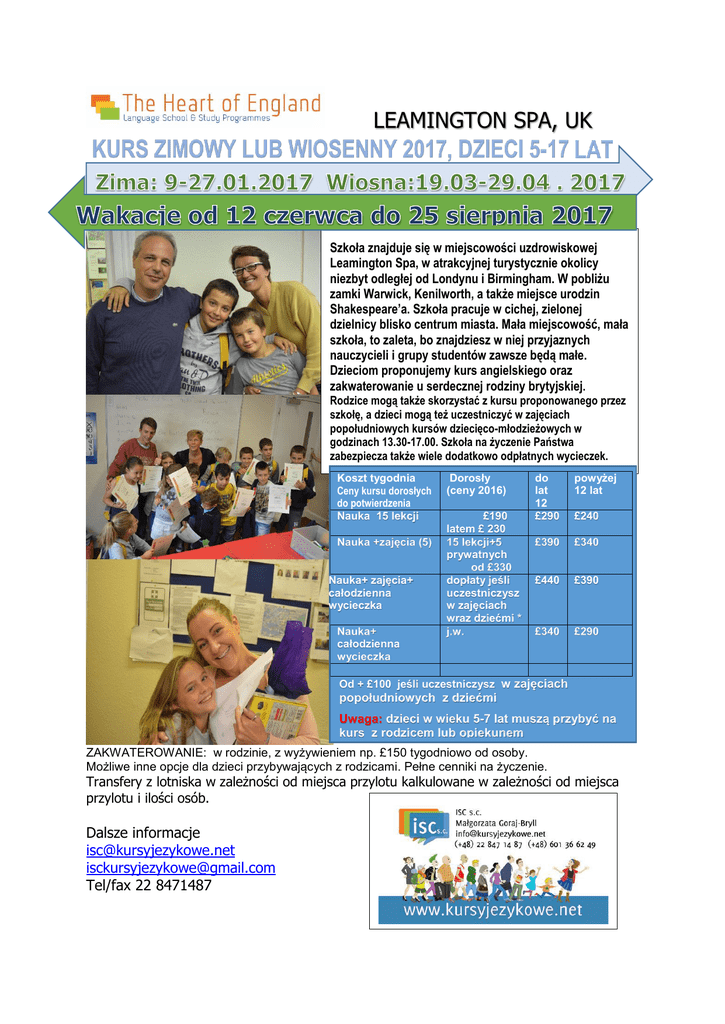 LEAMINGTON SPA, UK Szkoła znajduje się w miejscowości uzdrowiskowej Leamington Spa, w atrakcyjnej turystycznie okolicy niezbyt odległej od Londynu i Birmingham. W pobliżu zamki Warwick, Kenilworth, a także miejsce urodzin Shakespeare’a. Szkoła pracuje w cichej, zielonej dzielnicy blisko centrum miasta. Mała miejscowość, mała szkoła, to zaleta, bo znajdziesz w niej przyjaznych nauczycieli i grupy studentów zawsze będą małe. Dzieciom proponujemy kurs angielskiego oraz zakwaterowanie u serdecznej rodziny brytyjskiej. Rodzice mogą także skorzystać z kursu proponowanego przez szkołę, a dzieci mogą też uczestniczyć w zajęciach popołudniowych kursów dziecięco-młodzieżowych w godzinach 13.30-17.00. Szkoła na życzenie Państwa zabezpiecza także wiele dodatkowo odpłatnych wycieczek. Każdy z kursów konstruowany jest na życzenie Koszt tygodnia Ceny kursu dorosłych do potwierdzenia Nauka 15 lekcji Nauka +zajęcia (5) Nauka+ zajęcia+ całodzienna wycieczka Nauka+ całodzienna wycieczka Dorosły (ceny 2016) £190 latem £ 230 15 lekcji+5 prywatnych od £330 dopłaty jeśli uczestniczysz w zajęciach wraz dziećmi * j.w. do lat 12 £290 powyżej 12 lat £390 £340 £440 £390 £340 £290 £240 Od + £100 jeśli uczestniczysz w zajęciach popołudniowych z dziećmi Uwaga: dzieci w wieku 5-7 lat muszą przybyć na kurs z rodzicem lub opiekunem ZAKWATEROWANIE: w rodzinie, z wyżywieniem np. £150 tygodniowo od osoby. Możliwe inne opcje dla dzieci przybywających z rodzicami. Pełne cenniki na życzenie. Transfery z lotniska w zależności od miejsca przylotu kalkulowane w zależności od miejsca przylotu i ilości osób. Dalsze informacje [email protected] [email protected] Tel/fax 22 8471487