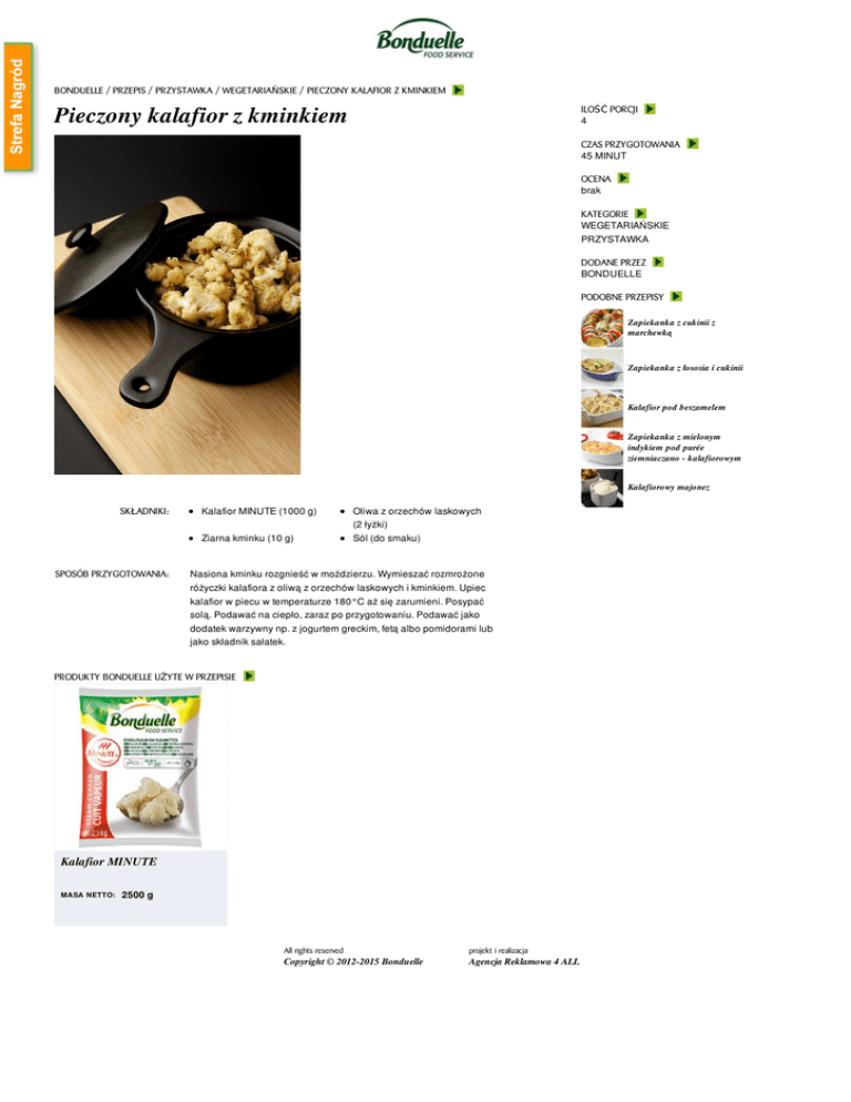 BONDUELLE / PRZEPIS / PRZYSTAWKA / WEGETARIAŃSKIE / PIECZONY KALAFIOR Z KMINKIEM Pieczony kalafior z kminkiem ILOŚĆ PORCJI 4 CZAS PRZYGOTOWANIA 45 MINUT OCENA brak KATEGORIE WEGETARIAŃSKIE PRZYSTAWKA DODANE PRZEZ BONDUELLE PODOBNE PRZEPISY Zapiekanka z cukinii z marchewką Zapiekanka z łososia i cukinii Kalafior pod beszamelem Zapiekanka z mielonym indykiem pod purée ziemniaczano - kalafiorowym Kalafiorowy majonez SKŁADNIKI: Kalafior MINUTE (1000 g) Ziarna kminku (10 g) SPOSÓB PRZYGOTOWANIA: Oliwa z orzechów laskowych (2 łyżki) Sól (do smaku) Nasiona kminku rozgnieść w moździerzu. Wymieszać rozmrożone różyczki kalafiora z oliwą z orzechów laskowych i kminkiem. Upiec kalafior w piecu w temperaturze 180°C aż się zarumieni. Posypać solą. Podawać na ciepło, zaraz po przygotowaniu. Podawać jako dodatek warzywny np. z jogurtem greckim, fetą albo pomidorami lub jako składnik sałatek. PRODUKTY BONDUELLE UŻYTE W PRZEPISIE Kalafior MINUTE MASA NETTO: 2500 g All rights reserved projekt i realizacja Copyright © 2012-2015 Bonduelle Agencja Reklamowa 4 ALL