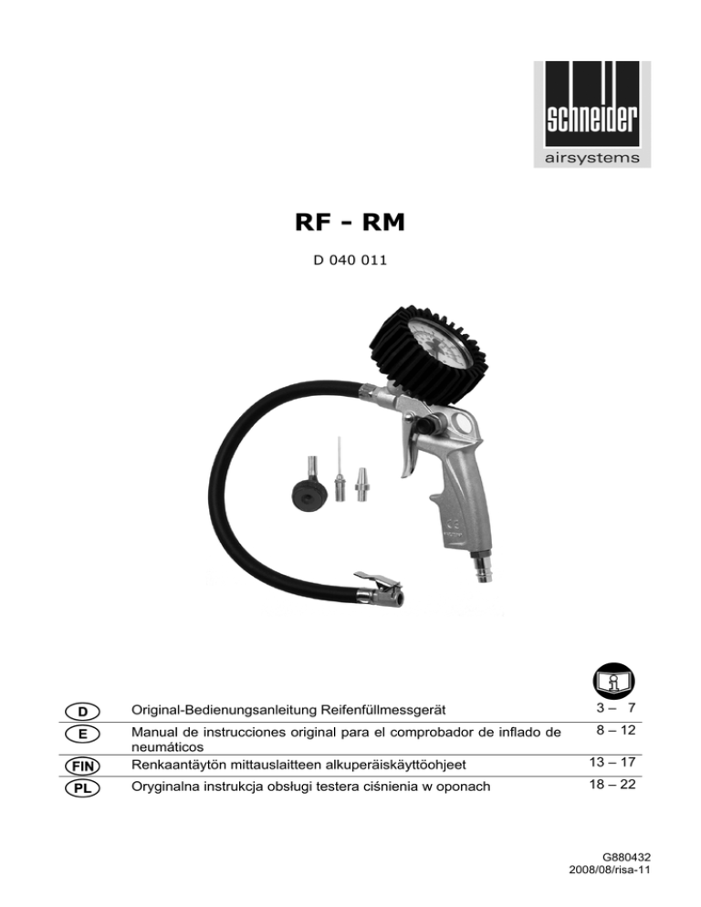 RF - RM D 040 011 Original-Bedienungsanleitung Reifenfüllmessgerät 3– 7 Manual de instrucciones original para el comprobador de inflado de neumáticos Renkaantäytön mittauslaitteen alkuperäiskäyttöohjeet 8 – 12 13 – 17 Oryginalna instrukcja obsługi testera ciśnienia w oponach 18 – 22 G880432 2008/08/risa-11 1a 1b 2a 2b 2 RF-RM DEUTSCH Inhalt 1. Allgemeine Hinweise ............................ 3 2. Lieferumfang ......................................... 3 3. Mitgeltende Dokumente ........................ 3 4. Bestimmungsgemäße Verwendung ...... 3 5. Symbole ................................................ 4 6. Technische Daten ................................. 4 7. Sicherheitshinweise .............................. 4 8. Aufbau .................................................. 5 9. Inbetriebnahme ..................................... 5 9.1 Vor erster Inbetriebnahme ............ 5 9.2 Druckluftanschluss........................ 5 9.3 Betrieb .......................................... 6 9.4 Nach dem Einsatz......................... 6 10. Wartung ................................................ 6 10.1 Vor Wartungstätigkeiten ............... 6 10.2 Wartung ........................................ 6 11. Außerbetriebnahme .............................. 6 11.1 Lagerung ...................................... 6 11.2 Entsorgung ................................... 6 12. Zubehör ................................................ 6 13. Gewährleistungsbedingungen .............. 7 14. EG-Konformitätserklärung .................... 7 1. Allgemeine Hinweise Prüfungen, Einstellungen und Wartungsarbeiten sollten immer von der gleichen Person oder deren Stellvertreter durchgeführt und in einem Wartungsbuch dokumentiert werden. Bei Fragen bitten wir Sie, die Artikelnummer und Bezeichnung des Gerätes anzugeben. Wird das Gerät außerhalb von Deutschland betrieben, können andere gesetzliche Vorschriften für den Betrieb des Gerätes vorgeschrieben sein, als sie in dieser Bedienungsanleitung beschrieben sind. RF-RM Beachten Sie die Sicherheitshinweise! Bedienungsanleitung lesen! Der Betreiber (Besitzer / Verantwortliche) ist verpflichtet die Bedienungsanleitung zu beachten und alle Anwender dieses Gerätes gemäß der Bedienungsanleitung zu unterweisen. Die Unterweisung ist jährlich zu wiederholen. 2. 3. 4. Lieferumfang Reifenfüllmessgerät Fahrradnippel Ballhohlnadel Schlauchbootnippel Garantiekarte Bedienungsanleitung Mitgeltende Dokumente Ersatzteilliste Konformitätserklärung Bestimmungsgemäße Verwendung Bei dem Reifenfüllmessgerät handelt es sich um eine Ausführung aus Aluminium mit Manometer und Gummischutz. Er eignet sich zum Befüllen und Entleeren von Fahrradreifen, Rennradund Mountainbikereifen, Motorrad- und Autoreifen, Bällen, Luftmatratzen, Schlauchboote, usw. mit Druckluft oder Stickstoff. Jede andere Verwendung ist mit dem Hersteller abzustimmen. Deutsch 3 5. Symbole Achtung: Schenken Sie diesen Symbolen höchste Aufmerksamkeit! Symbol Signalwort GEFAHR WARNUNG VORSICHT HINWEIS Gefahrenstufe unmittelbar drohende Gefahr mögliche drohende Gefahr mögliche gefährliche Situation mögliche gefährliche Situation Folgen bei Nichtbeachtung Tod, schwere Körperverletzung Tod, schwere Körperverletzung Leichte Körperverletzung Sachschaden Sicherheitshinweise Symbol Bedeutung Bedienungsanleitung lesen! 6. Folgen bei Nichtbeachtung Körperverletzung oder Tod des Bedieners Sachschaden am Gerät falsche Bedienung des Gerätes Technische Daten Max. zulässiger Arbeitsdruck (Fließdruck): Empf. Schlauch-ø (innen) bei L= 10 m: Abmessungen (ohne Schlauch) Breite x Tiefe x Höhe: Gewicht: Benötigte Luftqualität: 10 6 225 x 83 x 95 0,35 bar mm mm kg Gereinigt, kondensatfrei und ölfrei. Technische Änderungen vorbehalten. Abbildungen können vom Original abweichen. Stand: März 2007 7. Sicherheitshinweise GEFAHR Peitschender Druckluftschlauch beim Öffnen der Schnellkupplung. Druckluftschlauch festhalten. GEFAHR Peitschender Schlauch während des Füll- oder Ablassvorgangs. Schlauch mit Stecker festhalten. VORSICHT Stolperfalle! Druckluftschläuche, die über den Boden geführt werden. Vermeiden bzw. beachten. HINWEIS Bruch, ungenaue Werte! Gerät fällt, Schlag oder Stoß. Vermeiden bzw. beachten. WARNUNG Erstickungsgefahr beim Arbeiten mit Stickstoff. Nur in gut belüfteten Räumen! WARNUNG Explosionsgefahr! Gerät nicht in explosionsgefährdeten Bereichen einsetzen! 4 Deutsch Schützen Sie sich, andere Personen, Sachgegenstände und ihre Umwelt durch die jeweils notwendige Schutzmaßnahmen oder Vorkehrungen um Gesundheits-, Sach-, Wert- oder Umweltschäden sowie Unfallgefahren zu vermeiden. Der Betreiber hat den sachgerechten Betrieb sicherzustellen. RF-RM Kinder und Tiere vom Betriebsbereich und vom Druckluftgerät fernhalten. Gerät nie gegen sich selbst, andere Personen oder Tiere richten. Druckluftgeräte dürfen nur von unterwiesenen Personen bedient und gewartet werden. Reparaturen dürfen nur von qualifiziertem Fachpersonal (Schneider Druckluft GmbH oder ihren Servicepartnern) durchgeführt werden. Gerät nur im drucklosen Zustand transportieren, warten und reparieren. Als Energiequelle ausschließlich Druckluft oder Stickstoff verwenden. Nur ausgeruht und konzentriert arbeiten. Keine Manipulationen, Notreparaturen oder Zweckentfremdungen vornehmen. Nur Originalersatzteile verwenden. Nach Befüllung mit geeichtem Messgerät Druck nachprüfen. Maximalen Arbeitsdruck (Fließdruck) nicht überschreiten (siehe Kap. 6). Arbeitsdruckeinstellung nur über einen Filterdruckminderer. Alle der Sicherheit dienenden Einrichtungen müssen vorhanden sein. Sie dürfen nicht entfernt, geändert oder beschädigt werden. Der Druckluftanschluss muss über eine Schnellkupplung in unmittelbarer Nähe erfolgen. Treten Undichtigkeiten am Gerät oder andere Betriebsstörungen auf, ist das Gerät sofort von der Druckluft- oder Stickstoffquelle zu trennen und die Fehlerursache zu beheben. Ger