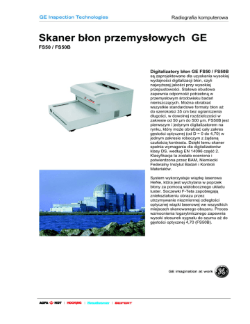Skaner błon przemysłowych GE FS50 / FS50B Digitalizatory błon GE FS50 / FS50B są zaprojektowane dla uzyskania wysokiej wydajności digitalizacji błon, czyli najwyższej jakości przy wysokiej przepustowości. Stalowa obudowa zapewnia odporność potrzebną w przemysłowym środowisku badań nieniszczących. Można obrabiać wszystkie standardowe formaty błon aż do szerokości 35 cm bez ograniczenia długości, w dowolnej rozdzielczości w zakresie od 50 µm do 500 µm. FS50B jest pierwszym i jedynym digitalizatorem na rynku, który może obrabiać cały zakres gęstości optycznej (od D = 0 do 4,70) w jednym zakresie roboczym z żądaną czułością kontrastu. Dzięki temu skaner spełnia wymagania dla digitalizatorów klasy DS. według EN 14096 część 2. Klasyfikacja ta została oceniona i potwierdzona przez BAM, Niemiecki Federalny Instytut Badań i Kontroli Materiałów. System wykorzystuje wiązkę laserowa HeNe, która jest wychylana w poprzek błony za pomocą wielobocznego układu luster. Soczewki F-Teta zapobiegają zniekształceniu obrazu przez utrzymywanie niezmiennej odległości optycznej wiązki laserowej we wszystkich miejscach skanowanego obszaru. Proces wzmocnienia logarytmicznego zapewnia wysoki stosunek sygnału do szumu aż do gęstości optycznej 4,70 (FS50B). Każdy skaner przed wysyłką jest wykalibrowany i scharakteryzowany, a ponadto z każdą maszyną dostarczana jest specyficzna dla przyrządu tablica przeglądowa (LUT). Zapewnia to niezakłócone skanowanie z możliwie najwyższą precyzją, powtarzalnością i prędkością. Błonę o wymiarach 14 x 17 cali można zdigitalizować w ciągu 7 sekund. Skanery serii FS50 są ekonomicznym rozwiązaniem digitalizacji błon do celów archiwacji, do łatwego przesyłania obrazu lub do wykorzystania zaawansowanych możliwości przeglądania systemu GE Inspection Technologies. Dane techniczne Źródło światła laser HeNe 632,8 nm Rozdzielczość skanowania 50 µm do 500 µm w krokach co 1 µm Zakres gęstości FS50 0,05 do 4,0 D Zakres gęstości FS50B 0,05 do 4,7 D Prędkość skanowania 14" x 17": 7 s (tryb Speed, 200 µm) 14" x 17": 120 s (tryb Quality, 50 µm) Głębokość piksela 12 bit (4096 poziomów szarości), logarytmiczna Wymiary błony szerokość min. 60 mm szerokość max. 355 mm Wymiary 526 x 764 x 330 mm Interfejs SCSI, SCSI II Moc 100 - 120 V, 200 - 240 V 50/60 Hz, 400 W Etykiety bezpieczeństwa CE, UL, GS Warunki robocze 15 - 30 °C, wilgotność 30 - 75 % Warunki składowania 10 - 40 °C, wilgotność 10 - 90 % Warunki transportu 10 - 50 °C, wilgotność 10 - 90 % Zastrzegamy sobie prawo do wprowadzania modyfikacji technicznych bez uprzedniego zawiadomienia. Digitalizator błon FS50 © 2004 General Electric Company. Wszelkie prawa zastrzeżone. GEIT-40010AE (7/04) NDT SYSTEM, 01-643 WARSZAWA, ul. Twardowskiego 21, tel. 022 8325030, fax. 022 8339677, www.ndt-system.com.pl