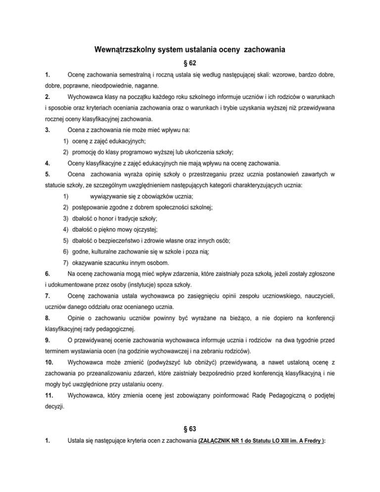 Wewnątrzszkolny system ustalania oceny zachowania § 62 1. Ocenę zachowania semestralną i roczną ustala się według następującej skali: wzorowe, bardzo dobre, dobre, poprawne, nieodpowiednie, naganne. 2. Wychowawca klasy na początku każdego roku szkolnego informuje uczniów i ich rodziców o warunkach i sposobie oraz kryteriach oceniania zachowania oraz o warunkach i trybie uzyskania wyższej niż przewidywana rocznej oceny klasyfikacyjnej zachowania. 3. Ocena z zachowania nie może mieć wpływu na: 1) ocenę z zajęć edukacyjnych; 2) promocję do klasy programowo wyższej lub ukończenia szkoły; 4. Oceny klasyfikacyjne z zajęć edukacyjnych nie mają wpływu na ocenę zachowania. 5. Ocena zachowania wyraża opinię szkoły o przestrzeganiu przez ucznia postanowień zawartych w statucie szkoły, ze szczególnym uwzględnieniem następujących kategorii charakteryzujących ucznia: 1) wywiązywanie się z obowiązków ucznia; 2) postępowanie zgodne z dobrem społeczności szkolnej; 3) dbałość o honor i tradycje szkoły; 4) dbałość o piękno mowy ojczystej; 5) dbałość o bezpieczeństwo i zdrowie własne oraz innych osób; 6) godne, kulturalne zachowanie się w szkole i poza nią; 7) okazywanie szacunku innym osobom. 6. Na ocenę zachowania mogą mieć wpływ zdarzenia, które zaistniały poza szkołą, jeżeli zostały zgłoszone i udokumentowane przez osoby (instytucje) spoza szkoły. 7. Ocenę zachowania ustala wychowawca po zasięgnięciu opinii zespołu uczniowskiego, nauczycieli, uczniów danego oddziału oraz ocenianego ucznia. 8. Opinie o zachowaniu uczniów powinny być wyrażane na bieżąco, a nie dopiero na konferencji klasyfikacyjnej rady pedagogicznej. 9. O przewidywanej ocenie zachowania wychowawca informuje ucznia i rodziców na dwa tygodnie przed terminem wystawiania ocen (na godzinie wychowawczej i na zebraniu rodziców). 10. Wychowawca może zmienić (podwyższyć lub obniżyć) przewidywaną, a nawet ustaloną ocenę z zachowania po przeanalizowaniu zdarzeń, które zaistniały bezpośrednio przed konferencją klasyfikacyjną i nie mogły być uwzględnione przy ustalaniu oceny. 11. Wychowawca, który zmienia ocenę jest zobowiązany poinformować Radę Pedagogiczną o podjętej decyzji. § 63 1. Ustala się następujące kryteria ocen z zachowania (ZAŁĄCZNIK NR 1 do Statutu LO XIII im. A Fredry ): 1) Ocena z zachowania jest wystawiana systemem punktowym. a) Na początku każdego semestru uczeń otrzymuje 100 punktów, co odpowiada ocenie wyjściowej dobrej. b) W ciągu semestru uczeń może otrzymać punkty dodatnie: c) w ciągu semestru uczeń może otrzymać punkty ujemne : d) Przeliczanie punktów na oceny: 2) W szczególnych, uzasadnionych (indywidualnych) przypadkach stosuje się przepisy statutu szkolnego §66. 3) 2. Roczna ocena zachowania uwzględnia ocenę z pierwszego i drugiego semestru. W przypadku wyjątkowo drastycznych wykroczeń (np. kradzież, pobicia, stan wskazujący na spożycie alkoholu podczas pobytu w szkole i na imprezach przez nią organizowanych, dewastacja mienia powodująca trwałe straty materialne, dezorganizacja pracy szkoły), uczniowi można wystawić ocenę naganną, również wtedy, gdy był on pod innym względem wzorowy. 3. Zasady usprawiedliwiania nieobecności ucznia w szkole: 1) usprawiedliwianie nieobecności uczniów jest obowiązkiem rodziców, 2) uczniowie pełnoletni mają prawo samodzielnie usprawiedliwiać swoje nieobecności w szkole, 3) usprawiedliwienie musi mieć formę pisemną; rodzice (opiekunowie prawni), a także pełnoletni uczniowie zobowiązani są do podana w nim przyczyny nieobecności. 4) uczeń lub rodzic (opiekun prawny) dostarcza usprawiedliwienie nie później niż 5 dni po powrocie ucznia do szkoły; 5) wychowawca nie ma obowiązku honorowania usprawiedliwień dostarczanych po tym terminie. W takim przypadku nieobecność ucznia będzie traktowana jako nieusprawiedliwiona 6) spóźnienia na lekcje – powyżej 15 minut uznaje się za nieobecność ucznia na tej lekcji; 7) w przypadku przewidywanej dłuższej niż 5 dni roboczych nieobecności ucznia w szkole rodzice są zobowiązani poinformować o tym szkołę; 8) w przypadku usprawiedliwień budzących wątpliwości szkoła ma prawo porozumieć się z rodzicami ucznia.; 9) uczeń nie ma prawa samowolnie opuszczać zajęć dydaktycznych w czasie ich trwania, ani oddalać się z terenu szkoły.; 10) wychowawca zwalnia ucznia z zajęć w danym dniu tylko na podstawie pisemnej i umotywowanej prośby rodzica (opiekuna prawnego) lub pełnoletniego ucznia. 11) uczeń lub jego rodzice (prawni opiekunowie) mają prawo do usprawiedliwienia zajęć z powodu losowych sytuacji. Takich usprawiedliwień uczeń może mieć 5 (pięć) w ciągu każdego semestru 4. Nieprzystąpienie ucznia do egzaminu: 1) maturalnego; 2) klasyfikacyjnego; 3) może poprawkowego. być usprawiedliwione tylko na podstawie zaświadczenia lekarskiego złożonego u dyrektora szkoły, najpóźniej w dniu egzaminu. 5. 6. Nieusprawiedliwione nieobecności mają wpływ na: 1) obniżenie oceny z zachowania; 2) decyzję o przeprowadzeniu egzaminu klasyfikacyjnego; 3) postępowanie dyscyplinarne prowadzące do skreślenia z listy uczniów. Tryb podwyższania oceny z zachowania 1) Jeżeli proponowana przez wychowawcę ocena roczna (semestralna) z zachowania jest zdaniem ucznia zaniżona, to może on ubiegać się o jej podwyższenie o jeden stopień wyżej. 2) Uczeń występuje z pisemnym wnioskiem do pedagoga lub psychologa szkoły. 3) Wniosek musi zawierać argumenty uzasadniające konieczność zmiany. 4) Pedagog lub psycholog powołuje komisję w składzie: a) pedagog szkoły (lub psycholog), b) wychowawca klasy, c) drugi wychowawca, d) przewodniczący klasy (lub inny przedstawiciel samorządu klasy, do której uczęszcza uczeń). 5) Komisja analizuje odwołanie ucznia i wydaje ostateczna decyzję. 6) W razie rozbieżności co do oceny decyduje większość głosów komisji