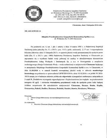 Państwowy Powiatowy Inspektor Sanitarny ul. Bolesława Chrobrego 27, 73-200 Choszcznie tel. (95) 765 72 82, fax (95) 765 00 85 N!P: 594-12-31-622, REGON: 000586879 e-mail: [email protected] Choszczno, dnia 3 listopada 2016 roku HK1.4402.KW133.16 Miejskie Przedsiębiorstwo Gospodarki Komunalnej Spółka z o.o. ul. Wohiości 26, 73-200 Choszczno Na podstawie art. 4, ust. l pkt l ustawy z dnia 14 marca 1985 r. o Państwowej Inspekcji Sanitarnej (tekst jednolity Dz. U. z 2015 r. póz. 1412 z późn. zmianami), § 17 ust. l rozporządzenia M-inistra Zdrowia z dnia 13 listopada 2015 r. w sprawie jakości wody przeznaczonej do spożycia przez ludzi (Dz. U. z 2015 r. póz. 1989) Państwowy Powiatowy Inspektor Sanitarny w Choszcznie po zapoznaniu się z wynikami badań wody pobranej do analizy w akredytowanym laboratorium Przedsiębiorstwa Usług Wodnych i Sanitarnych Sp. z o.o. w Nowogardzie z urządzenia wodociągowego (Stacja Uzdatniania Wody - woda uzdatonio&a) w miejscowości Choszczno będącego w zarządzaniu Miejskiego Przedsiębiorstwa Gospodarki Komunahiej Spółki z o.o. w Choszcznie, w dniu 11.10.2016 r. w ramach kontroli wewnętrznej jakości wody w zakresie monitoringu kontrolnego na podstawie nr sprawozdania LBAW2810/2016 z dnia 18.10.2016 r. nr próbki W 281010/16 uznaje, że w badanym zakresie próbka nie odpowiada wymaganiom sanitarnym z załącznika nr 3 część B „Dodatkowe wymagania organoleptyczne i fizykochemiczne (ze względu na przekroczenie manganu 68 p,g/l) i stwierdza warunkową przydatność wody do spożycia przez ludzi będącej źródłem zaopatrzenia dla mieszkańców miejscowości Choszczno, Baczyn, Bonin, Koplin, Oraczewice, Pakość, Radlice, Roztocze, Rudniki, Smoleń, Stawia, Sfradzewo, Witoszyn. t U;'friLJ^-*^y j \.^';;it.:,ivv\- Otrzymują.: l. Adresat (drogą elektroniczną: [email protected]) 2. a/a Do wiadomości; l. Burmistrz Choszczna (drogą elektroniczną: [email protected]) <'i-n—T-T^';i.f 7 •';');•'..'A' aoeL.jaiisT.s .'rjrowj.s plii:)!i"'nfr;(i.-
