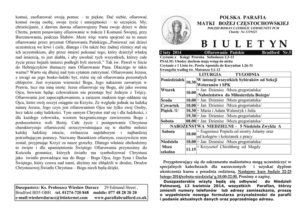 komuś, zaofiarować swoją pomoc – to piękne. Dać siebie, ofiarować komuś swoją osobę, swoje życie i umiejętności – to szczęście. My, chrześcijanie, z dawien dawna ofiarowujemy Panu swoje dzieci w dniu Chrztu, potem ponawiamy ofiarowanie w trakcie I Komunii Świętej, przy Bierzmowaniu, podczas Ślubów. Może więc warto spojrzeć na to nasze ofiarowanie przez pryzmat Ofiarowania Pańskiego.„Ponieważ zaś dzieci uczestniczą we krwi i ciele, dlatego i On także bez żadnej różnicy stał się ich uczestnikiem, aby przez śmierć pokonać tego, który dzierżył władzę nad śmiercią, to jest diabła, i aby uwolnić tych wszystkich, którzy całe życie przez bojaźń śmierci podlegli byli niewoli.” Tak św. Paweł w liście do Hebrajczyków tłumaczy nam Ofiarowanie Pana. Dlaczego to takie ważne? Warto się dłużej nad tym cytatem zatrzymać. Ofiarowanie Jezusa, z uwagi na jego bosko-ludzki byt, różni się od ofiarowania pozostałych chłopców. Jest wyrazem wierności Bogu, Jego nakazom zawartym w Prawie, lecz ma inną istotę: Jezus ofiarowuje się Bogu, ale jako swemu Ojcu, bowiem będąc człowiekiem nie przestaje być Jednym z Trójcy. Ofiarowanie jest zapoczątkowaniem, a zarazem znakiem tego oddania się Ojcu, które swój szczyt osiągnie na Krzyżu. Ze względu jednak na ludzką naturę Jezusa, Jego czyn jest ofiarowaniem Ojcu nie tylko swej Osoby, lecz także całej ludzkości. Tym samym Chrystus stał się i dla ludzkości, i dla każdego człowieka, wzorem bezgranicznego zawierzenia Bogu i posłuszeństwa woli Bożej. Całe życie i postępowanie Chrystusa charakteryzuje ofiarniczość urzeczywistniająca się w służbie miłości każdej ludzkiej istocie, zwłaszcza najsłabszym i najbardziej potrzebującym pomocy. Nazwany Barankiem ofiarnym, rzeczywiście nim został, przyjmując Krzyż za nasze grzechy. Dlatego właśnie obchodzimy to święto i dla upamiętnienia Świętego Ofiarowania przynosimy do Kościoła gromnice, których światło ma symbolizować Chrystusa jako światło prowadzące nas do Boga – Boga Ojca, Jego Syna i Ducha Świętego, który czuwa nad nami, abyśmy nie zbłądzili w drodze, Drodze Chrystusowej.Światło Chrystusa – Bogu niech będą dzięki. Duszpasterz: Ks. Proboszcz Wiesław Duracz 29 Edmund Street , Bradford BD5 OBH tel. 01274-720 848 mobile: 077 48 28 20 20 e-mail:[email protected] www.parafiabradford.co.uk POLSKA PARAFIA MATKI BOŻEJ CZĘSTOCHOWSKIEJ POLISH ROMAN CATHOLIC COMMUNITY PCM Charity No 1119423 B I U L E T YN 2 luty 2014 Ofiarowanie Pańskie Bradford Nr.5 Czytanie z Księgi Proroka Sofoniasza 2,3-13 PSALM: Ubodzy duchem mają wstęp do nieba Czytanie z 1 Listu św. Pawła Apostoła do Koryntian 1,26-31 Ewangelia według św. Mateusza 5,1-12 LITURGIA TYGODNIA W intencji wszystkich Sybiraków od Sekcji 10.30 Weteranów i SPK + Jan Dzienisz /Msza gregoriańska/ Wtorek 10.00 /Nabożeństwo do Miłosierdzia Bożego/ Środa 10.00 + Jan Dzienisz /Msza gregoriańska/ Czwartek 10.00 + Jan Dzienisz /Msza gregoriańska/ Piątek /1/ 10.30 + Maria i Adam Walenżyk i Julia 19.30 + Jan Dzienisz /Msza gregoriańska/ Sobota 08.00 + Jan Dzienisz /Msza gregoriańska/ NABOŻEŃSTWA NIEDZIELNE - 5 Niedziela Zwykła A + Eugeniusz Popiela od siostry Jolanty oraz Sobota 18.00 od kolegów i koleżanek z pracy Niedziela 10.00 + Jan Dzienisz /Msza gregoriańska/ Msza + Krzysztof Chirshberg od Magdy 11.15 szkolna Poniedziałek Przygotowujący się do sakramentu małżeństwa mogą uczestniczyć w specjalnych katechezach dla narzeczonych i uzyskać dyplom ukończenia kursu z poradnia rodzinną. Następny kurs będzie 22-23 lutego 2014/sobota-niedziela/ g.18.00-22.00. Prosimy o zapisy. Duszpasterskie wizyty będą się odbywać do Niedzieli Palmowej, 12 kwietnia 2014, wszystkich Parafian, którzy zmienili numery telefonów lub adresy zamieszkania, proszę o wypełnienie nowego formularza przynależności do parafii i podanie aktualnych danych oraz poprzedniego adresu. Lektorzy - Sobota 08.02.2014 g.18.00 - J. Bąk Niedziela 09.02.2014 g. 10.00 - J. Salamon g.11.15 - P. Szkoła Dyżur przedstawiciela PRD Sali św. Brata Alberta, sobota i niedziela 08-09.02.2014 – G.Wolny i A.Andryszewski OFIARY Na potrzeby parafii – T.Tyszka £20;R.J.Gębka £20;E.Jaskot £20; S.Kollath £20; M.Piaścik £30;T.Flammer £20;W.Celebański £20; W.Mercer £10;M.Skowrońska £20;H.Milbrodt £10;Z.Mozel £10;A.Klima £20;M.E.Kączkowscy £30; Bezim. £20;S.Błasińska £20;Bezim. £10. Na kwiaty – M.Piaścik £20; Bezim. £20;S.Błasińska £10;Bezim. £10. Taca dla parafii – 26.01.2014 - £ 358.97 Gift Aid 22.12.2013 - £ 85.50 Jeżeli ktoś z Parafian pragnie złożyć ofiarę czekiem/na dowolny cel parafialny/, prosimy go wypisać na –P.C.M. BRADFORD. Wszystkim ofiarodawcom składamy serdeczne podziękowanie za złożone ofiary na nasze cele parafialne. Bóg zapłać. *** OGŁOSZENIA DUSZPASTERSKIE *** Dzisiaj podczas Mszy będzie poświecenie gromnic. 1. Dzisiejsze święto Ofiarowania Pańskiego przenosi nas ponownie w klimat Narodzenia Pańskiego. Mamy okazję raz jeszcze spotkać się z naszym Zbawicielem, który przychodzi w postaci Dziecka, aby wybawić nas od panowania grzechu i zła. 2. Z woli papieża Jana Pawła II od 1997 roku w to święto w Kościele powszechnym obchodzony jest Dzień Życia Konsekrowanego, poświęcony modlitwie za osoby, które oddały swoje życie na służbę Bogu i ludziom w niezliczonych zakonach, zgromadzeniach i instytutach świeckich. Pamiętajmy o nich w naszych modlitwach. W TYM TYGODNIU PATRONUJĄ NAM: *5 II – św. Agata, dziewica i męczennica, szczególna patronka Sycylii we Włoszech; ze względu na swoje męczeństwo, podczas którego odcięto jej piersi, może też być wzywana jako wspomożycielka kobiet karmiących i tych, które zmagają się z chorobami piersi. *6 II – św. Paweł Mika i jego Towarzysze, pierwsi męczennicy japońscy z XVI wieku. ! Drodzy Kombatanci, osoby repres