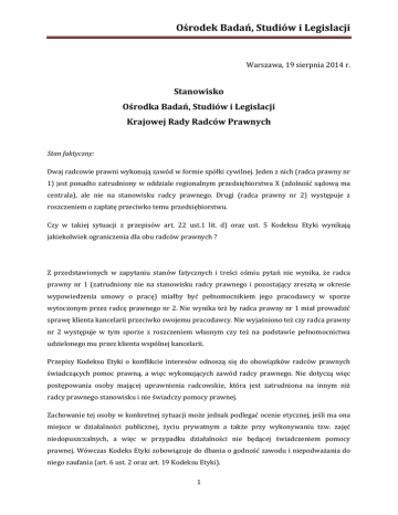Ośrodek Badań, Studiów i Legislacji Warszawa, 19 sierpnia 2014 r. Stanowisko Ośrodka Badań, Studiów i Legislacji Krajowej Rady Radców Prawnych Stan faktyczny: Dwaj radcowie prawni wykonują zawód w formie spółki cywilnej. Jeden z nich (radca prawny nr 1) jest ponadto zatrudniony w oddziale regionalnym przedsiębiorstwa X (zdolność sądową ma centrala), ale nie na stanowisku radcy prawnego. Drugi (radca prawny nr 2) występuje z roszczeniem o zapłatę przeciwko temu przedsiębiorstwu. Czy w takiej sytuacji z przepisów art. 22 ust.1 lit. d) oraz ust. 5 Kodeksu Etyki wynikają jakiekolwiek ograniczenia dla obu radców prawnych ? Z przedstawionych w zapytaniu stanów fatycznych i treści ośmiu pytań nie wynika, że radca prawny nr 1 (zatrudniony nie na stanowisku radcy prawnego i pozostający zresztą w okresie wypowiedzenia umowy o pracę) miałby być pełnomocnikiem jego pracodawcy w sporze wytoczonym przez radcę prawnego nr 2. Nie wynika też by radca prawny nr 1 miał prowadzić sprawę klienta kancelarii przeciwko swojemu pracodawcy. Nie wyjaśniono też czy radca prawny nr 2 występuje w tym sporze z roszczeniem własnym czy też na podstawie pełnomocnictwa udzielonego mu przez klienta wspólnej kancelarii. Przepisy Kodeksu Etyki o konflikcie interesów odnoszą się do obowiązków radców prawnych świadczących pomoc prawną, a więc wykonujących zawód radcy prawnego. Nie dotyczą więc postępowania osoby mającej uprawnienia radcowskie, która jest zatrudniona na innym niż radcy prawnego stanowisku i nie świadczy pomocy prawnej. Zachowanie tej osoby w konkretnej sytuacji może jednak podlegać ocenie etycznej, jeśli ma ona miejsce w działalności publicznej, życiu prywatnym a także przy wykonywaniu tzw. zajęć niedopuszczalnych, a więc w przypadku działalności nie będącej świadczeniem pomocy prawnej. Wówczas Kodeks Etyki zobowiązuje do dbania o godność zawodu i niepodważania do niego zaufania (art. 6 ust. 2 oraz art. 19 Kodeksu Etyki). 1 Ośrodek Badań, Studiów i Legislacji Jeśliby jednak przyjąć, że wątpliwości etyczne przedstawione w pytaniach odnoszą się do sytuacji w której klient kancelarii prowadzonej przez obu radców prawnych wytacza spór pracodawcy radcy prawnego nr 1 – należałoby zająć następujące stanowisko: radca prawny nr 1 nie powinien świadczyć pomocy prawnej takiemu klientowi dopóki pozostaje w nieradcowskim stosunku pracy z drugą stroną sporu. Przepis art. 22 ust 1 lit d) Kodeksu Etyki zakazuje prowadzenia sprawy, jeśli radca prawny „był albo pozostaje w bliskich stosunkach z przeciwnikiem swojego mocodawcy lub osobą zainteresowaną w niekorzystnym dla niego rozstrzygnięciu sprawy”. Oznacza to, iż radca prawny zobowiązany jest chronić swoją niezależność, która jest podstawową wartością zawodu, a więc nie ulegać wpływom i naciskom zewnętrznym (art. 7 i 11 Kodeksu Etyki). Użyte w tym przepisie określenie „bliskie stosunki” jest więc szersze niż krąg osób najbliższych wskazanych w art. 115 par. 11 Kodeksu Karnego. Również przepis art. 15 ustawy o radcach prawnych nakazuje wyłączyć się od wykonywania czynności zawodowych jeśli sprawa dotyczy osoby z którą radca prawny pozostaje w takim stosunku, że może to oddziaływać na wynik sprawy. W orzecznictwie Sądu Najwyższego uznano za „osobę bliską” osobę pozostającą w zależności majątkowej, rodzinnej, towarzyskiej, uczuciowej i wszelkiej innej która mogła by wpłynąć na sposób prowadzenia sprawy; radca prawny nr 2 przyjmując od klienta zlecenie prowadzenia sprawy, przeciwko przedsiębiorcy będącemu pracodawcą radcy prawnego nr 1 nie narusza wprost zakazu zawartego w art. 22 ust 5 Kodeksu Etyki. Przepis ten stanowiąc o tzw. przypisaniu konfliktu interesów odnosi się bowiem do sytuacji w której spółka prawnicza ma prowadzić tę samą lub związane ze sobą sprawy klientów, a przyjęte obowiązki stałyby ze sobą w sprzeczności lub istniało znaczące ryzyko takiej sprzeczności. Wówczas przyjęcie takich spraw przez jednego z radców prawnych tej spółki naruszałoby nakaz unikania konfliktu interesów. Omawiany przepis rozszerza ten nakaz na wszystkich radców prawnych tej spółki, a więc również na tych, którzy nie byli zaangażowani w prowadzenie sprawy. Jeśli więc założyć, że rada prawny nr 1 dochował obowiązków pracowniczych (w szczególności odnoszących się tajemnicy przedsiębiorstwa i lojalności wobec pracodawcy) i nie „przeniósł” do spółki prawniczej wiedzy o sprawach swojego pracodawcy to omawiany przepis nie zakazuje przyjęcia sprawy przez radcę prawnego nr 2. 2 Ośrodek Badań, Studiów i Legislacji Obaj radcowie powinni jednak wziąć pod uwagę wymowę wizerunkową takiego działania- niekorzystną dla zawodu radcy prawnego. Wystąpienie radcy prawnego nr 1 ze spółki miałoby tu znaczenie jedynie w odniesieniu do zleceń przyjmowanych przez radcę prawnego nr 2 po takim wystąpieniu. Opracował Zenon Klatka 3