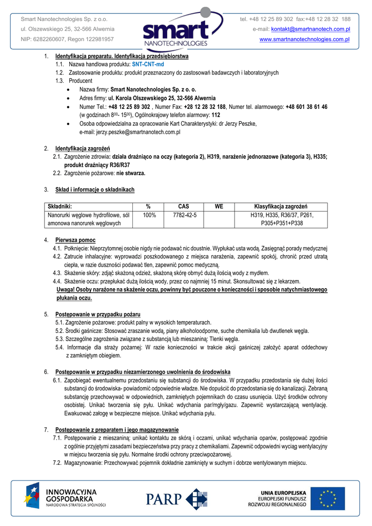 Smart Nanotechnologies Sp. z o.o. tel. +48 12 25 89 302 fax:+48 12 28 32 188 ul. Olszewskiego 25, 32-566 Alwernia e-mail: [email protected] NIP: 6282260607, Regon 122981957 www.smartnanotechnologies.com.pl 1. Identyfikacja preparatu. Identyfikacja przedsiębiorstwa 1.1. Nazwa handlowa produktu: SNT-CNT-md 1.2. Zastosowanie produktu: produkt przeznaczony do zastosowań badawczych i laboratoryjnych 1.3. Producent Nazwa firmy: Smart Nanotechnologies Sp. z o. o. Adres firmy: ul. Karola Olszewskiego 25, 32-566 Alwernia Numer Tel.: +48 12 25 89 302 , Numer Fax: +28 12 28 32 188, Numer tel. alarmowego: +48 601 38 61 46 (w godzinach 800- 1500), Ogólnokrajowy telefon alarmowy: 112 Osoba odpowiedzialna za opracowanie Kart Charakterystyki: dr Jerzy Peszke, e-mail: [email protected] 2. Identyfikacja zagrożeń 2.1. Zagrożenie zdrowia: działa drażniąco na oczy (kategoria 2), H319, narażenie jednorazowe (kategoria 3), H335; produkt drażniący R36/R37 2.2. Zagrożenie pożarowe: nie stwarza. 3. Skład i informacje o składnikach Składniki: Nanorurki węglowe hydrofilowe, sól amonowa nanorurek węglowych % 100% CAS 7782-42-5 WE Klasyfikacja zagrożeń H319, H335, R36/37, P261, P305+P351+P338 4. Pierwsza pomoc 4.1. Połknięcie: Nieprzytomnej osobie nigdy nie podawać nic doustnie. Wypłukać usta wodą. Zasięgnąć porady medycznej 4.2. Zatrucie inhalacyjne: wyprowadzi poszkodowanego z miejsca narażenia, zapewnić spokój, chronić przed utratą ciepła, w razie duszności podawać tlen, zapewnić pomoc medyczną. 4.3. Skażenie skóry: zdjąć skażoną odzież, skażoną skórę obmyć dużą ilością wody z mydłem. 4.4. Skażenie oczu: przepłukać dużą ilością wody, przez co najmniej 15 minut. Skonsultować się z lekarzem. Uwaga! Osoby narażone na skażenie oczu, powinny być pouczone o konieczności i sposobie natychmiastowego płukania oczu. 5. Postępowanie w przypadku pożaru 5.1. Zagrożenie pożarowe: produkt palny w wysokich temperaturach. 5.2. Środki gaśnicze: Stosować zraszanie wodą, piany alkoholoodporne, suche chemikalia lub dwutlenek węgla. 5.3. Szczególne zagrożenia związane z substancją lub mieszaniną: Tlenki węgla. 5.4. Informacje dla straży pożarnej: W razie konieczności w trakcie akcji gaśniczej założyć aparat oddechowy z zamkniętym obiegiem. 6. Postępowanie w przypadku niezamierzonego uwolnienia do środowiska 6.1. Zapobiegać ewentualnemu przedostaniu się substancji do środowiska. W przypadku przedostania się dużej ilości substancji do środowiska- powiadomić odpowiednie władze. Nie dopuścić do przedostania się do kanalizacji. Zebraną substancję przechowywać w odpowiednich, zamkniętych pojemnikach do czasu usunięcia. Użyć środków ochrony osobistej. Unikać tworzenia się pyłu. Unikać wdychania par/mgły/gazu. Zapewnić wystarczającą wentylację. Ewakuować załogę w bezpieczne miejsce. Unikać wdychania pyłu. 7. Postępowanie z preparatem i jego magazynowanie 7.1. Postępowanie z mieszaniną: unikać kontaktu ze skórą i oczami, unikać wdychania oparów, postępować zgodnie z ogólnie przyjętymi zasadami bezpieczeństwa przy pracy z chemikaliami. Zapewnić odpowiedni wyciąg wentylacyjny w miejscu tworzenia się pyłu. Normalne środki ochrony przeciwpożarowej. 7.2. Magazynowanie: Przechowywać pojemnik dokładnie zamknięty w suchym i dobrze wentylowanym miejscu. Smart Nanotechnologies Sp. z o.o. tel. +48 12 25 89 302 fax:+48 12 28 32 188 ul. Olszewskiego 25, 32-566 Alwernia e-mail: [email protected] NIP: 6282260607, Regon 122981957 www.smartnanotechnologies.com.pl 8. 9. Kontrola narażenia i środki ochrony indywidualnej 8.1. Parametry dotyczące kontroli Elementy urządzeń kontrolnych w miejscu pracy: Nie zawiera substancji mających wartości stężeń dopuszczalnych w środowisku pracy. 8.2. Kontrola narażenia Stosowne techniczne środki kontroli: Stosować zgodnie z zasadami bezpieczeństwa i higieny pracy. Myć ręce przed posiłkami i po zakończeniu pracy. Środki ochrony indywidualnej: Ochrona oczu lub twarzy: okulary ochronne z bocznymi osłonami zgodne z EN 166 Do ochrony oczu stosować sprzęt atestowany zgodnie z odpowiednimi normami takimi jak NIOSH (USA) lub EN 166 (WE). Ochrona skóry: Pracować z tym produktem stosując rękawice. Rękawice powinny zostać poddane przeglądowi przed użyciem. Stosować właściwą technikę usuwania rękawic (bez dotykania zewnętrznej powierzchni rękawicy) aby uniknąć kontaktu skóry z tym produktem. Usuwanie zanieczyszczonych rękawic po użyciu zgodnie z odpowiednimi przepisami i dobrą praktyką laboratoryjną. Umyć i wysuszyć ręce. Wybrane rękawice ochronne muszą spełniać specyfikację dyrektywy 89/686/EWG i normy pochodnej EN 374. Ochrona ciała: ubranie nieprzepuszczalne, Rodzaj wyposażenia ochronnego musi być dobrany odpowiednio do stężenia i ilości niebezpiecznej substancji w konkretnym środowisku pracy. Ochrona dróg oddechowych: Przy narażeniu na uciążliwy pył stosować maskę z filtrem cząstek typu P95 (USA) lub typu P1 (WE EN 143). Dla wyższego poziomu ochrony stosować maski z wkładami typu OV/AG/P99 (USA) lub typu ABEK-P2 (WE EN 143). Używać maski testowanej i odpowiadającej odpowiednim normom. Kontrola narażenia środowiska Nie dopuścić do przedostania się do kanalizacji. Właściwości fizyczne i chemiczne Stan skupienia w temp. 20˚C Kolor Zapach proszek czarny nie dotyczy Gęstość [g/cm3] w temp. 20˚C Lepkość [mPa s] w temp. 20˚C Temp. zapłonu [˚C] Temp. samozapłonu [˚C] 1,9-2,2 g/cm3 brak danych nie dotyczy nie dotyczy Górna granica wybuchowości [% V/V] Dolna granica wybuchowości [% V/V] Prężność par [hPa] w 180˚C nie dotyczy nie dotyczy nie dotyczy Współczynnik załamania światła Rozpuszczalność w wodzie Rozpuszczalność w rozp. organicznych brak danych dobra etanol Palność Właściwości utleniające Właściwości wybuchowe Palny w wysokich temperaturach nie stwierdzono nie dotyczy