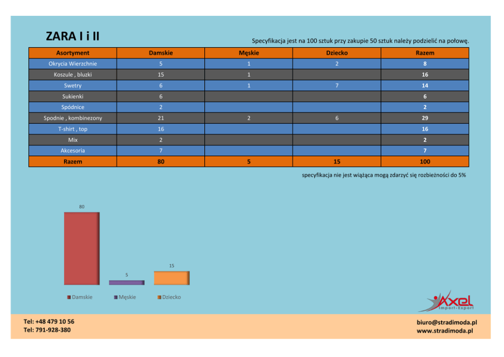 ZARA I i II Specyfikacja jest na 100 sztuk przy zakupie 50 sztuk należy podzielić na połowę. Asortyment Damskie Męskie Dziecko Razem Okrycia Wierzchnie 5 1 2 8 Koszule , bluzki 15 1 Swetry 6 1 Sukienki 6 6 Spódnice 2 2 Spodnie , kombinezony 21 T-shirt , top 16 16 Mix 2 2 Akcesoria 7 7 Razem 80 2 5 16 7 6 15 14 29 100 specyfikacja nie jest wiążąca mogą zdarzyć się rozbieżności do 5% 80 15 5 Damskie Tel: +48 479 10 56 Tel: 791-928-380 Męskie Dziecko [email protected] www.stradimoda.pl